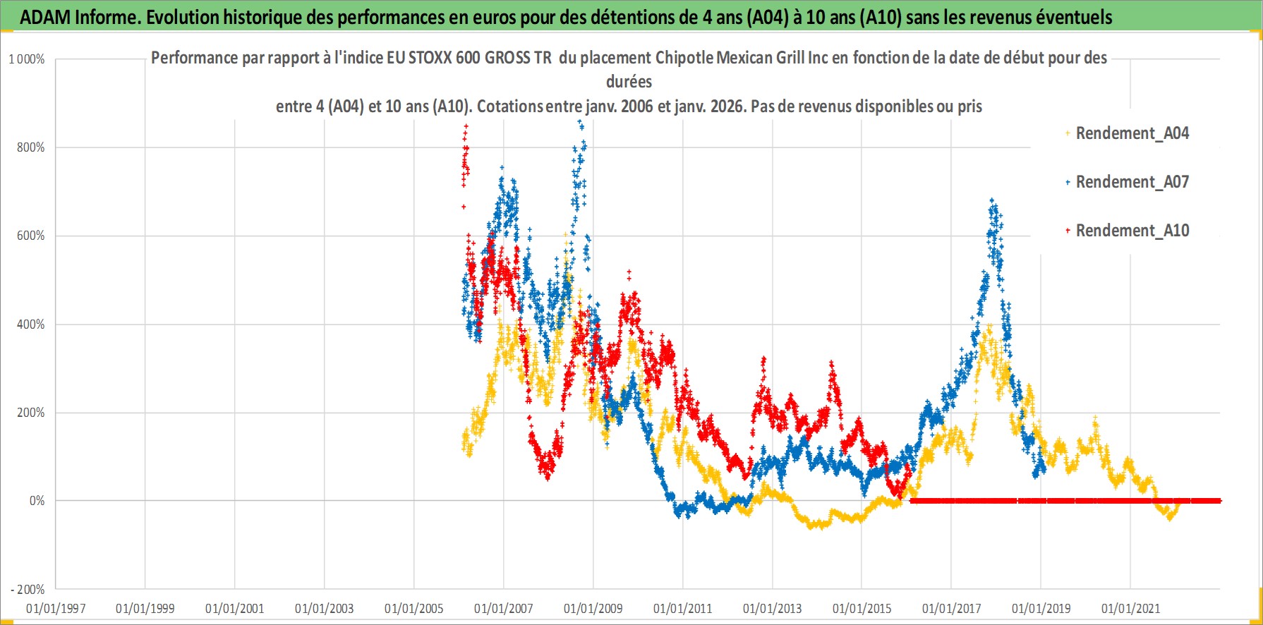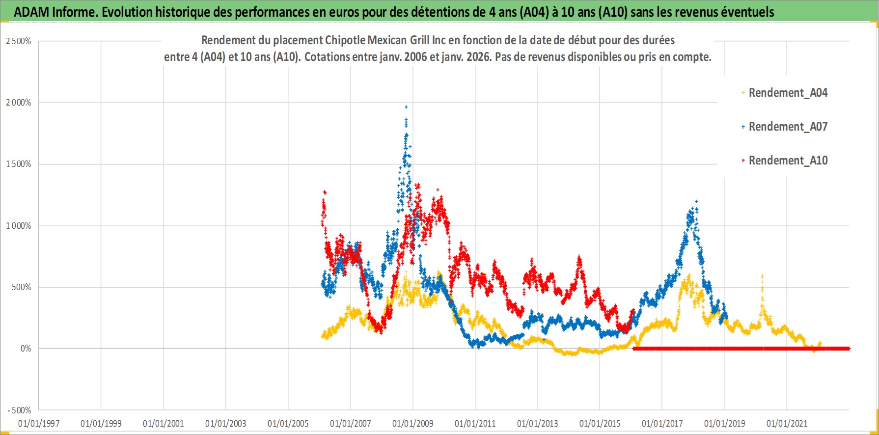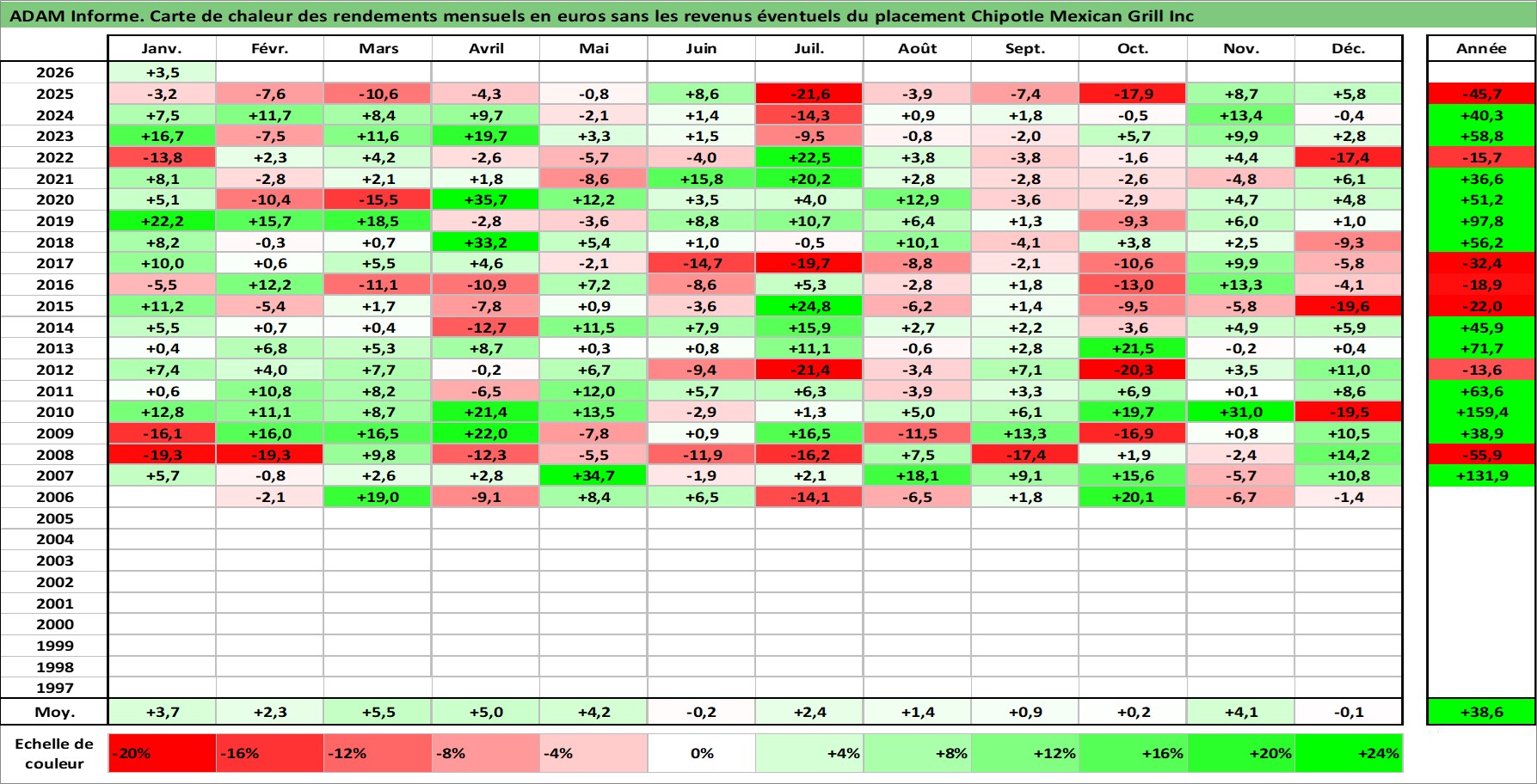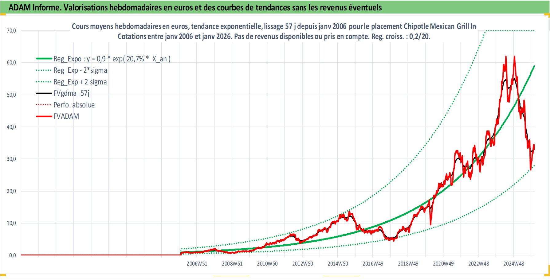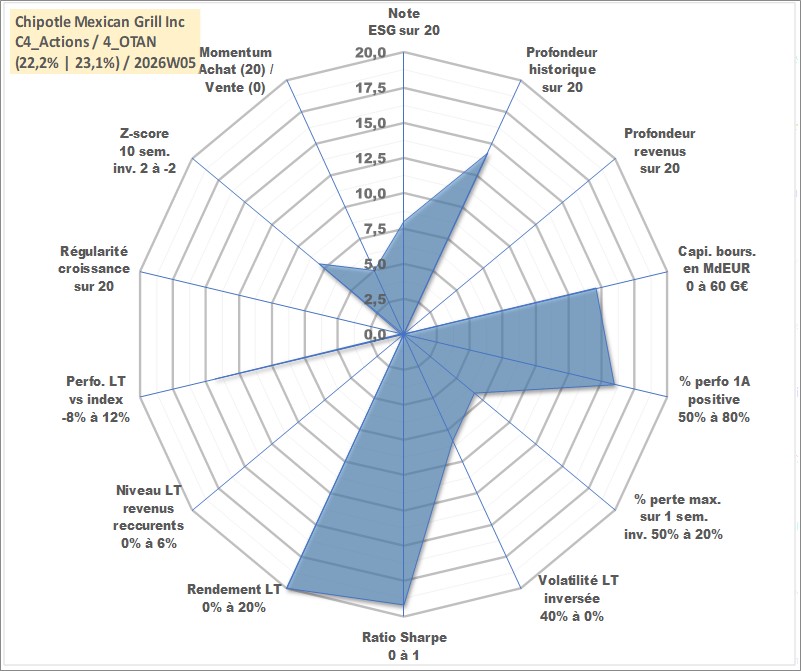 Site dédié aux investisseursPage dédiée sur site financeAnalyse des valorisations hebdomadaires de l'action Chipotle Mexican Grill Inc. Cet actif est cote en USD. Les valorisations sont en contrevaleur EURO et couvrent les semaines 2006W04 a 2026W05. Les revenus de cet actif financier ne sont pas connus car non existants ou non disponibles sur le site Yahoo Finance. La note globale ESG de cet actif est estimee a 8.0 (apres rebasage entre 0 et 20).