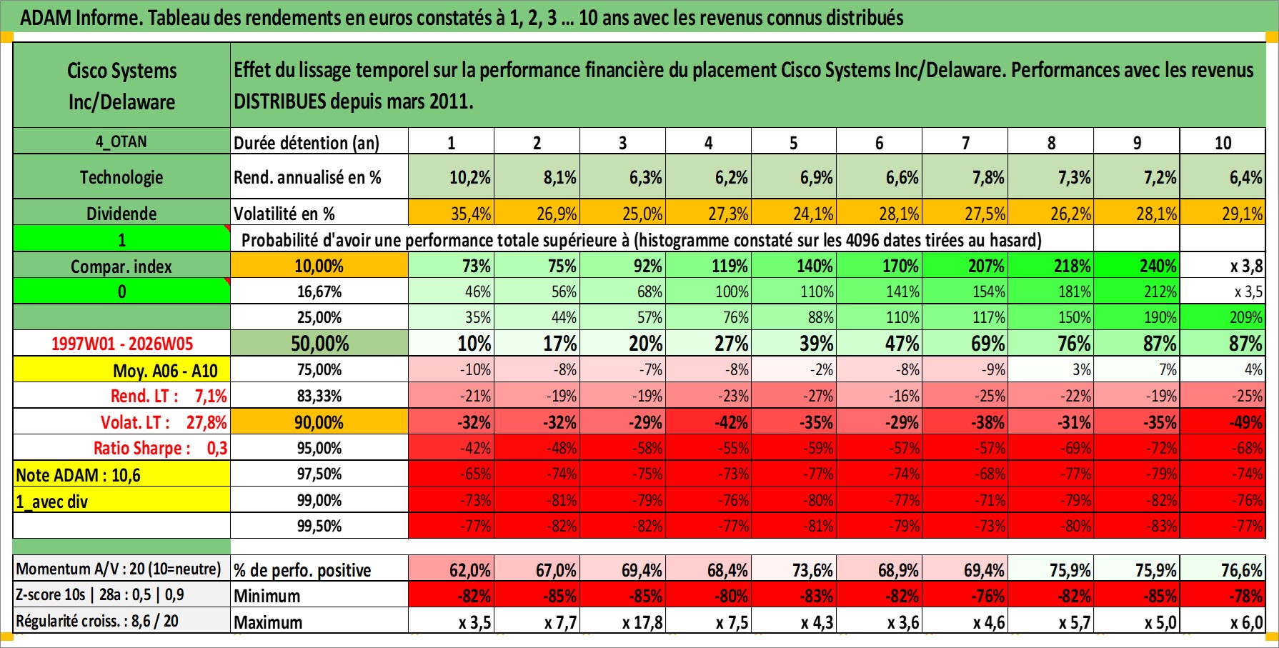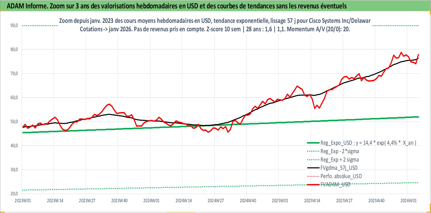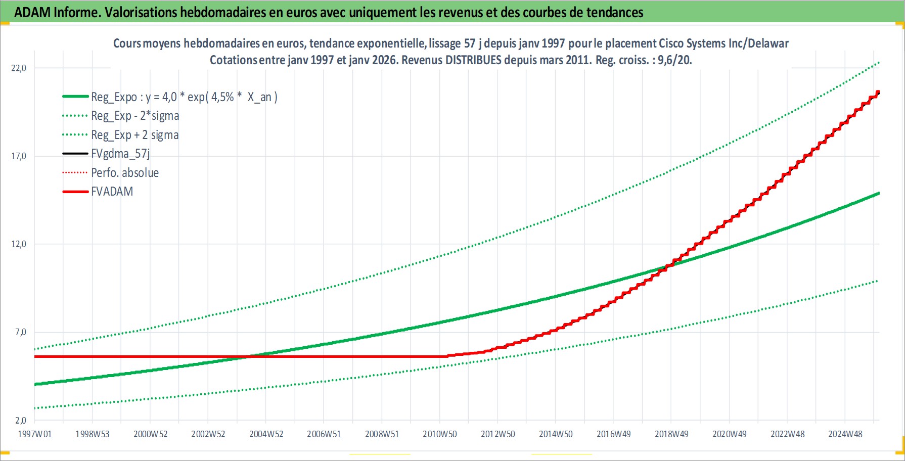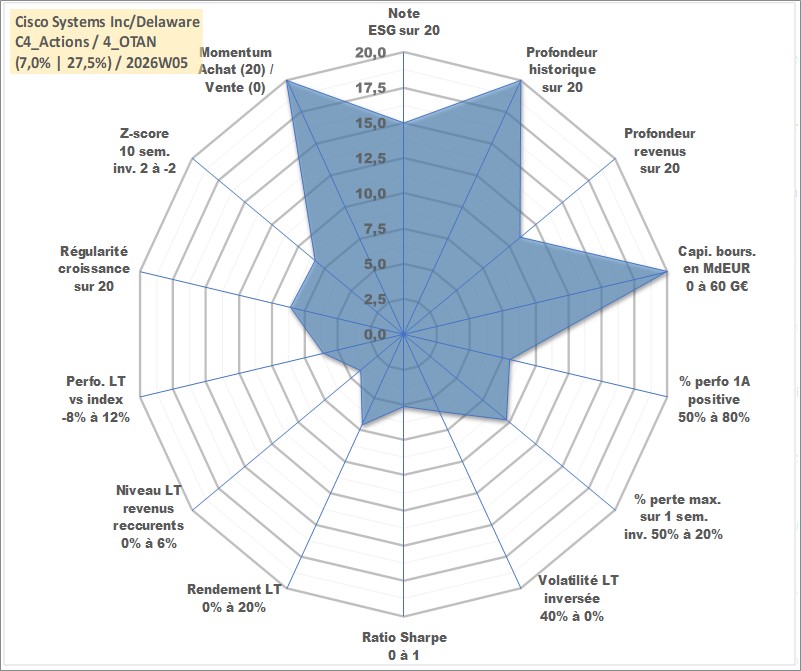 Site dédié aux investisseursPage dédiée sur site financeAnalyse des valorisations hebdomadaires de l'action Cisco Systems Inc/Delaware. Cet actif est cote en USD. Les valorisations sont en contrevaleur EURO et couvrent les semaines 1997W01 a 2026W05. Les revenus de cet actif financier sont pris en compte depuis la semaine 2011W13. La note globale ESG de cet actif est estimee a 15.0 (apres rebasage entre 0 et 20).