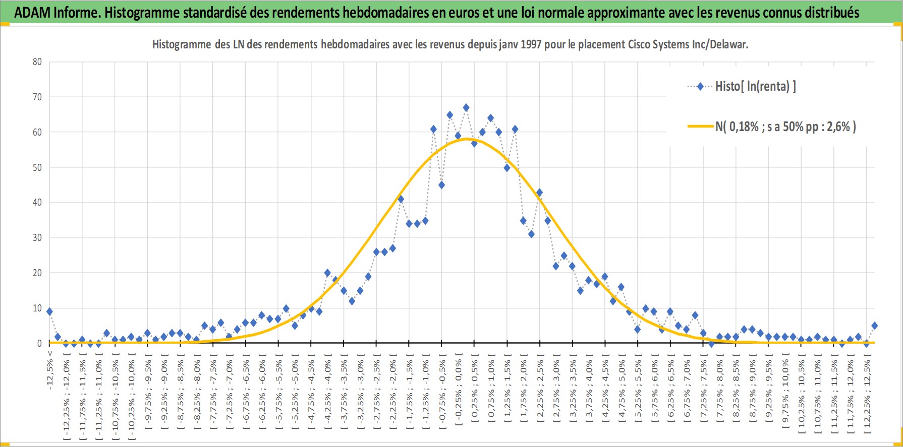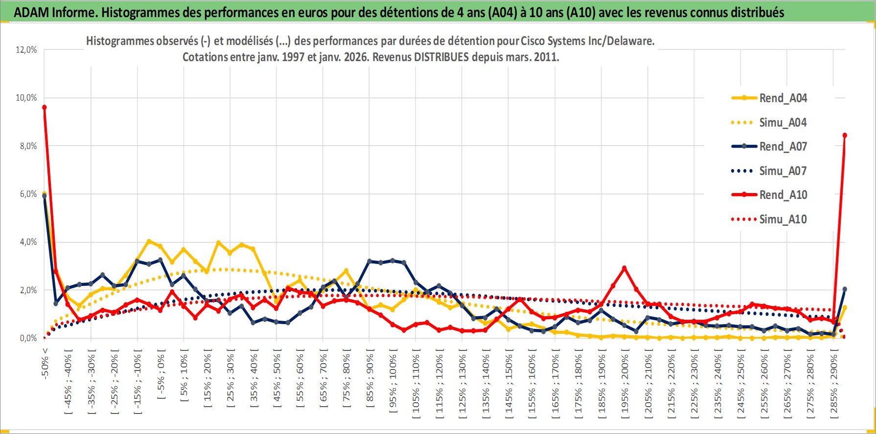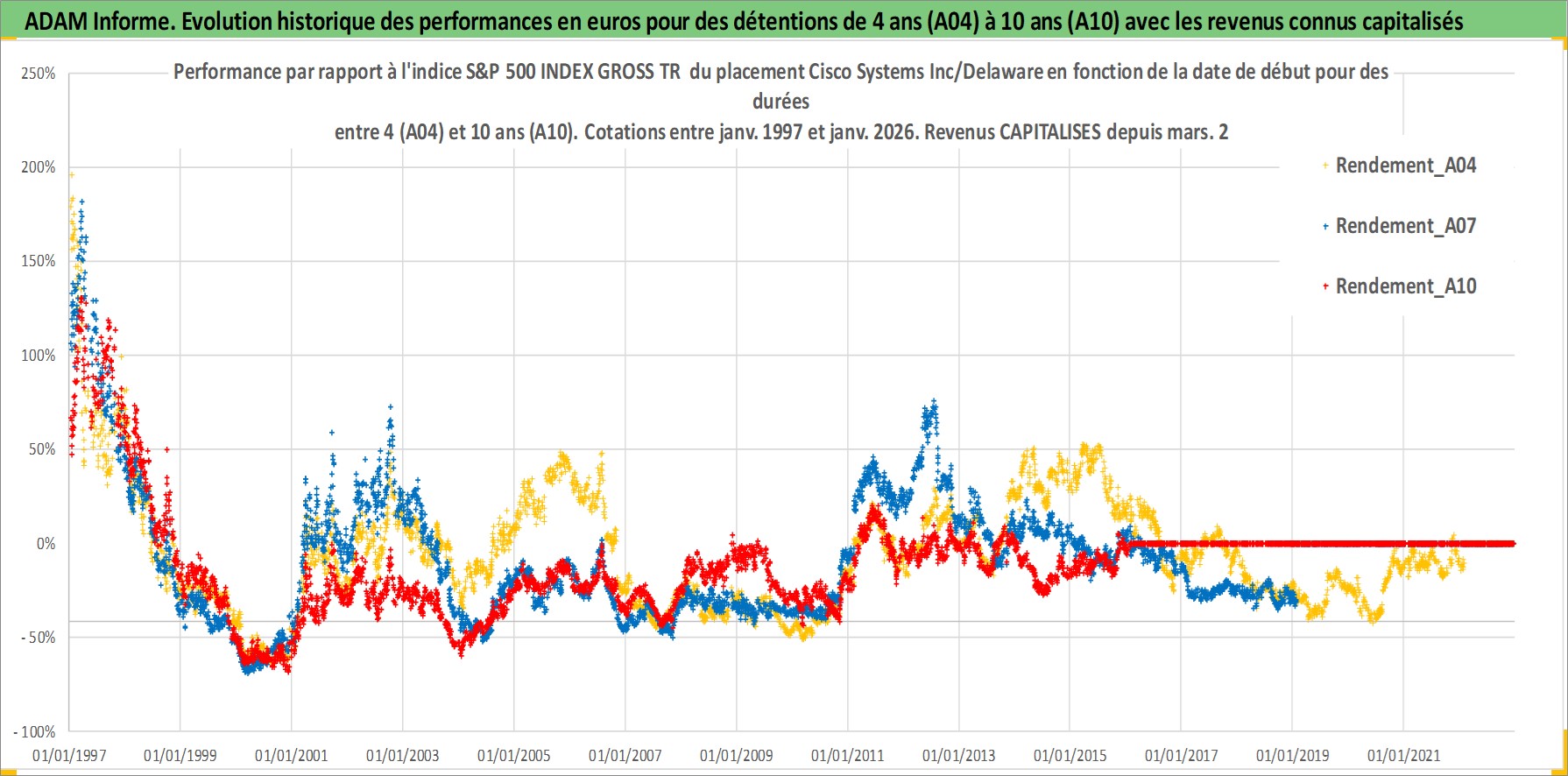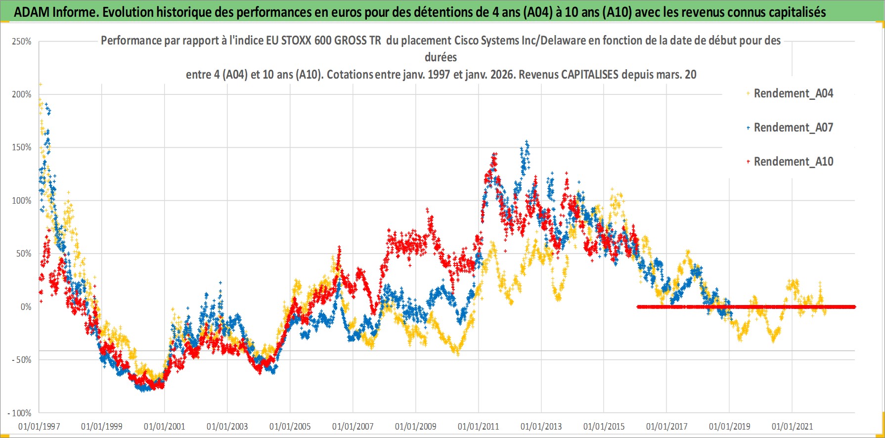 Site dédié aux investisseursPage dédiée sur site financeAnalyse des valorisations hebdomadaires de l'action Cisco Systems Inc/Delaware. Cet actif est cote en USD. Les valorisations sont en contrevaleur EURO et couvrent les semaines 1997W01 a 2026W05. Les revenus de cet actif financier sont pris en compte depuis la semaine 2011W13. La note globale ESG de cet actif est estimee a 15.0 (apres rebasage entre 0 et 20).