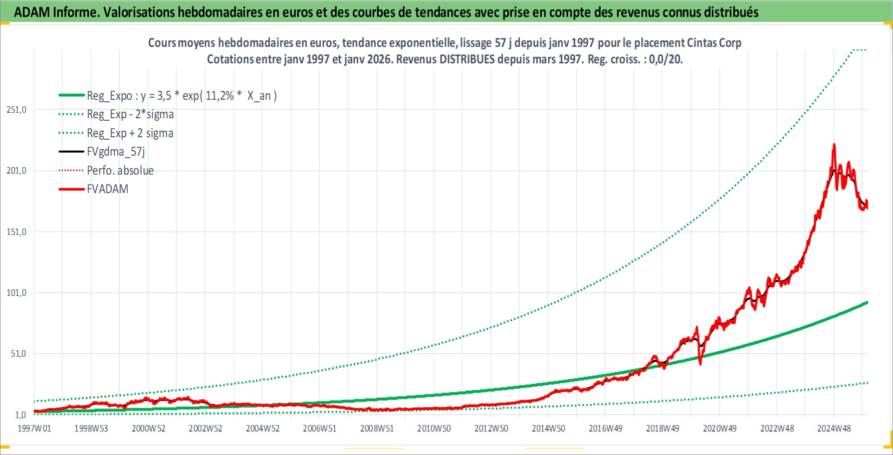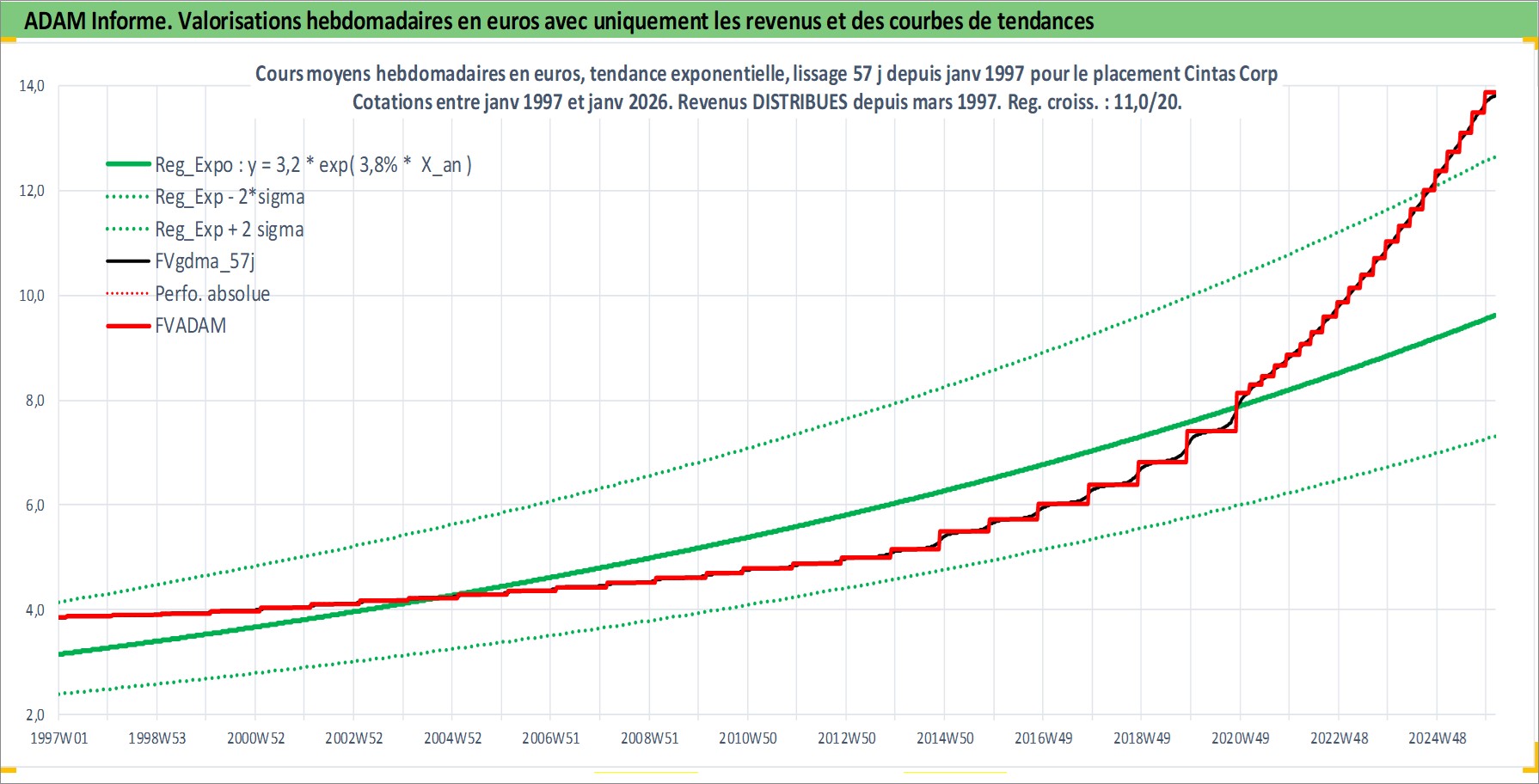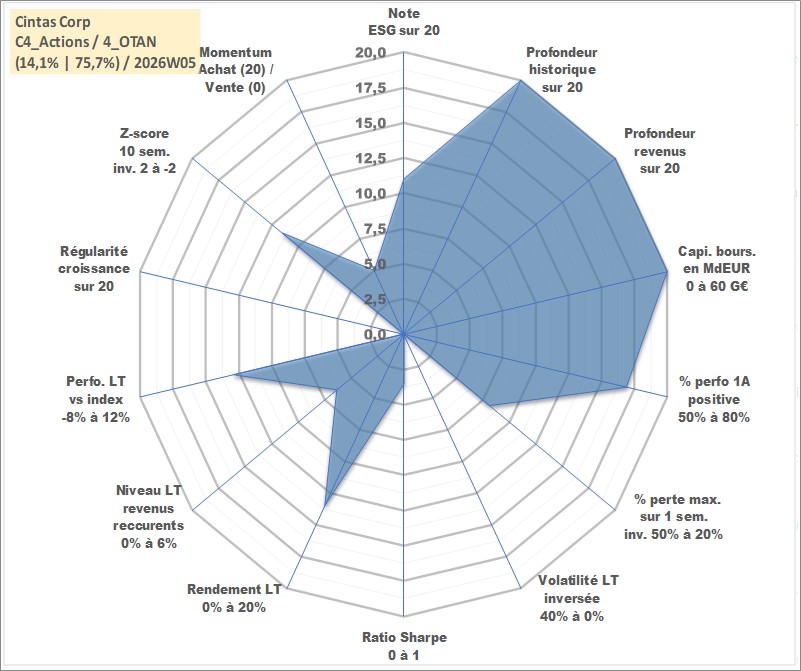 Site dédié aux investisseursPage dédiée sur site financeAnalyse des valorisations hebdomadaires de l'action Cintas Corp. Cet actif est cote en USD. Les valorisations sont en contrevaleur EURO et couvrent les semaines 1997W01 a 2026W05. Les revenus de cet actif financier sont pris en compte depuis la semaine 1997W10. La note globale ESG de cet actif est estimee a 11.0 (apres rebasage entre 0 et 20).