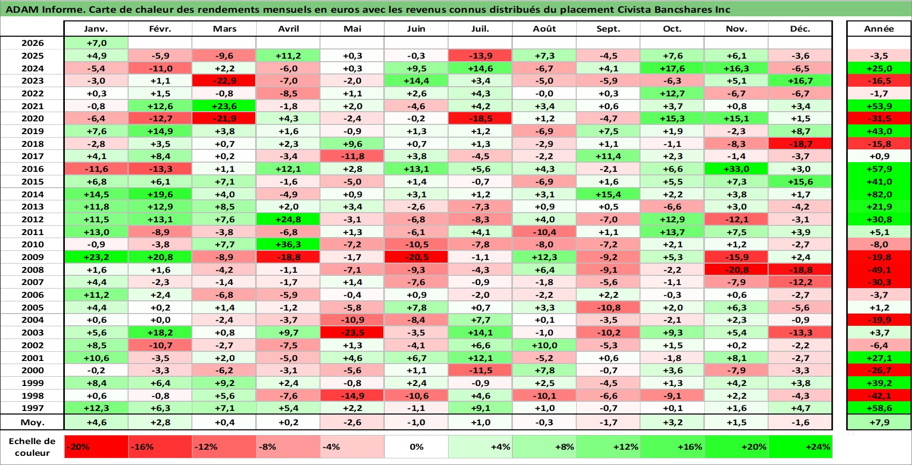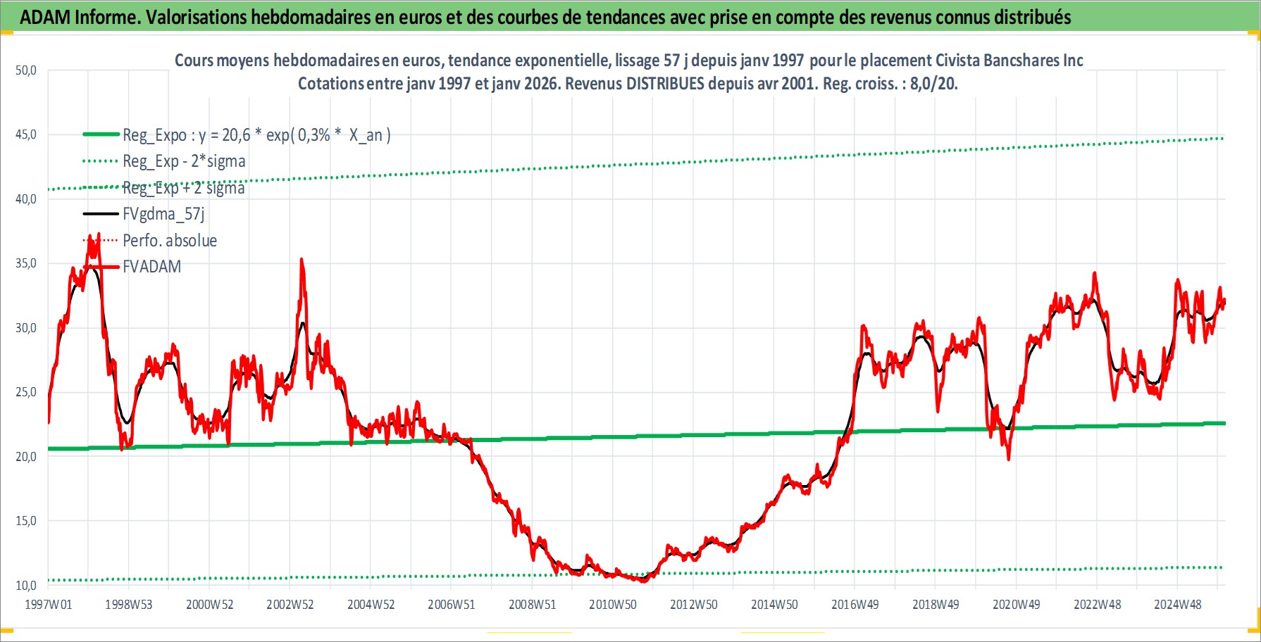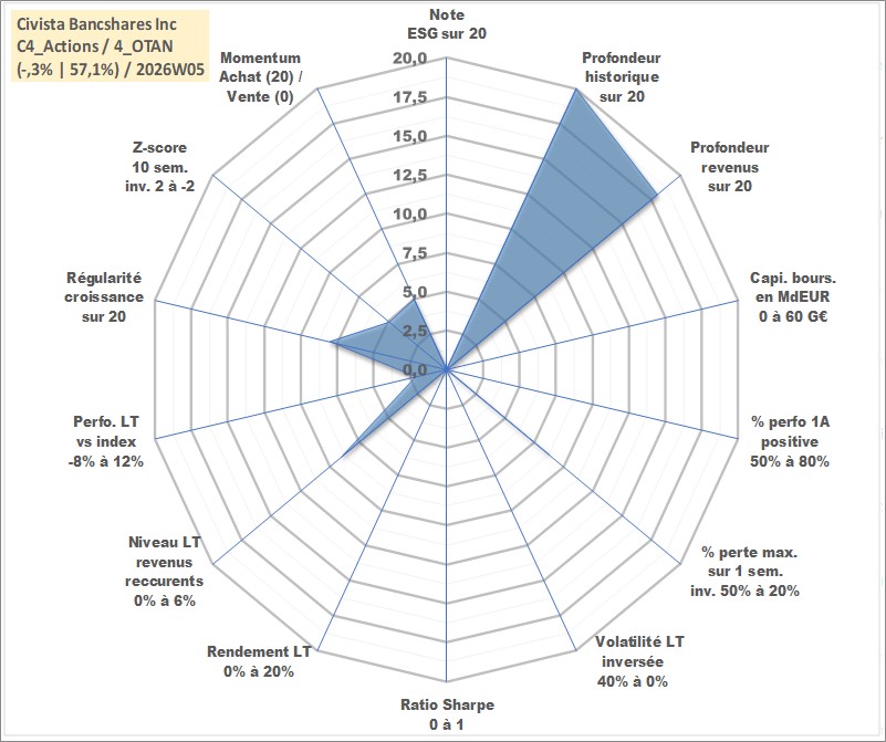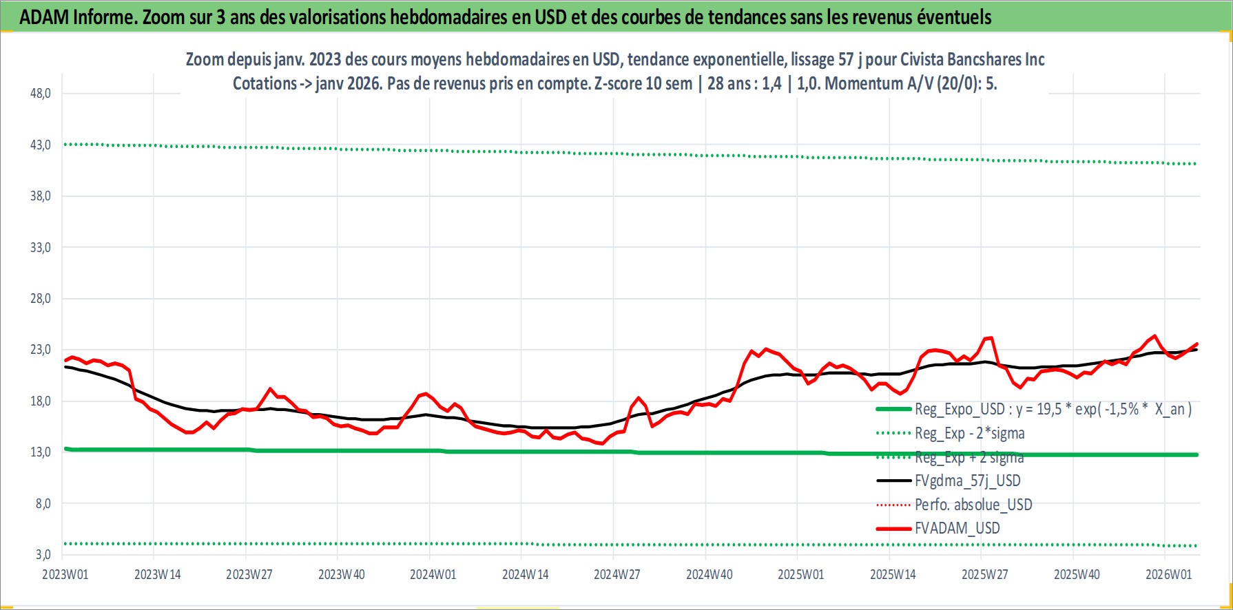 Site dédié aux investisseursPage dédiée sur site financeAnalyse des valorisations hebdomadaires de l'action Civista Bancshares Inc. Cet actif est cote en USD. Les valorisations sont en contrevaleur EURO et couvrent les semaines 1997W01 a 2026W05. Les revenus de cet actif financier sont pris en compte depuis la semaine 2001W15. La note ESG de cet actif n'est pas connue.