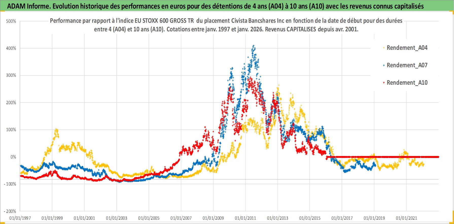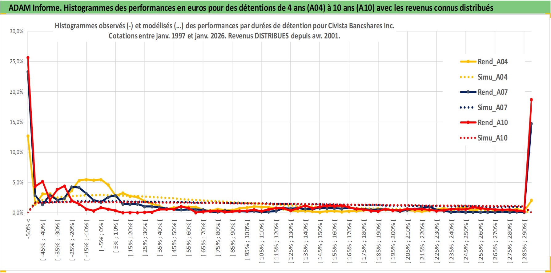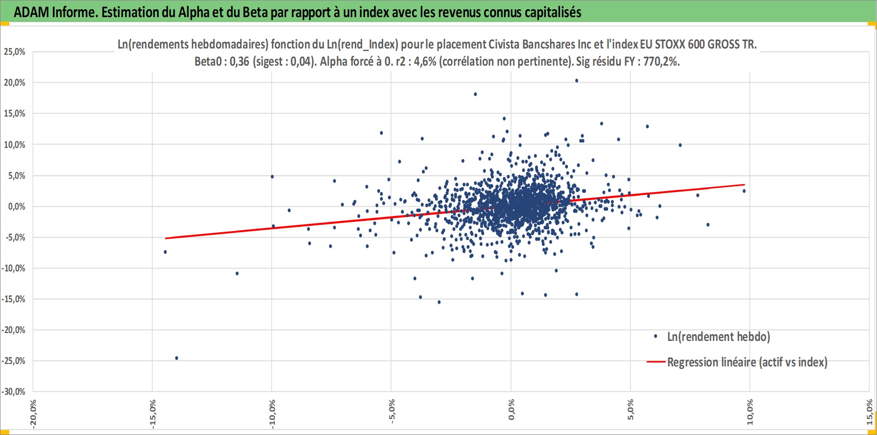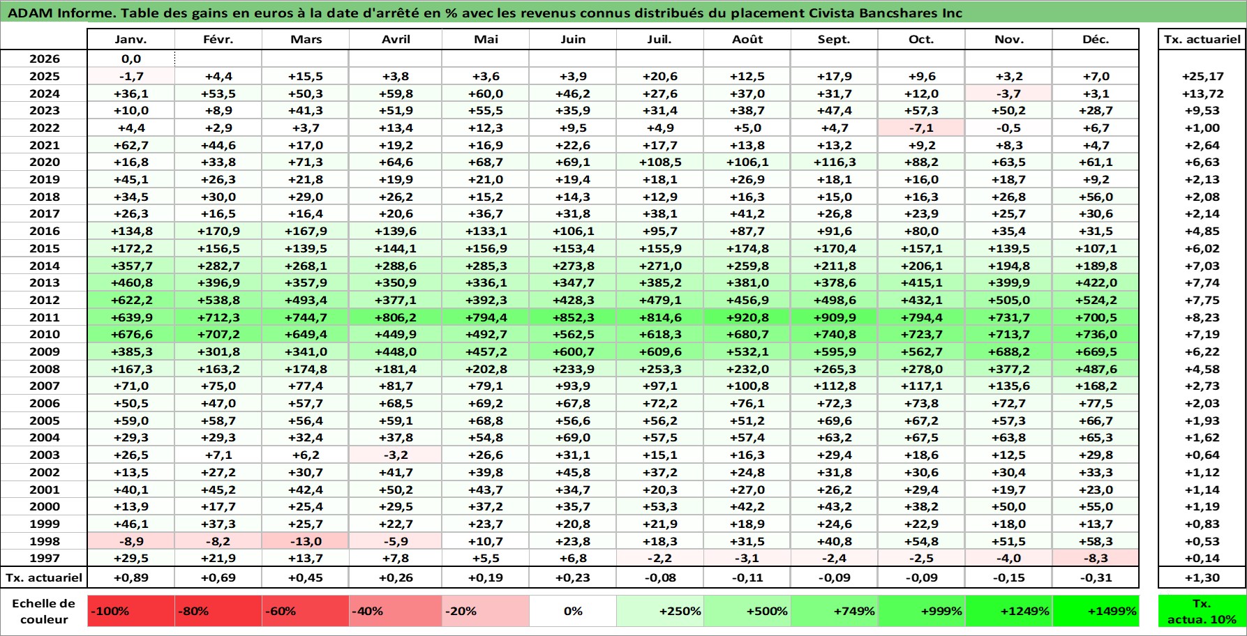 Site dédié aux investisseursPage dédiée sur site financeAnalyse des valorisations hebdomadaires de l'action Civista Bancshares Inc. Cet actif est cote en USD. Les valorisations sont en contrevaleur EURO et couvrent les semaines 1997W01 a 2026W05. Les revenus de cet actif financier sont pris en compte depuis la semaine 2001W15. La note ESG de cet actif n'est pas connue.