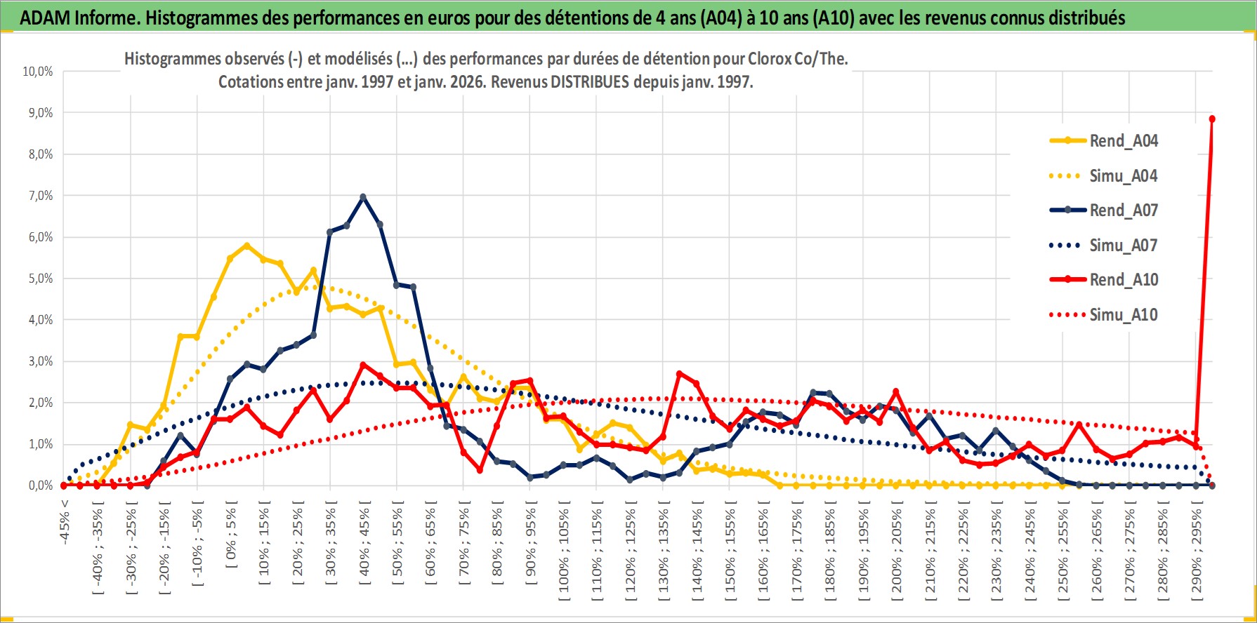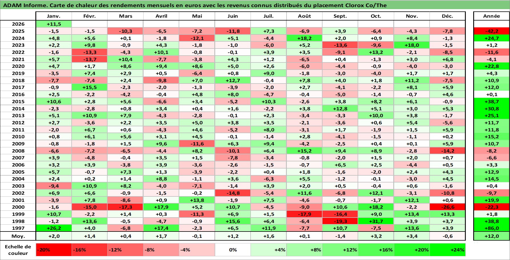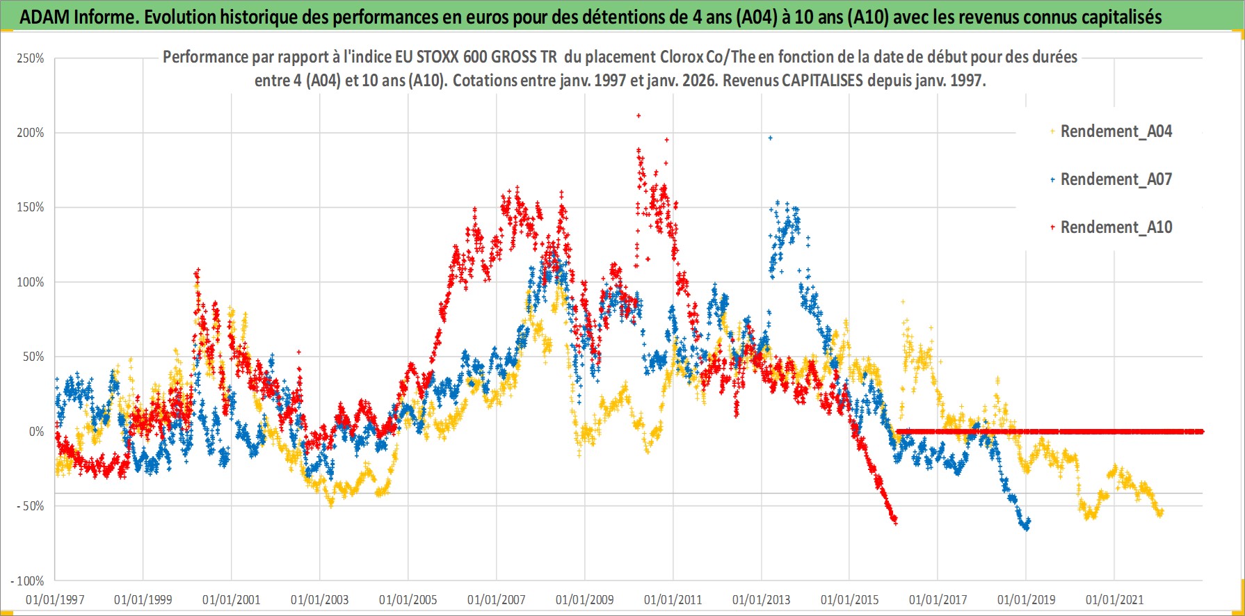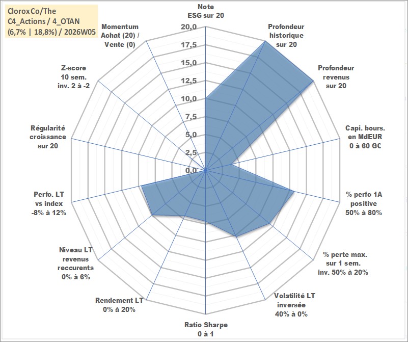 Site dédié aux investisseursPage dédiée sur site financeAnalyse des valorisations hebdomadaires de l'action Clorox Co/The. Cet actif est cote en USD. Les valorisations sont en contrevaleur EURO et couvrent les semaines 1997W01 a 2026W05. Les revenus de cet actif financier sont pris en compte depuis la semaine 1997W05. La note globale ESG de cet actif est estimee a 10.0 (apres rebasage entre 0 et 20).