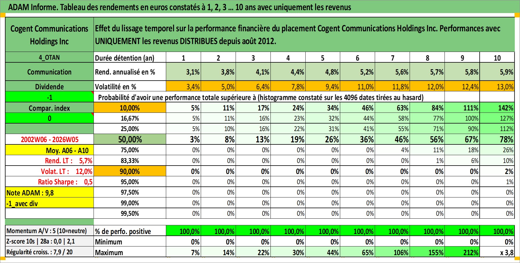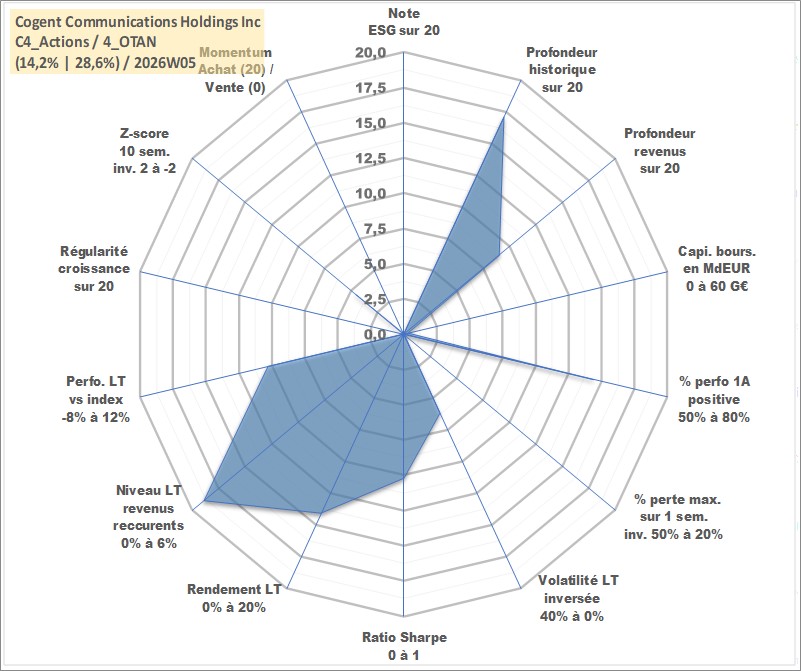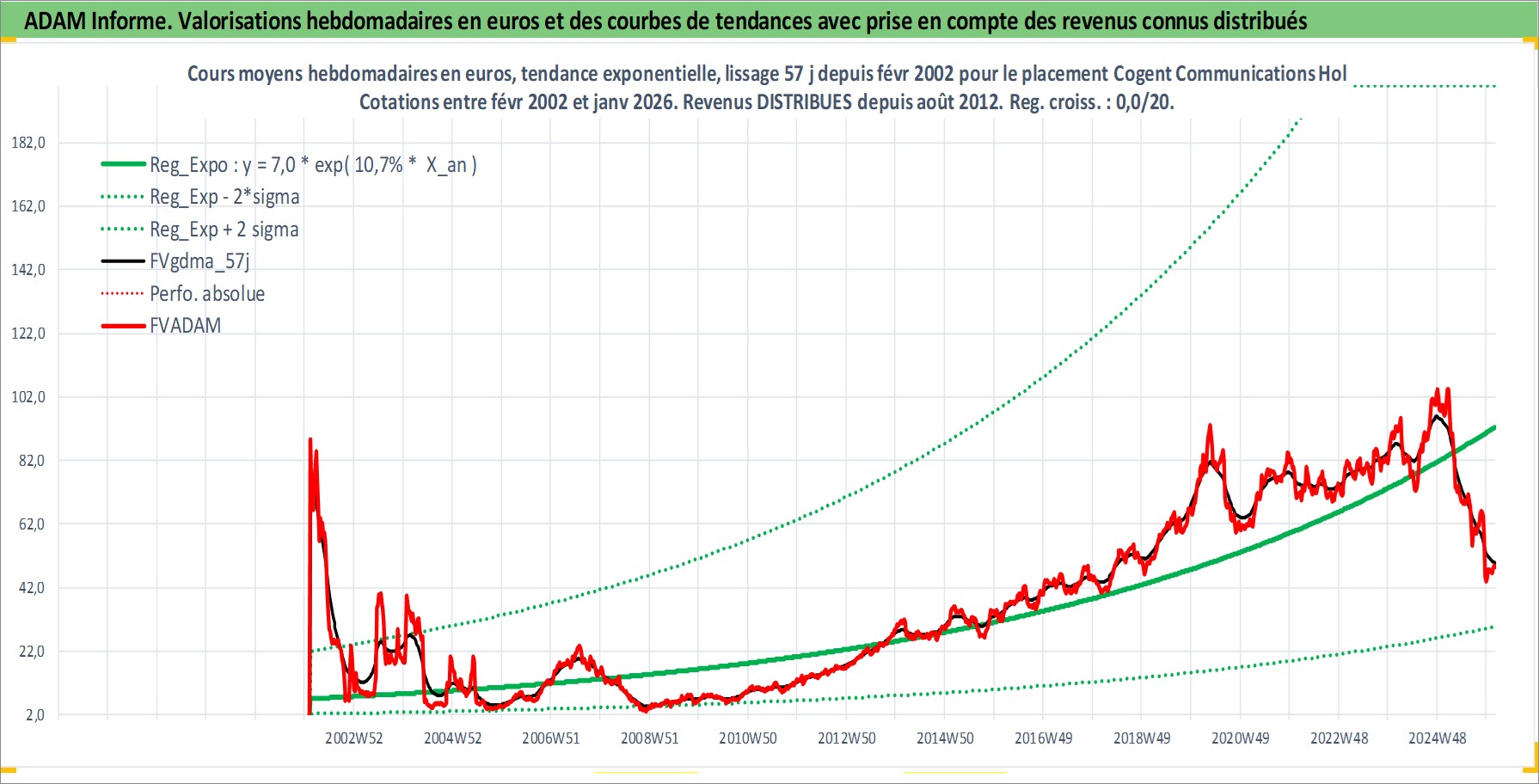 Site dédié aux investisseursPage dédiée sur site financeAnalyse des valorisations hebdomadaires de l'action Cogent Communications Holdings Inc. Cet actif est cote en USD. Les valorisations sont en contrevaleur EURO et couvrent les semaines 2002W06 a 2026W05. Les revenus de cet actif financier sont pris en compte depuis la semaine 2012W34. La note ESG de cet actif n'est pas connue.