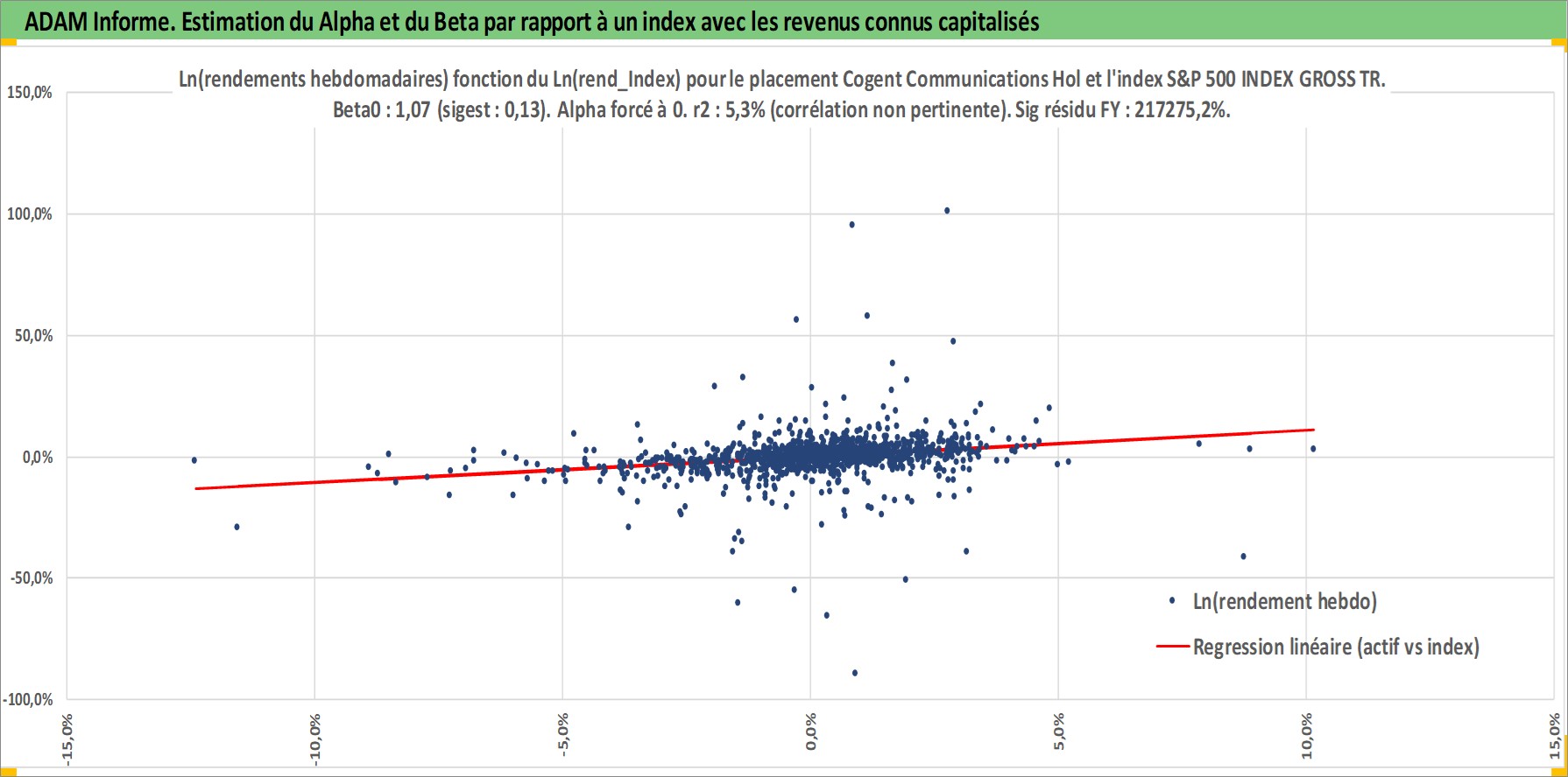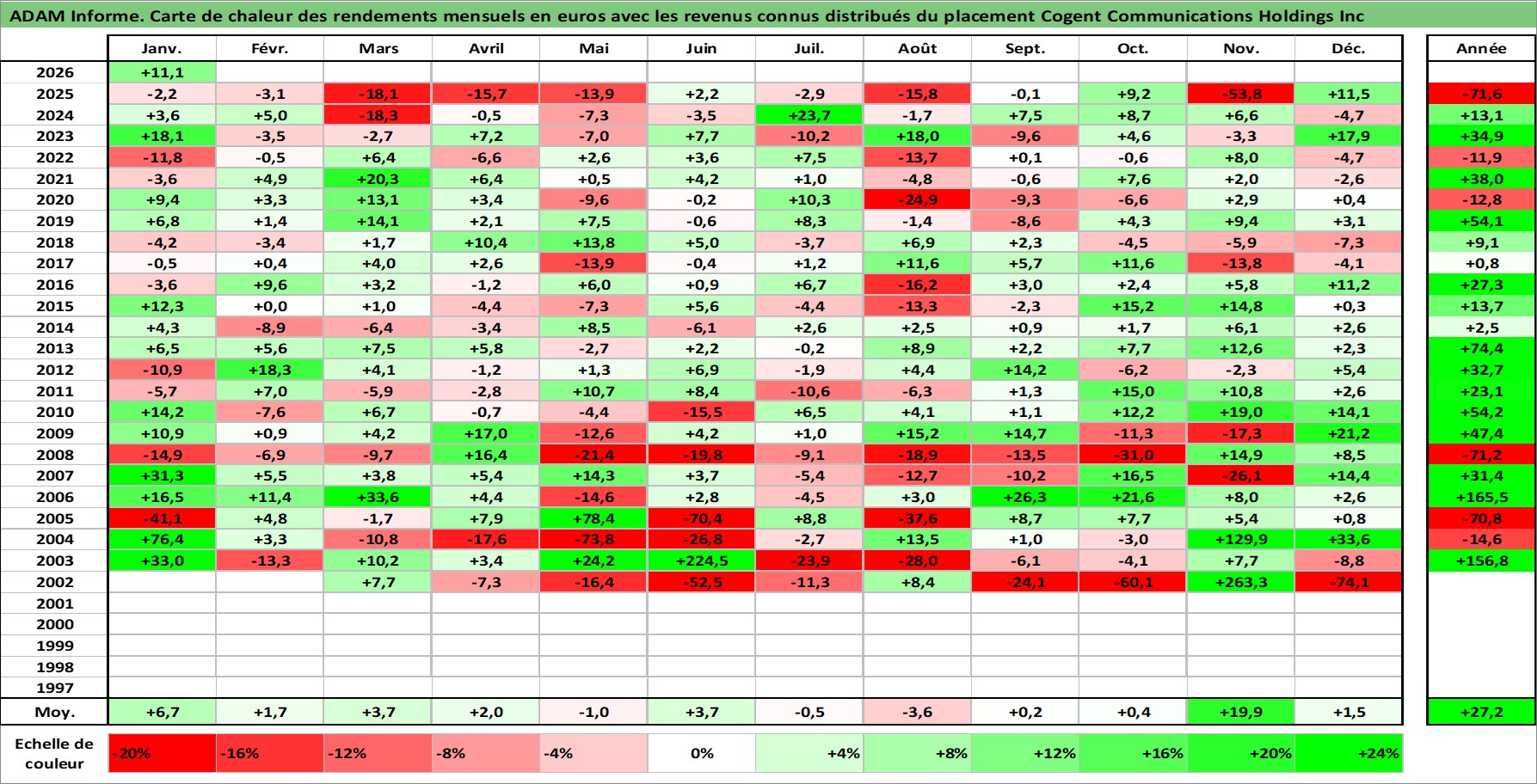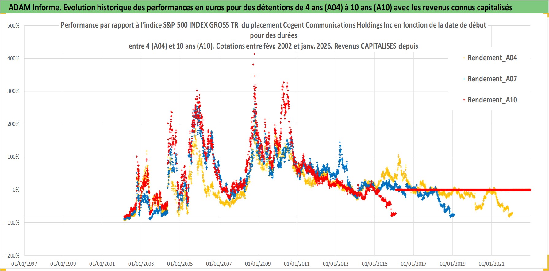 Site dédié aux investisseursPage dédiée sur site financeAnalyse des valorisations hebdomadaires de l'action Cogent Communications Holdings Inc. Cet actif est cote en USD. Les valorisations sont en contrevaleur EURO et couvrent les semaines 2002W06 a 2026W05. Les revenus de cet actif financier sont pris en compte depuis la semaine 2012W34. La note ESG de cet actif n'est pas connue.