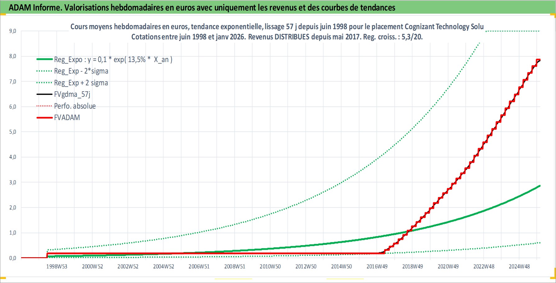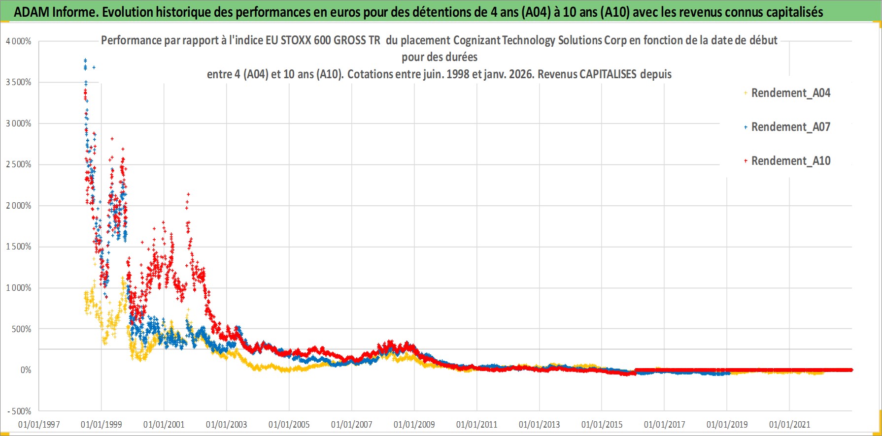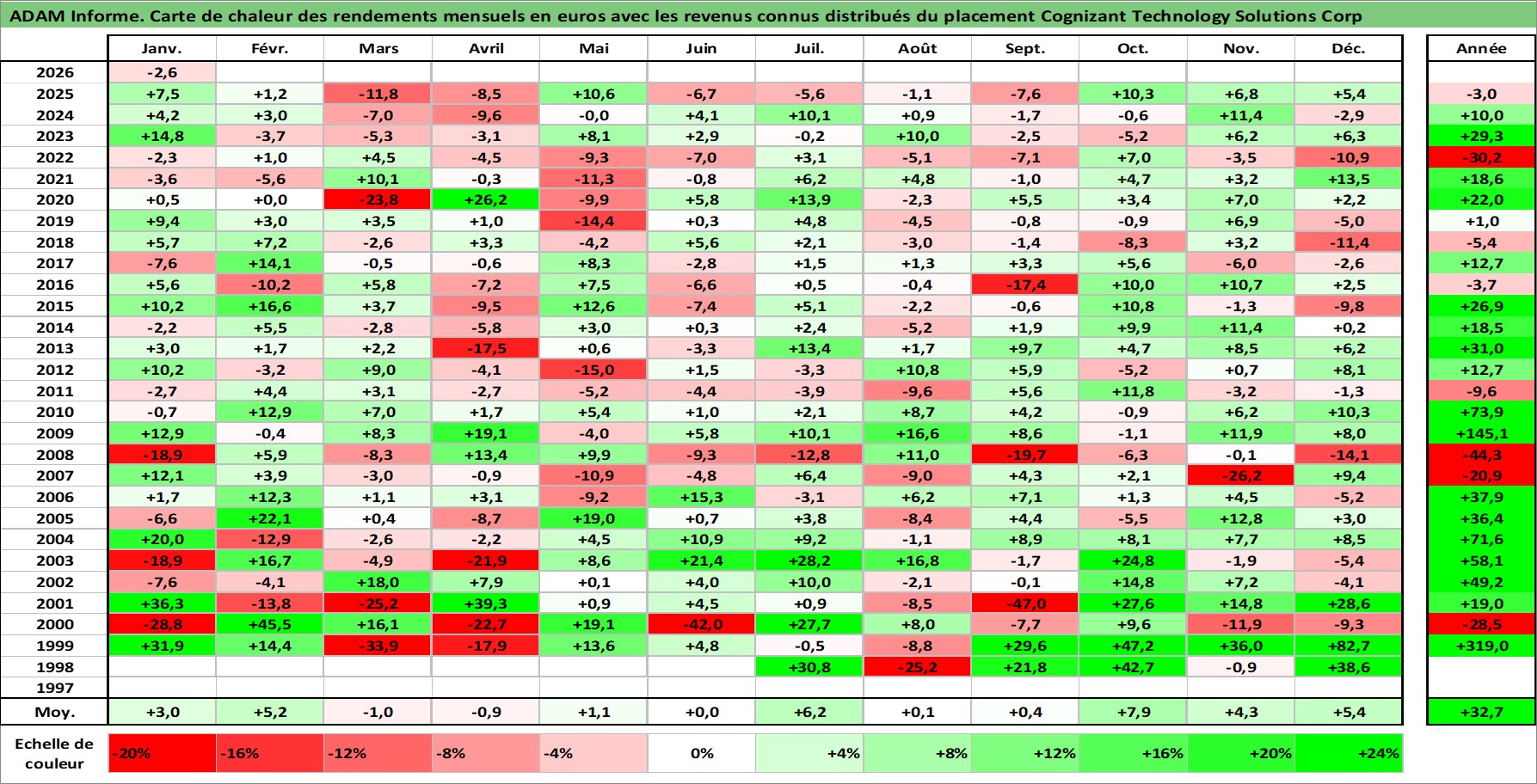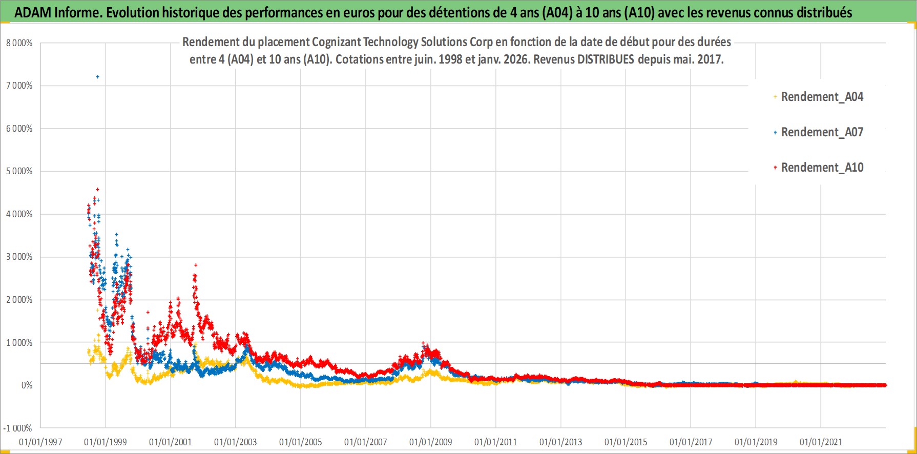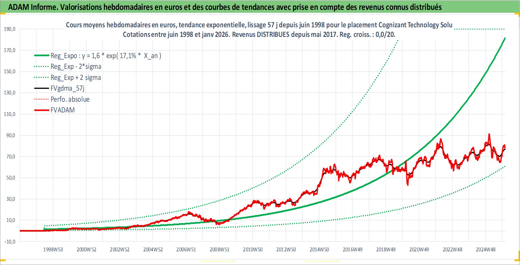 Site dédié aux investisseursPage dédiée sur site financeAnalyse des valorisations hebdomadaires de l'action Cognizant Technology Solutions Corp. Cet actif est cote en USD. Les valorisations sont en contrevaleur EURO et couvrent les semaines 1998W25 a 2026W05. Les revenus de cet actif financier sont pris en compte depuis la semaine 2017W20. La note globale ESG de cet actif est estimee a 14.0 (apres rebasage entre 0 et 20).