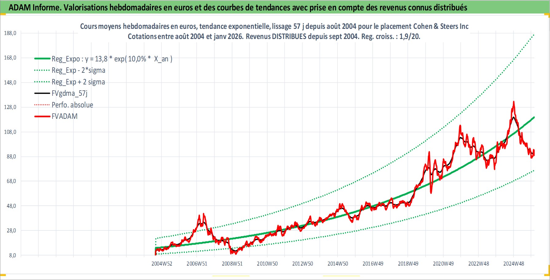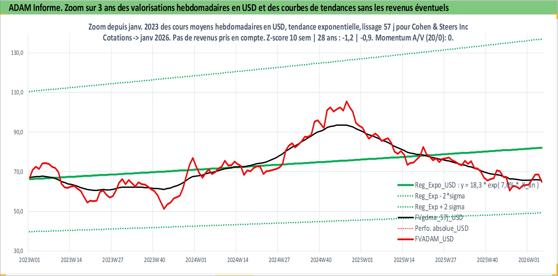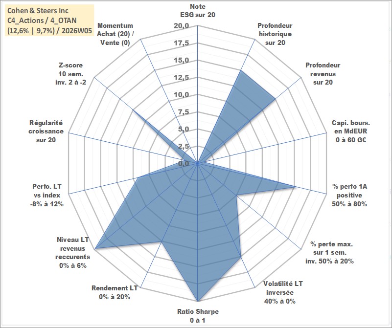 Site dédié aux investisseursPage dédiée sur site financeAnalyse des valorisations hebdomadaires de l'action Cohen & Steers Inc. Cet actif est cote en USD. Les valorisations sont en contrevaleur EURO et couvrent les semaines 2004W34 a 2026W05. Les revenus de cet actif financier sont pris en compte depuis la semaine 2004W39. La note ESG de cet actif n'est pas connue.