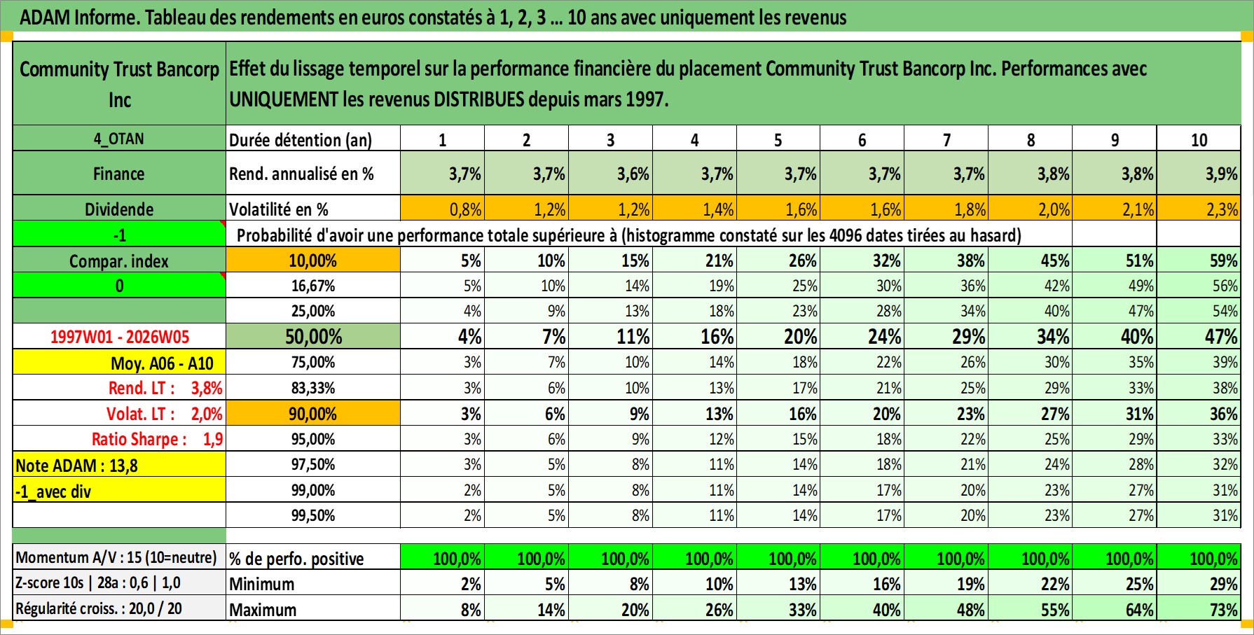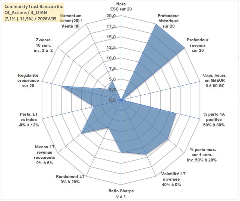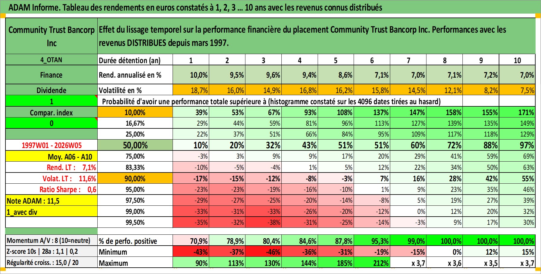 Site dédié aux investisseursPage dédiée sur site financeAnalyse des valorisations hebdomadaires de l'action Community Trust Bancorp Inc. Cet actif est cote en USD. Les valorisations sont en contrevaleur EURO et couvrent les semaines 1997W01 a 2026W05. Les revenus de cet actif financier sont pris en compte depuis la semaine 1997W11. La note ESG de cet actif n'est pas connue.