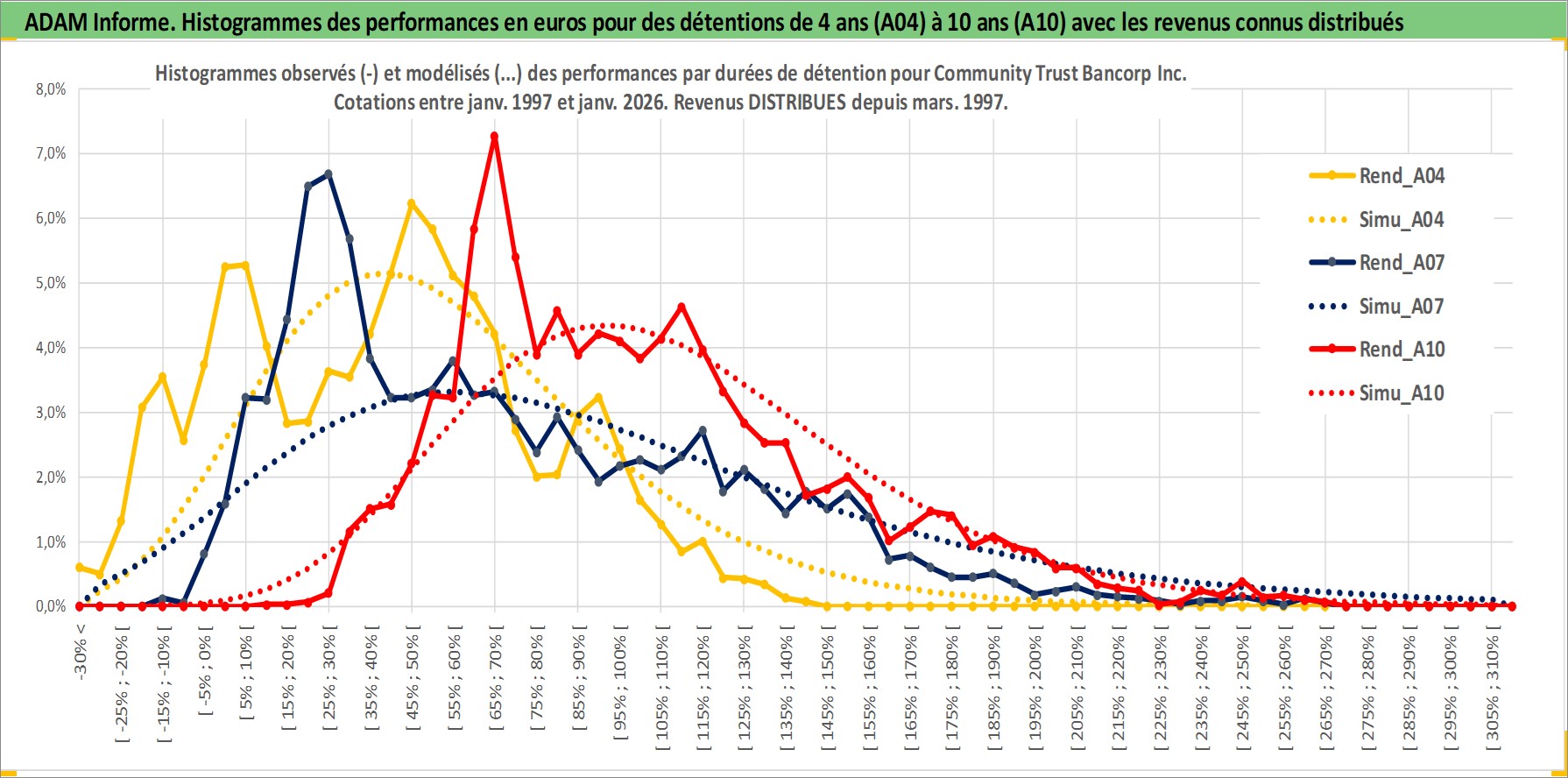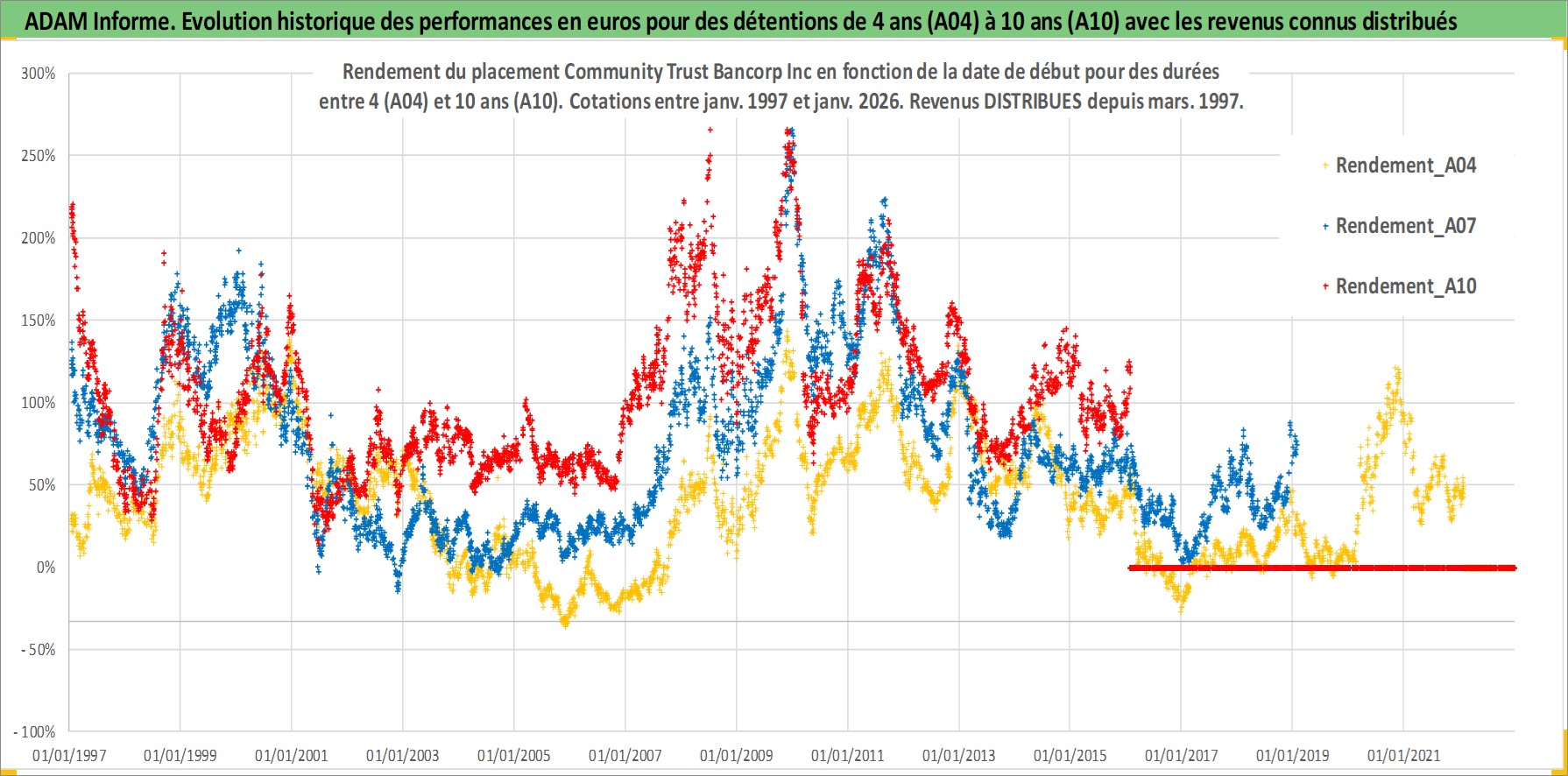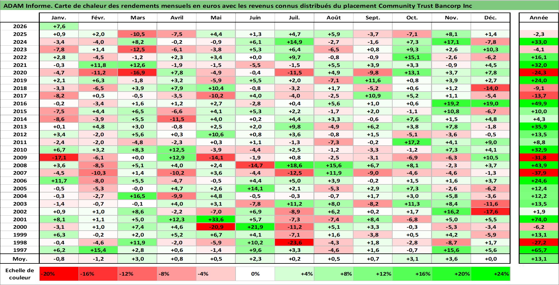 Site dédié aux investisseursPage dédiée sur site financeAnalyse des valorisations hebdomadaires de l'action Community Trust Bancorp Inc. Cet actif est cote en USD. Les valorisations sont en contrevaleur EURO et couvrent les semaines 1997W01 a 2026W05. Les revenus de cet actif financier sont pris en compte depuis la semaine 1997W11. La note ESG de cet actif n'est pas connue.