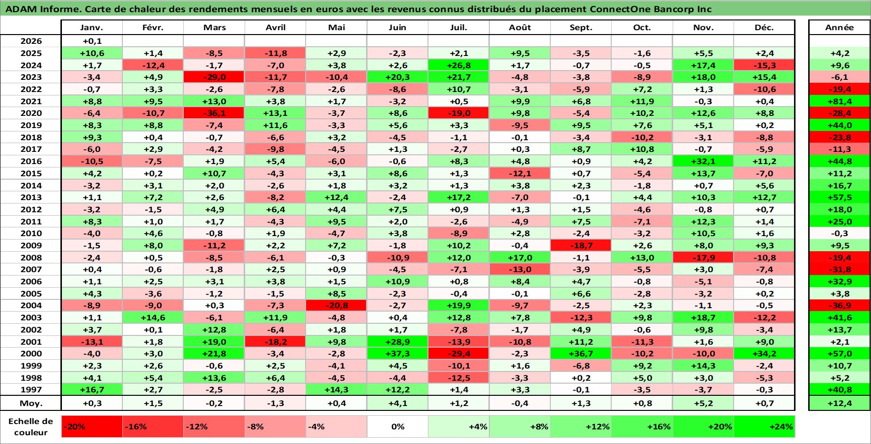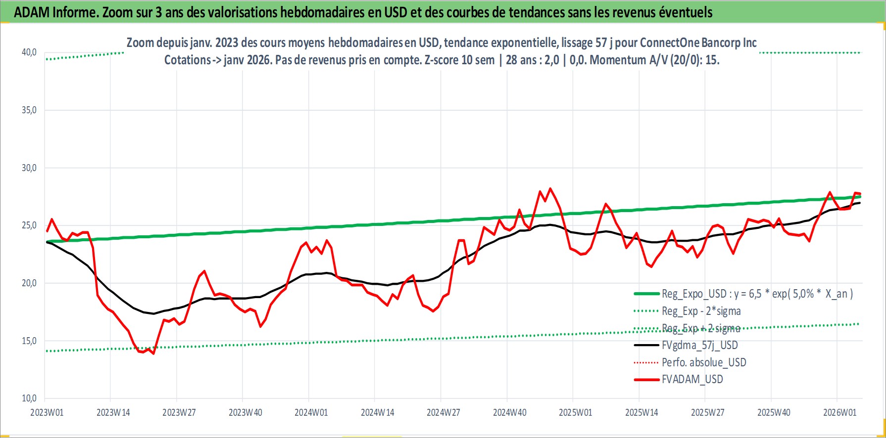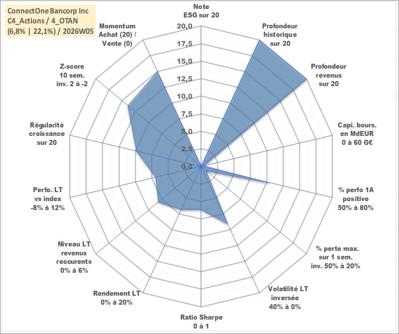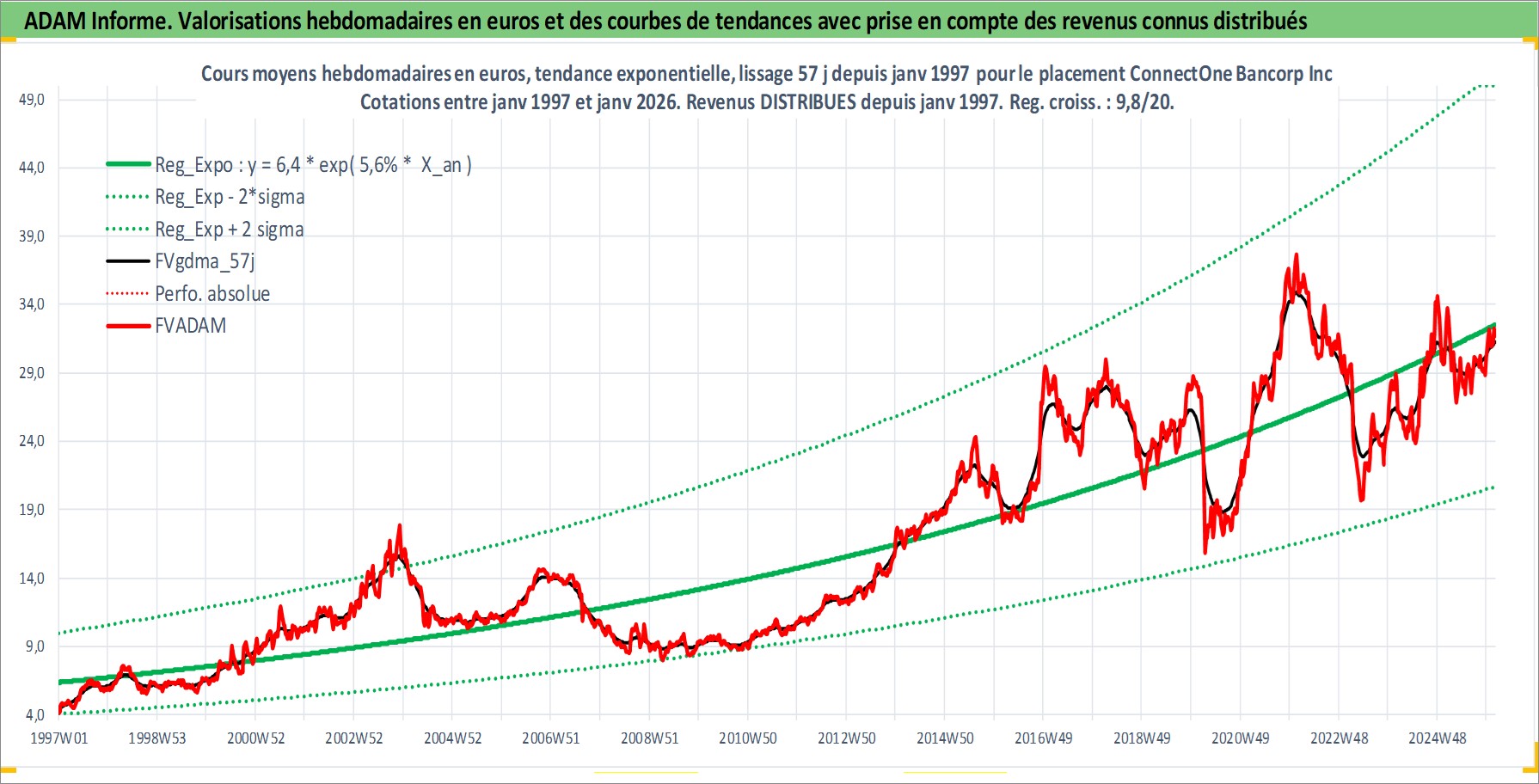 Site dédié aux investisseursPage dédiée sur site financeAnalyse des valorisations hebdomadaires de l'action ConnectOne Bancorp Inc. Cet actif est cote en USD. Les valorisations sont en contrevaleur EURO et couvrent les semaines 1997W01 a 2026W05. Les revenus de cet actif financier sont pris en compte depuis la semaine 1997W03. La note ESG de cet actif n'est pas connue.