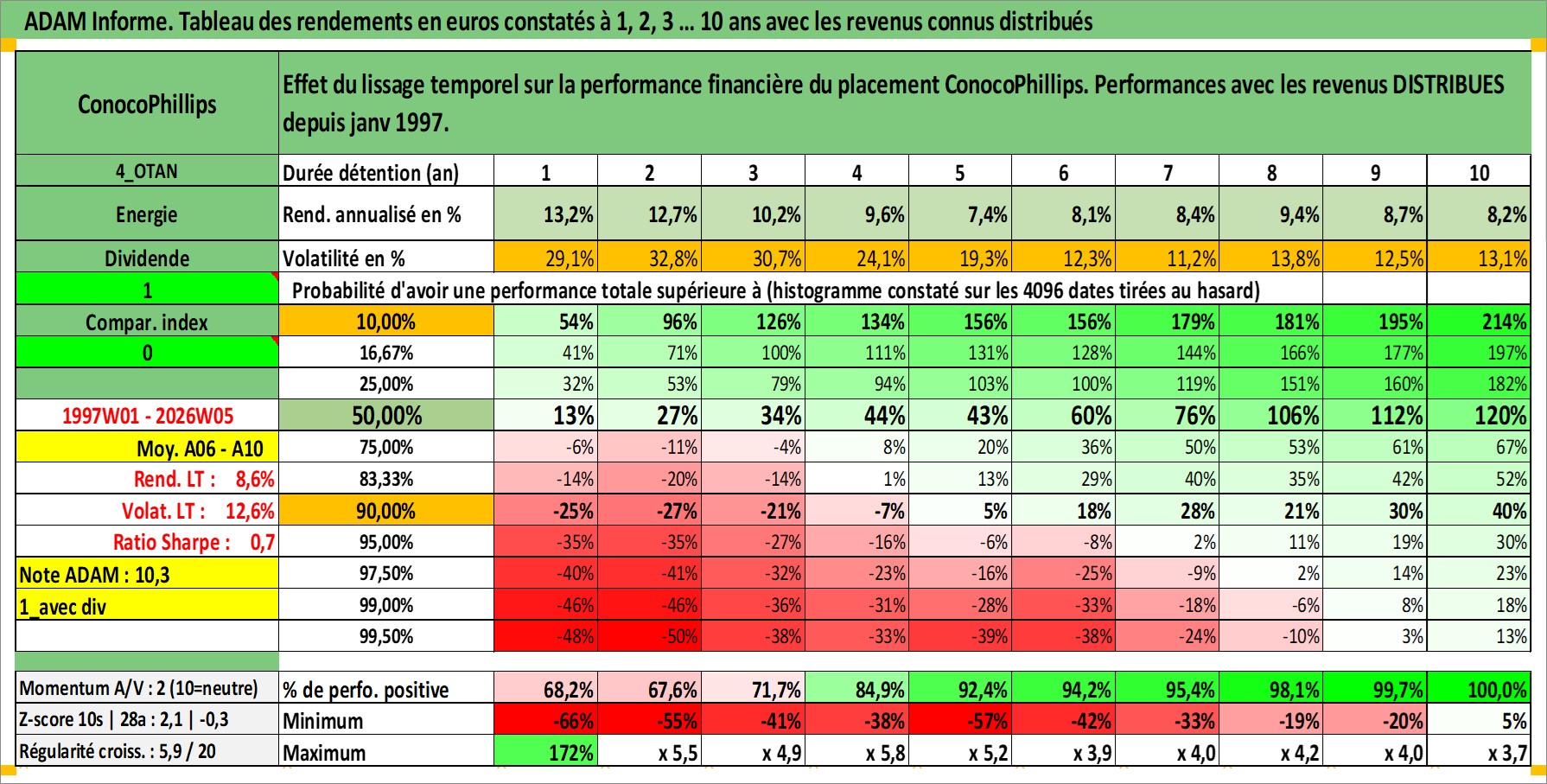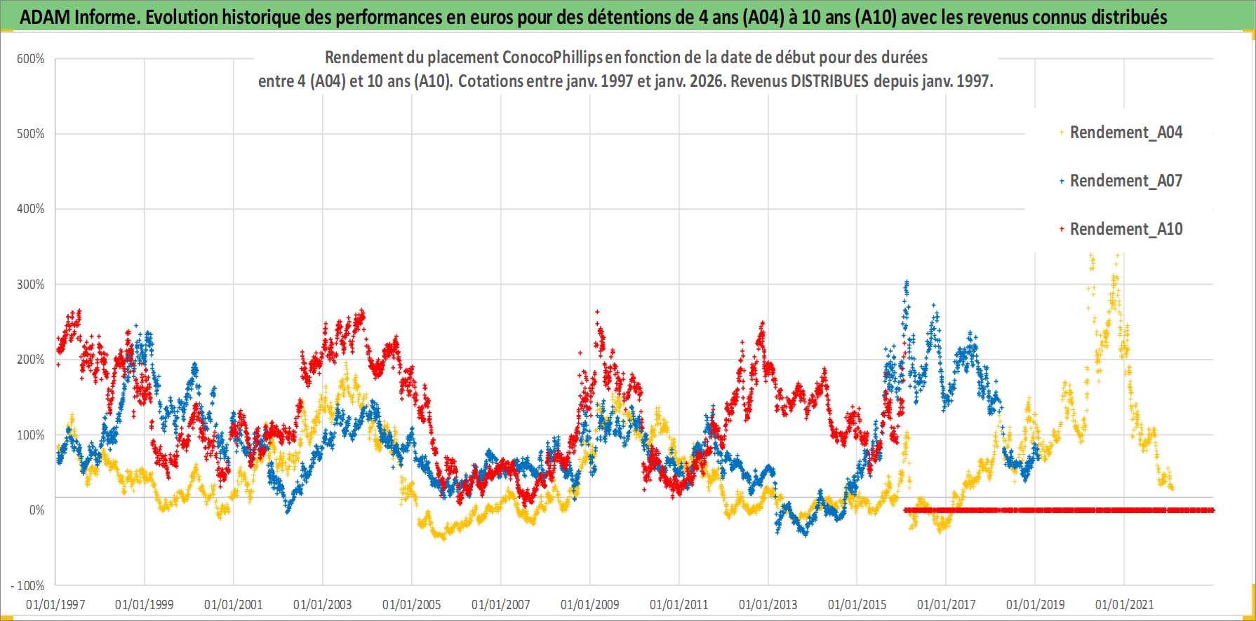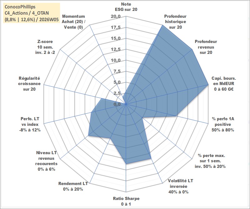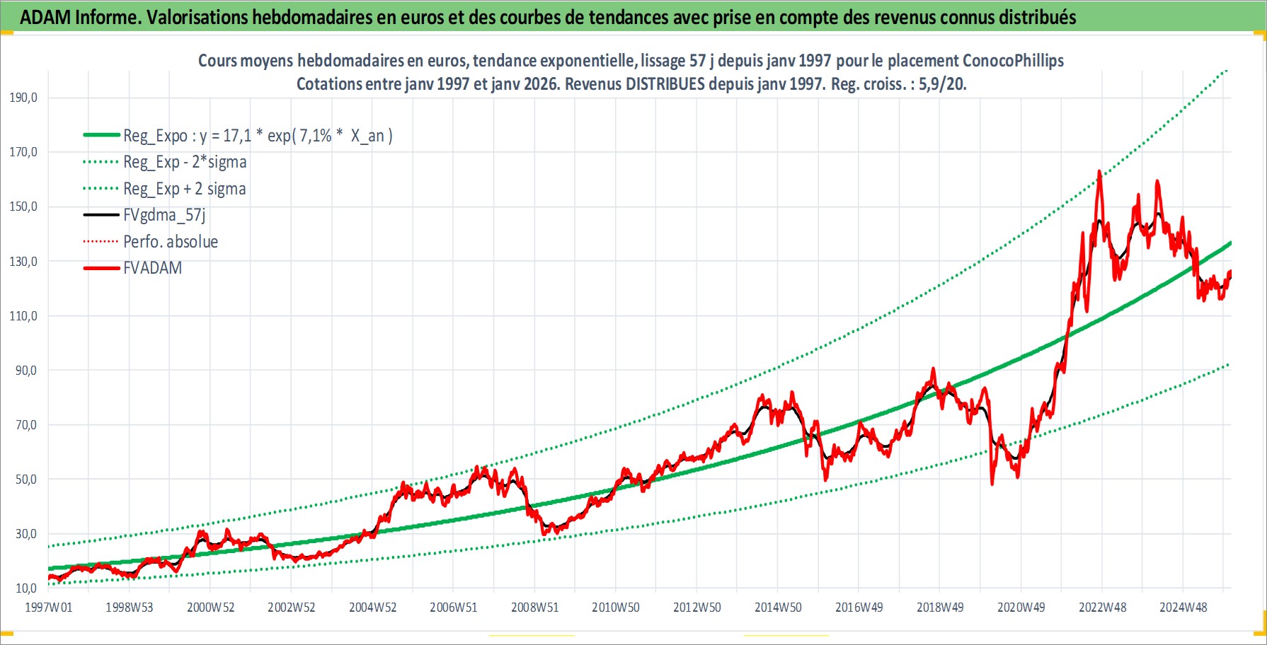 Site dédié aux investisseursPage dédiée sur site financeAnalyse des valorisations hebdomadaires de l'action ConocoPhillips. Cet actif est cote en USD. Les valorisations sont en contrevaleur EURO et couvrent les semaines 1997W01 a 2026W05. Les revenus de cet actif financier sont pris en compte depuis la semaine 1997W05. La note globale ESG de cet actif est estimee a 3.0 (apres rebasage entre 0 et 20).