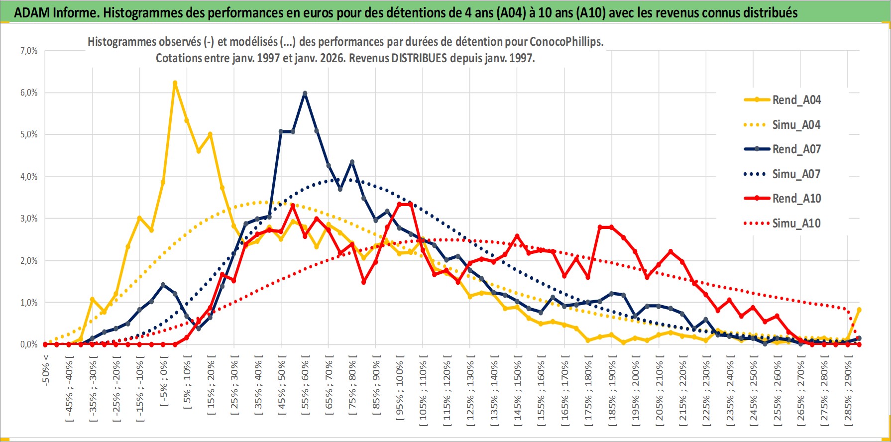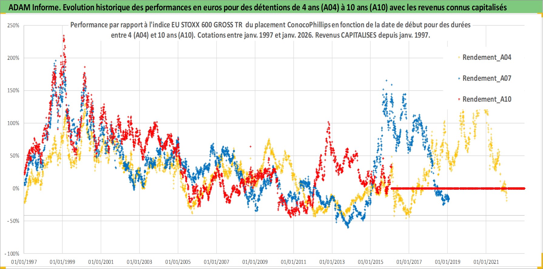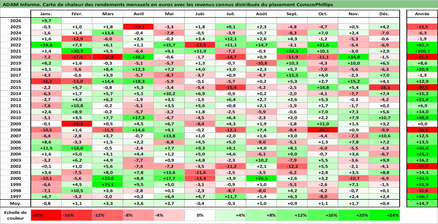 Site dédié aux investisseursPage dédiée sur site financeAnalyse des valorisations hebdomadaires de l'action ConocoPhillips. Cet actif est cote en USD. Les valorisations sont en contrevaleur EURO et couvrent les semaines 1997W01 a 2026W05. Les revenus de cet actif financier sont pris en compte depuis la semaine 1997W05. La note globale ESG de cet actif est estimee a 3.0 (apres rebasage entre 0 et 20).