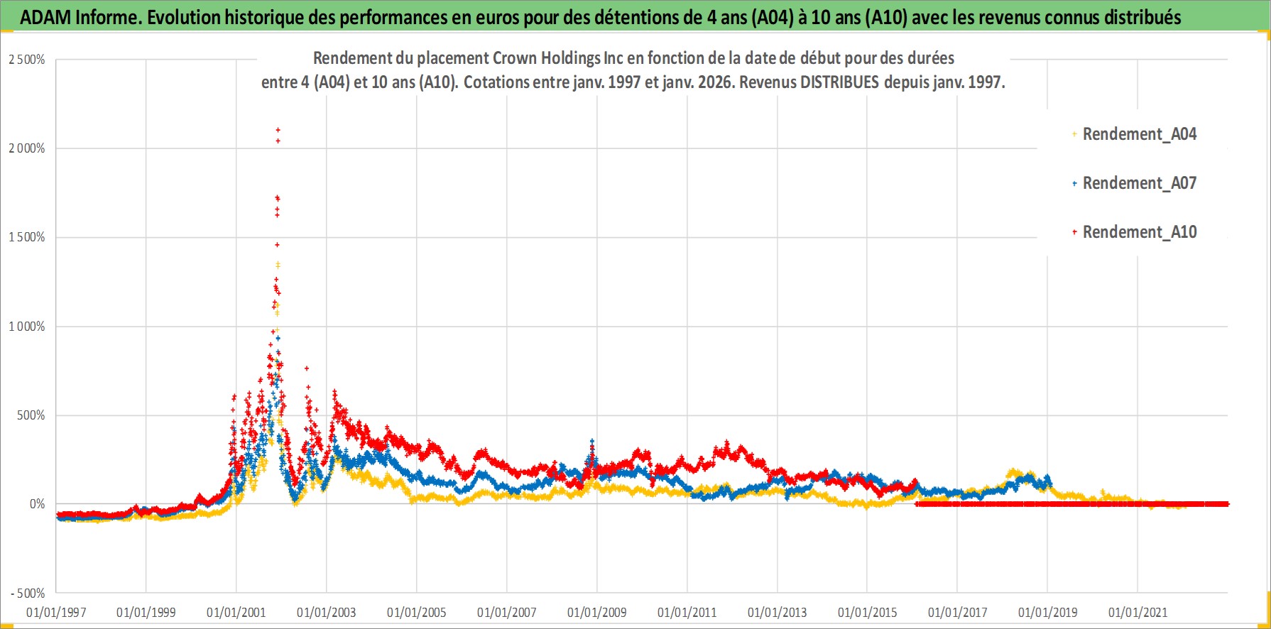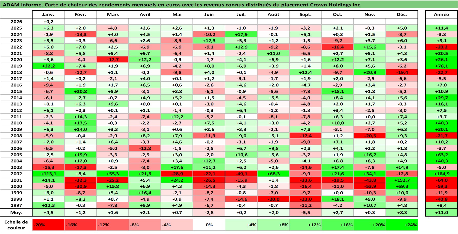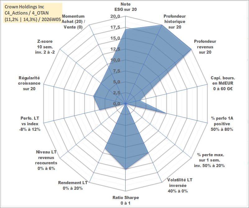 Site dédié aux investisseursPage dédiée sur site financeAnalyse des valorisations hebdomadaires de l'action Crown Holdings Inc. Cet actif est cote en USD. Les valorisations sont en contrevaleur EURO et couvrent les semaines 1997W01 a 2026W05. Les revenus de cet actif financier sont pris en compte depuis la semaine 1997W05. La note globale ESG de cet actif est estimee a 17.0 (apres rebasage entre 0 et 20).