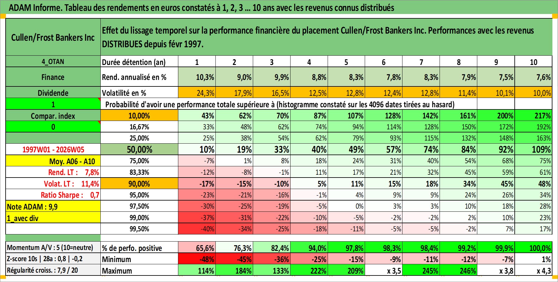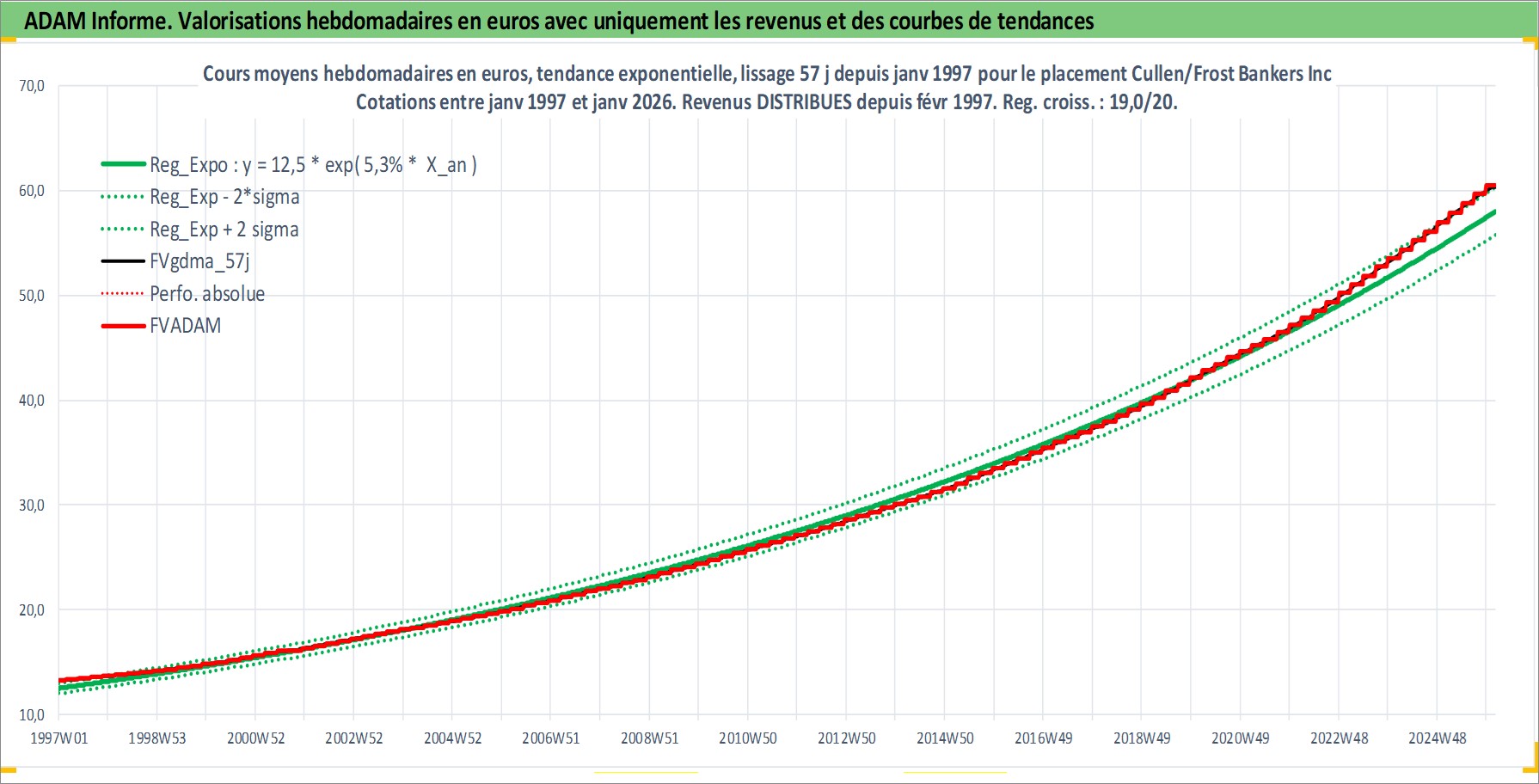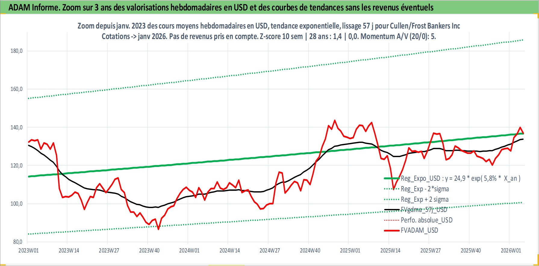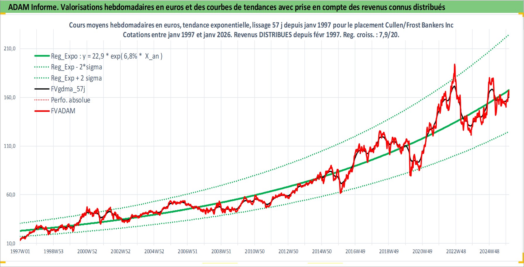 Site dédié aux investisseursPage dédiée sur site financeAnalyse des valorisations hebdomadaires de l'action Cullen/Frost Bankers Inc. Cet actif est cote en USD. Les valorisations sont en contrevaleur EURO et couvrent les semaines 1997W01 a 2026W05. Les revenus de cet actif financier sont pris en compte depuis la semaine 1997W09. La note globale ESG de cet actif est estimee a 5.0 (apres rebasage entre 0 et 20).