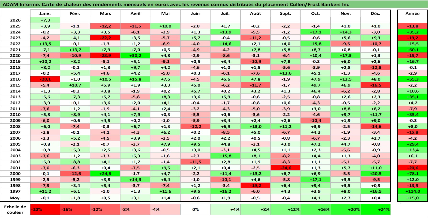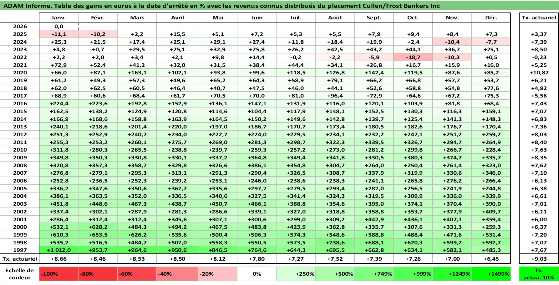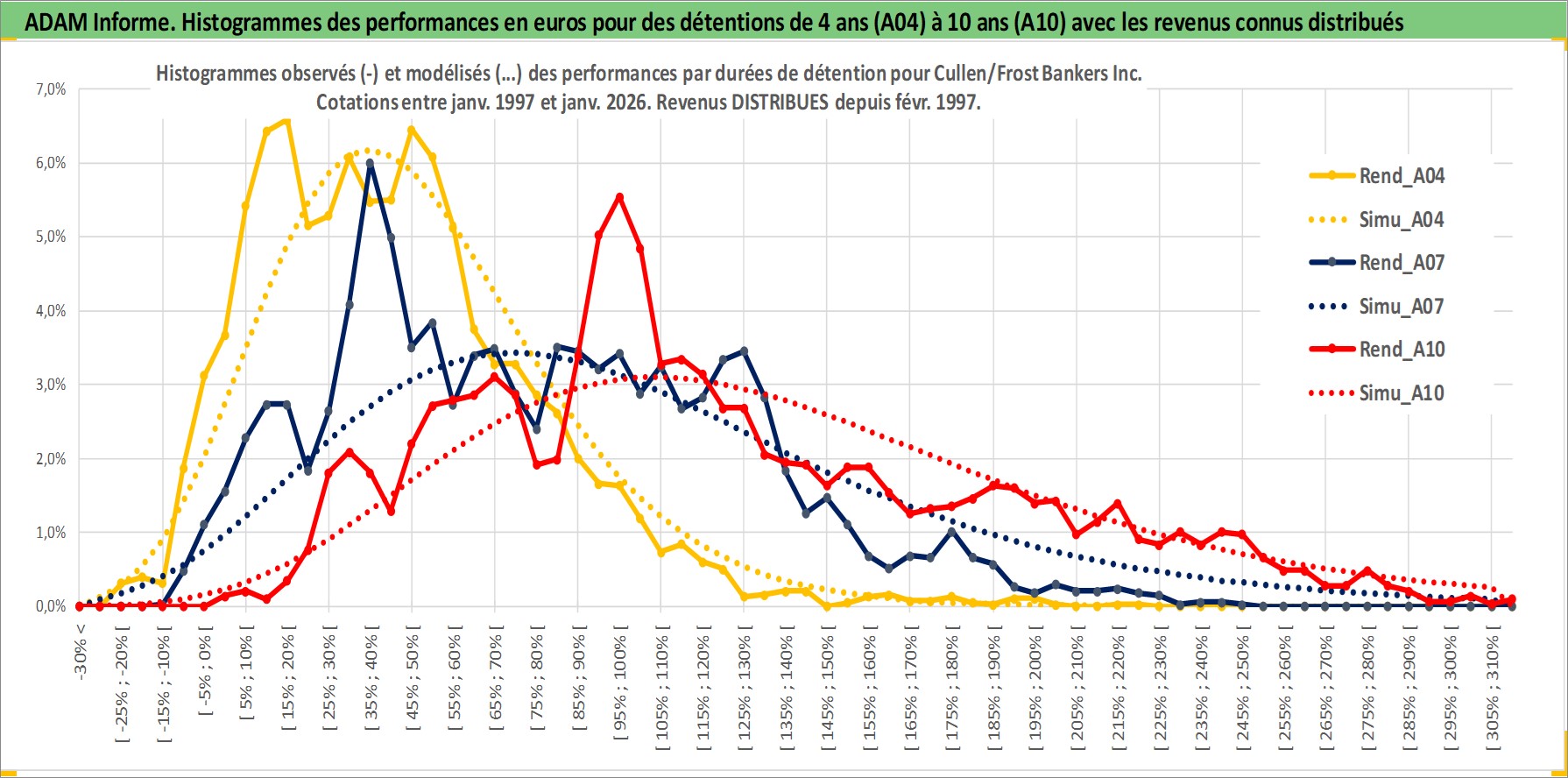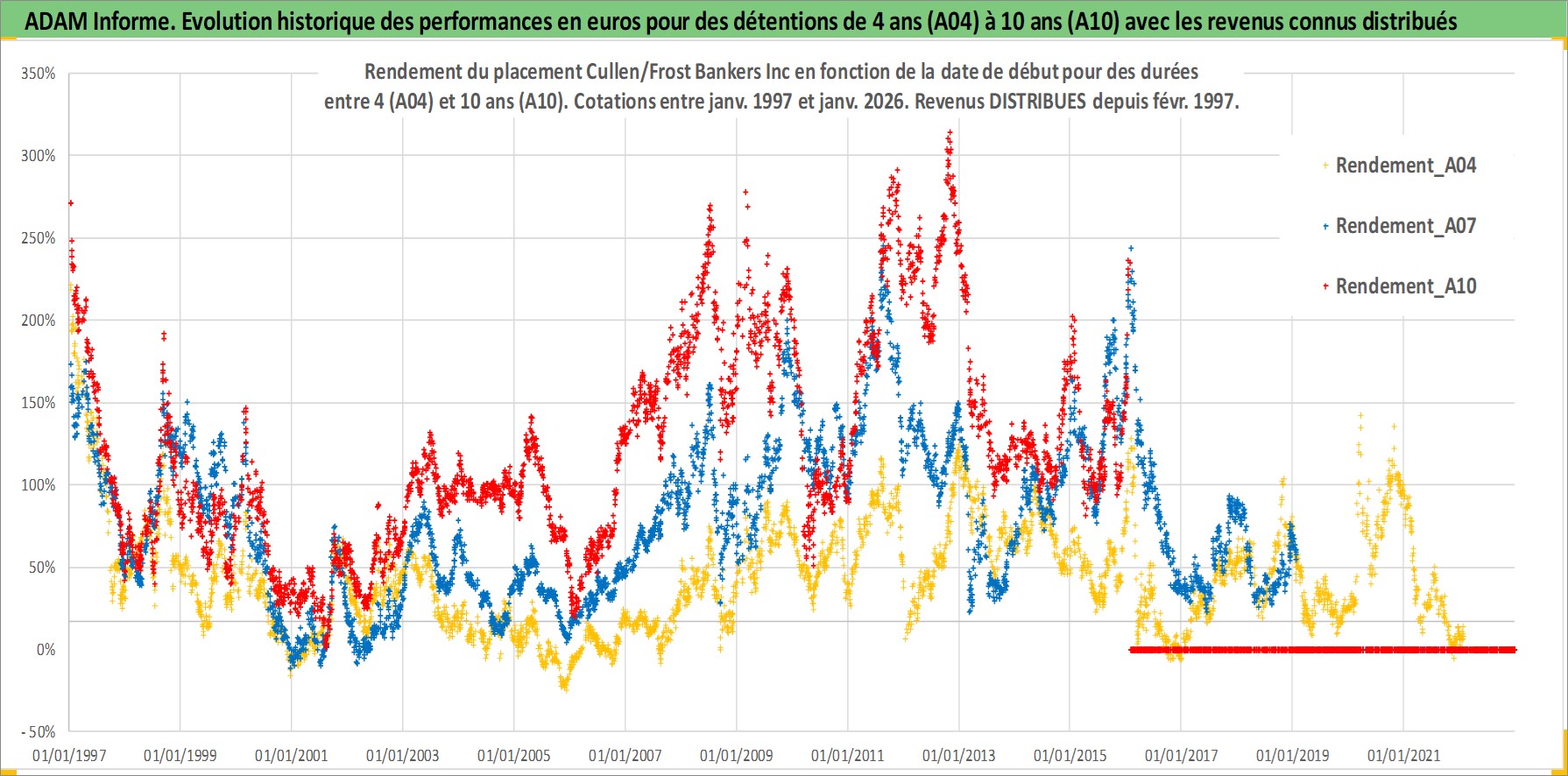 Site dédié aux investisseursPage dédiée sur site financeAnalyse des valorisations hebdomadaires de l'action Cullen/Frost Bankers Inc. Cet actif est cote en USD. Les valorisations sont en contrevaleur EURO et couvrent les semaines 1997W01 a 2026W05. Les revenus de cet actif financier sont pris en compte depuis la semaine 1997W09. La note globale ESG de cet actif est estimee a 5.0 (apres rebasage entre 0 et 20).