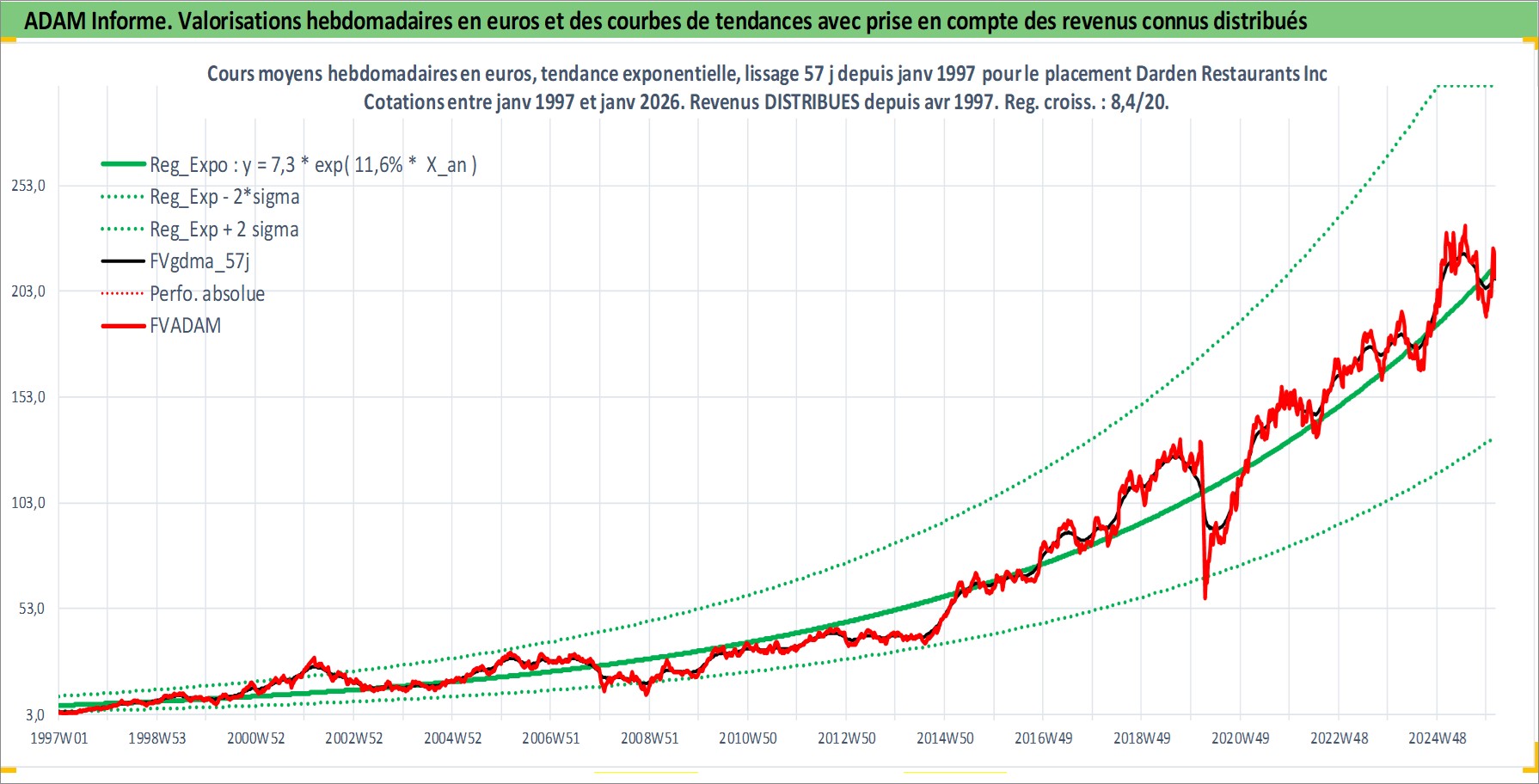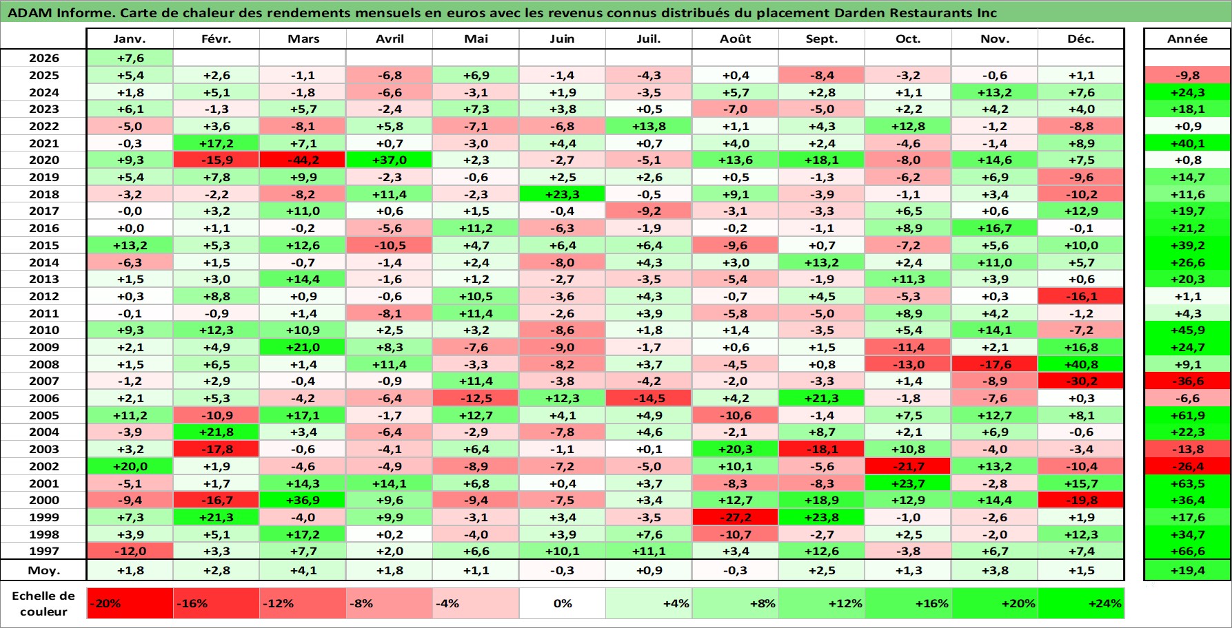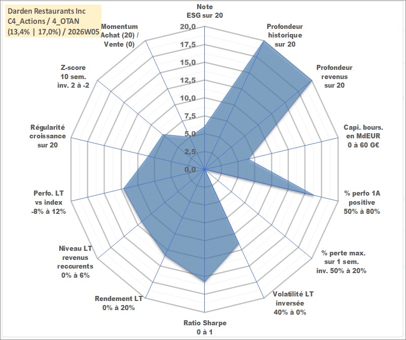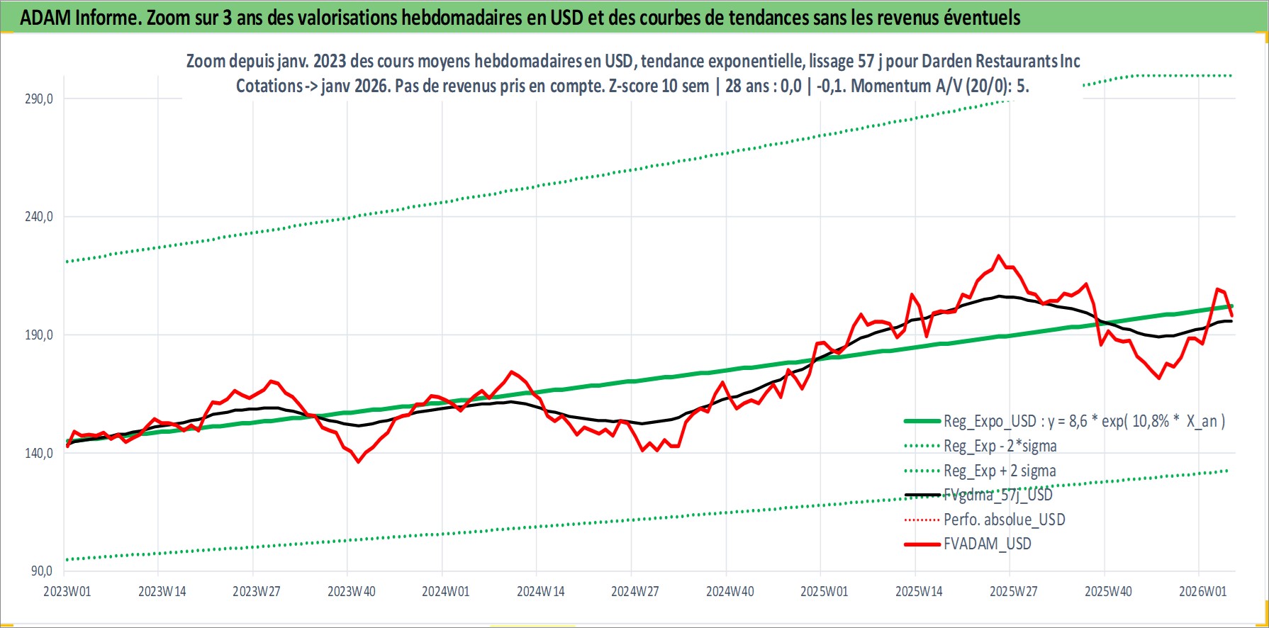 Site dédié aux investisseursPage dédiée sur site financeAnalyse des valorisations hebdomadaires de l'action Darden Restaurants Inc. Cet actif est cote en USD. Les valorisations sont en contrevaleur EURO et couvrent les semaines 1997W01 a 2026W05. Les revenus de cet actif financier sont pris en compte depuis la semaine 1997W15. La note globale ESG de cet actif est estimee a 6.0 (apres rebasage entre 0 et 20).