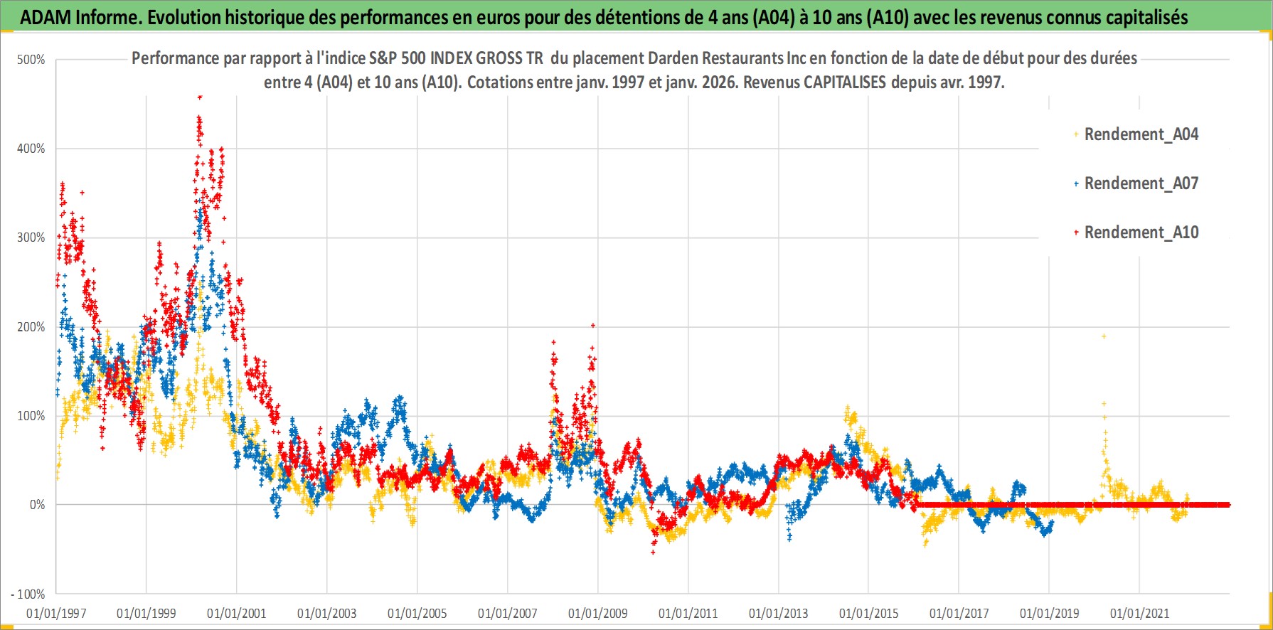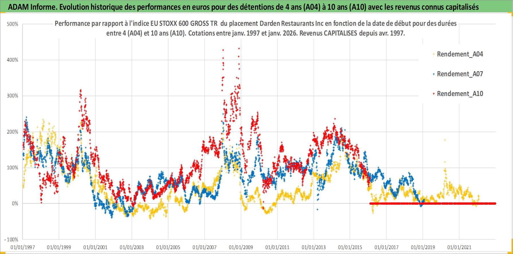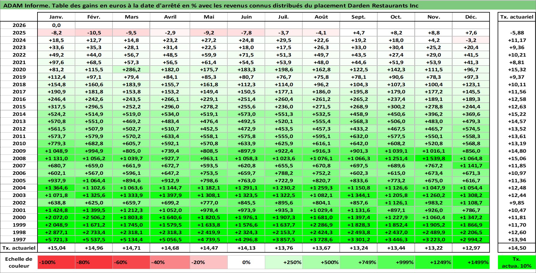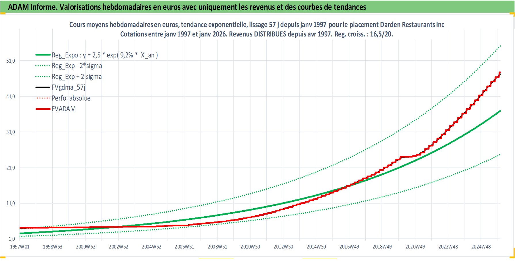 Site dédié aux investisseursPage dédiée sur site financeAnalyse des valorisations hebdomadaires de l'action Darden Restaurants Inc. Cet actif est cote en USD. Les valorisations sont en contrevaleur EURO et couvrent les semaines 1997W01 a 2026W05. Les revenus de cet actif financier sont pris en compte depuis la semaine 1997W15. La note globale ESG de cet actif est estimee a 6.0 (apres rebasage entre 0 et 20).