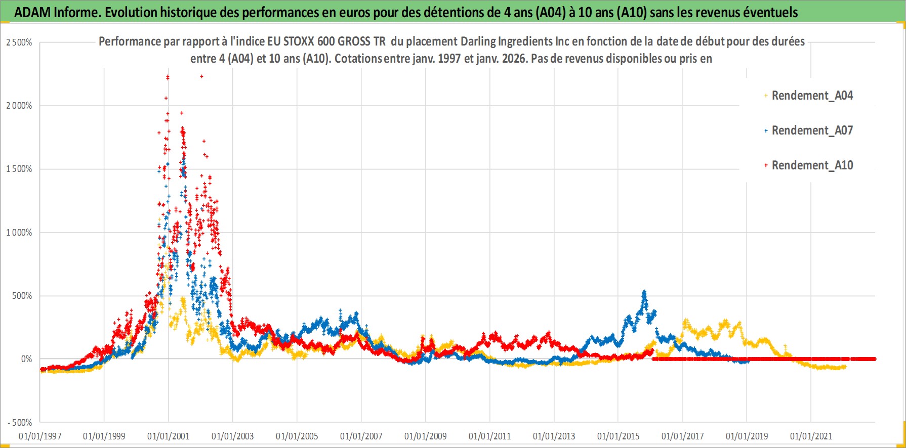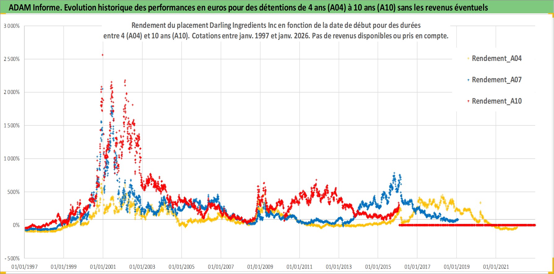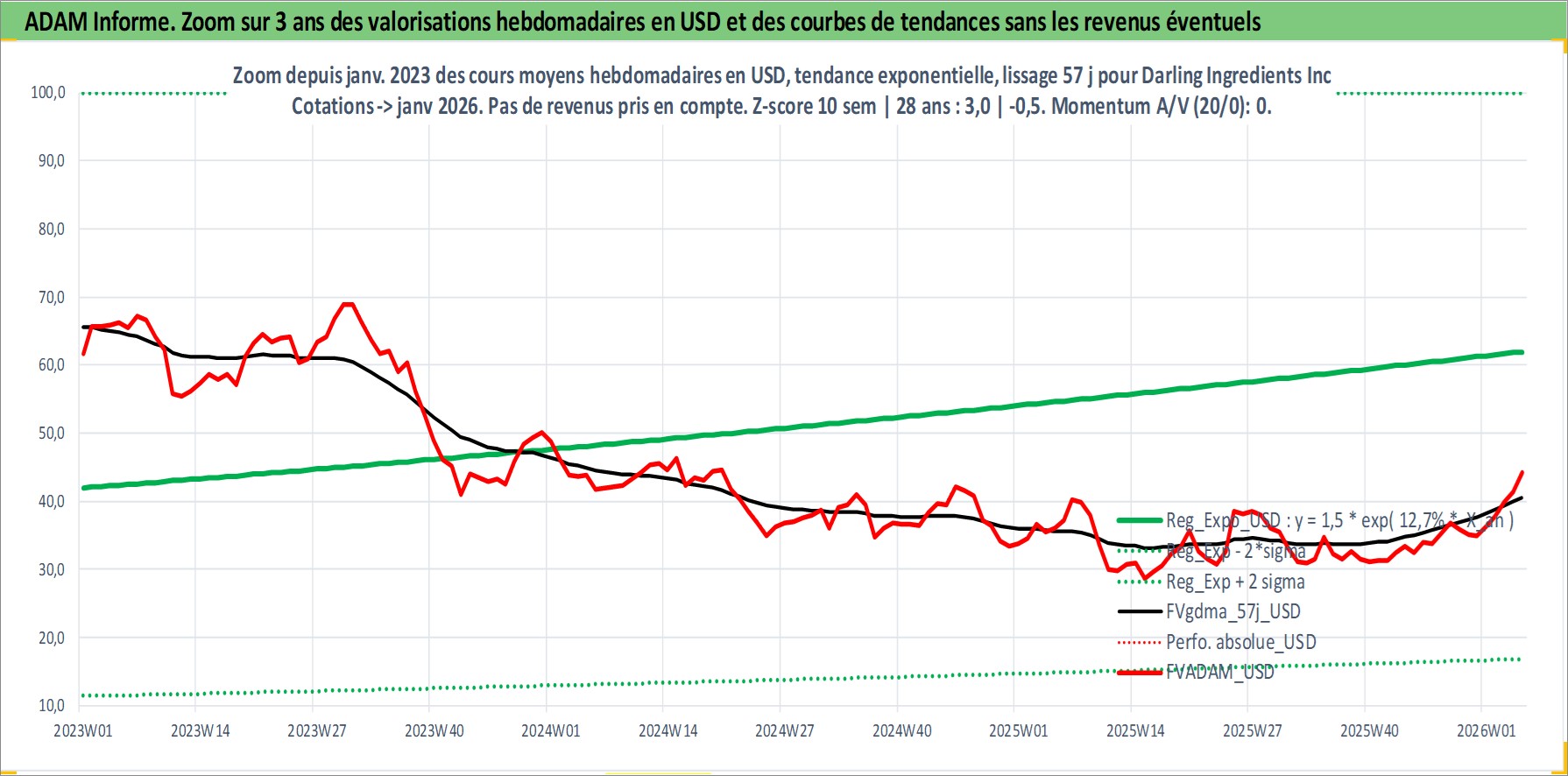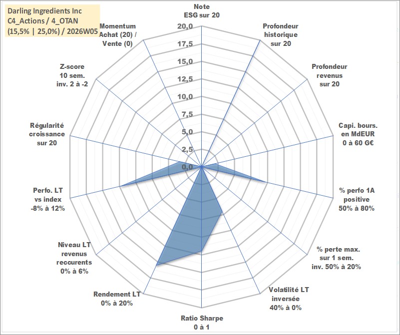 Site dédié aux investisseursPage dédiée sur site financeAnalyse des valorisations hebdomadaires de l'action Darling Ingredients Inc. Cet actif est cote en USD. Les valorisations sont en contrevaleur EURO et couvrent les semaines 1997W01 a 2026W05. Les revenus de cet actif financier ne sont pas connus car non existants ou non disponibles sur le site Yahoo Finance. La note ESG de cet actif n'est pas connue.