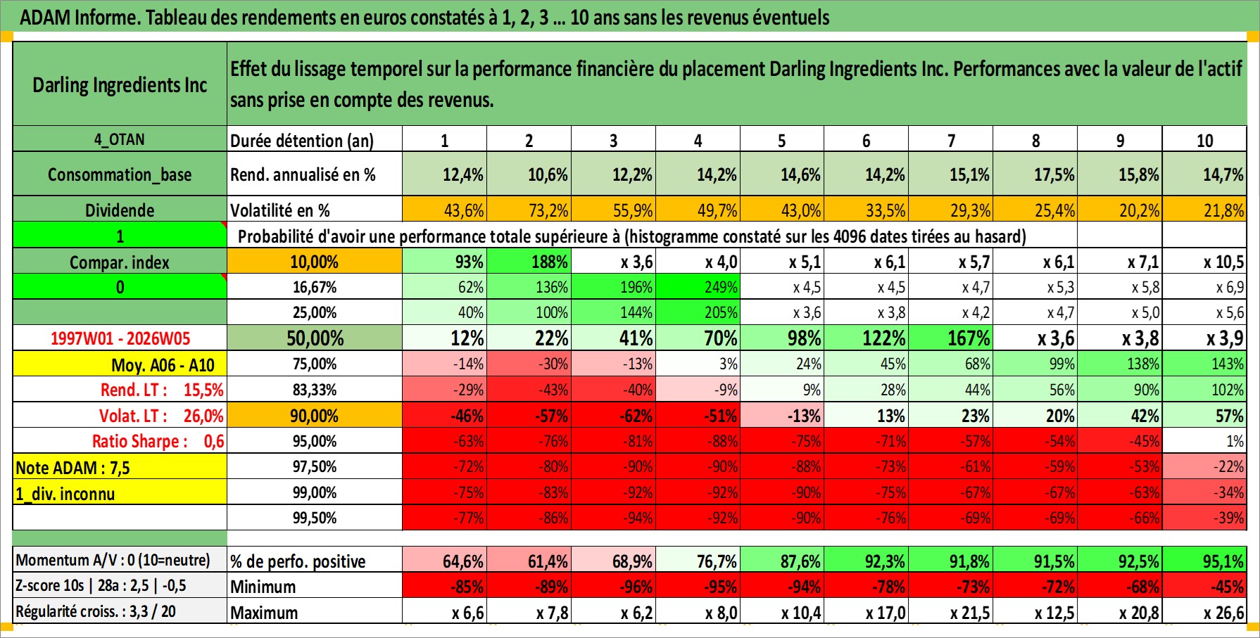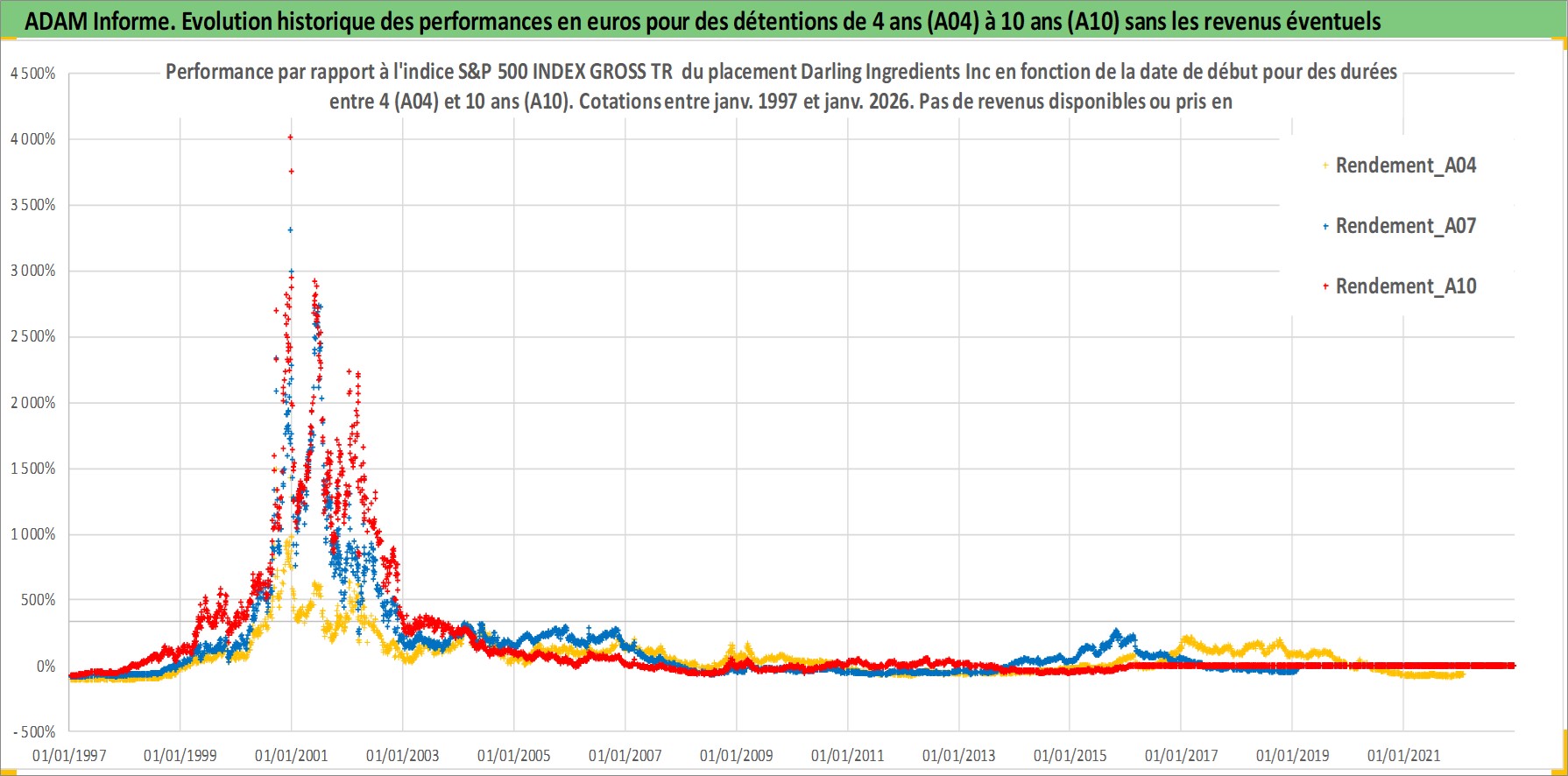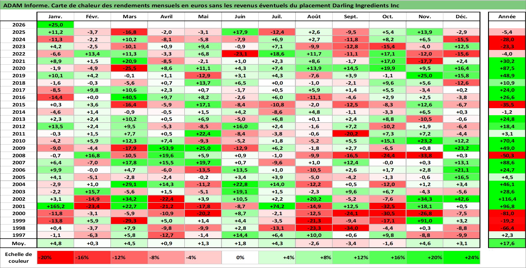 Site dédié aux investisseursPage dédiée sur site financeAnalyse des valorisations hebdomadaires de l'action Darling Ingredients Inc. Cet actif est cote en USD. Les valorisations sont en contrevaleur EURO et couvrent les semaines 1997W01 a 2026W05. Les revenus de cet actif financier ne sont pas connus car non existants ou non disponibles sur le site Yahoo Finance. La note ESG de cet actif n'est pas connue.