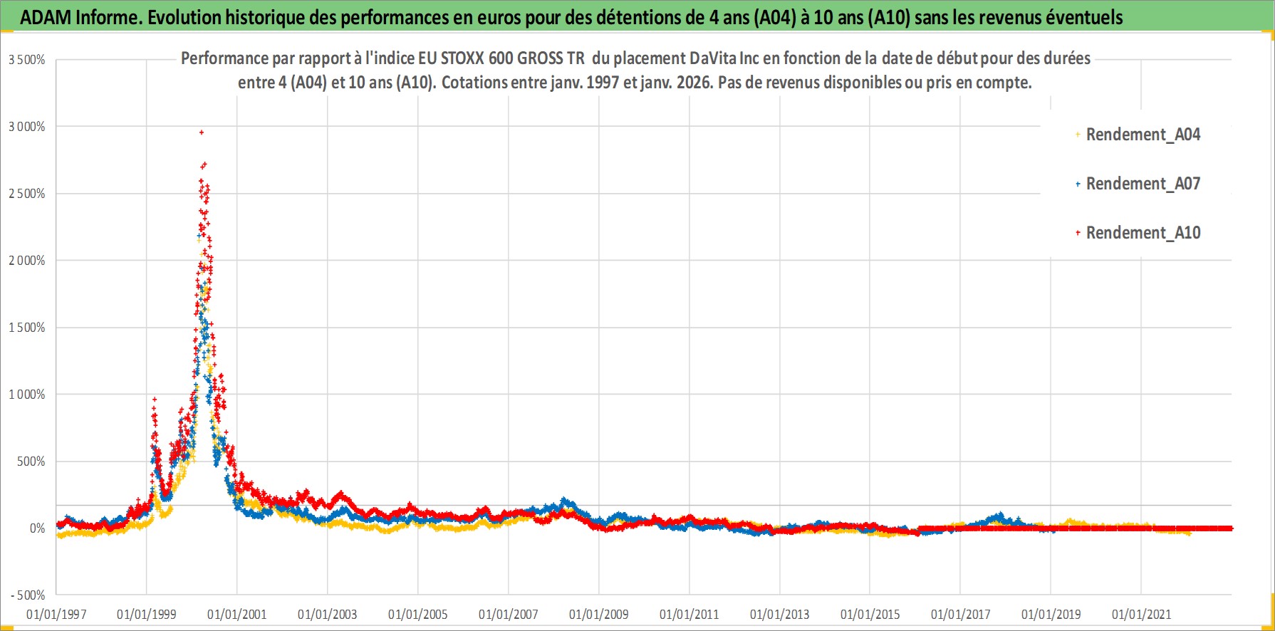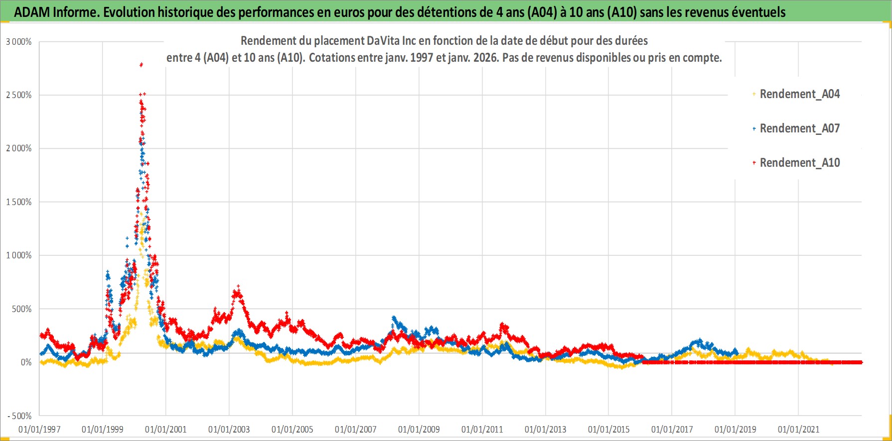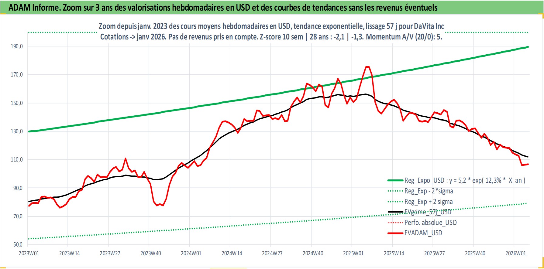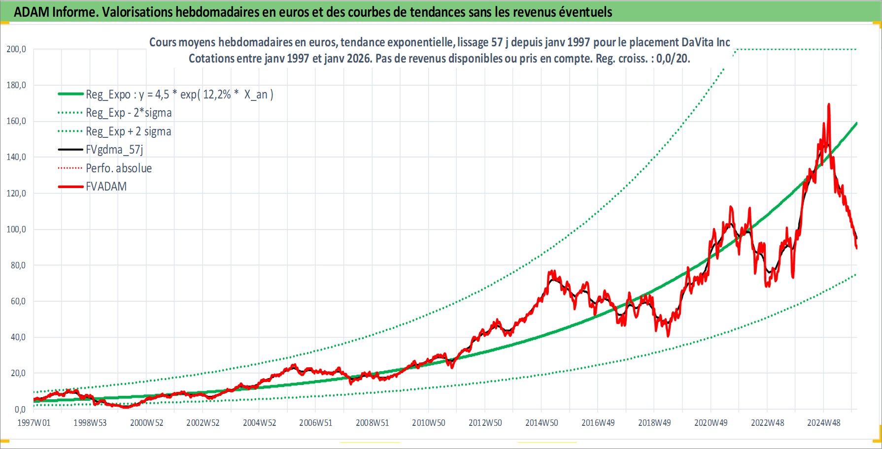 Site dédié aux investisseursPage dédiée sur site financeAnalyse des valorisations hebdomadaires de l'action DaVita Inc. Cet actif est cote en USD. Les valorisations sont en contrevaleur EURO et couvrent les semaines 1997W01 a 2026W05. Les revenus de cet actif financier ne sont pas connus car non existants ou non disponibles sur le site Yahoo Finance. La note globale ESG de cet actif est estimee a 9.0 (apres rebasage entre 0 et 20).