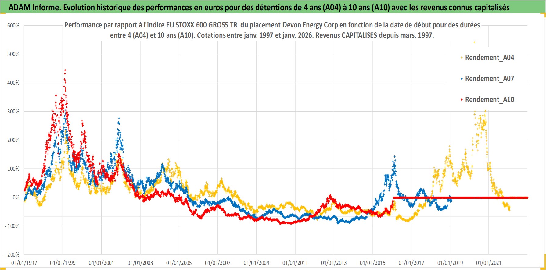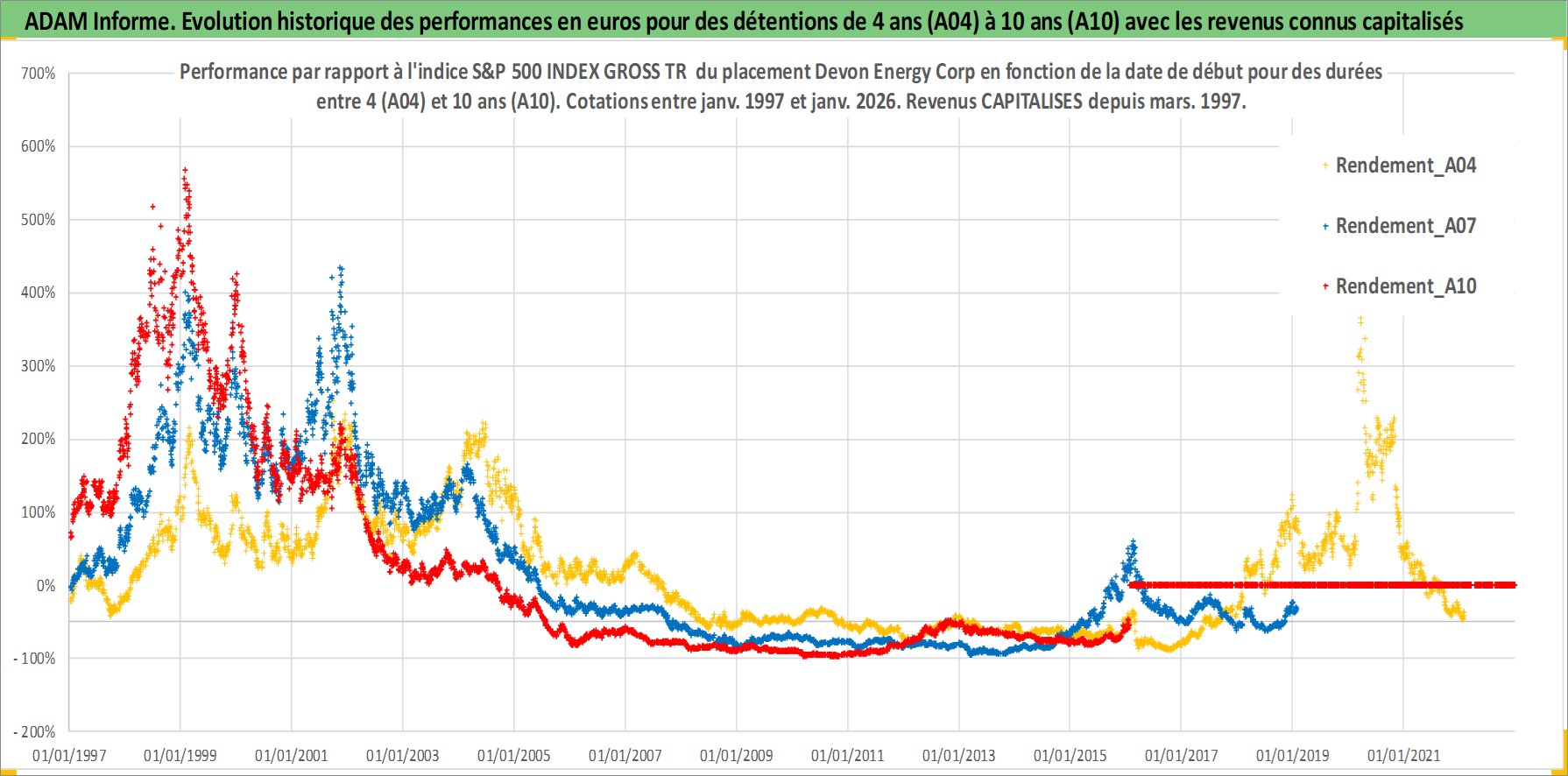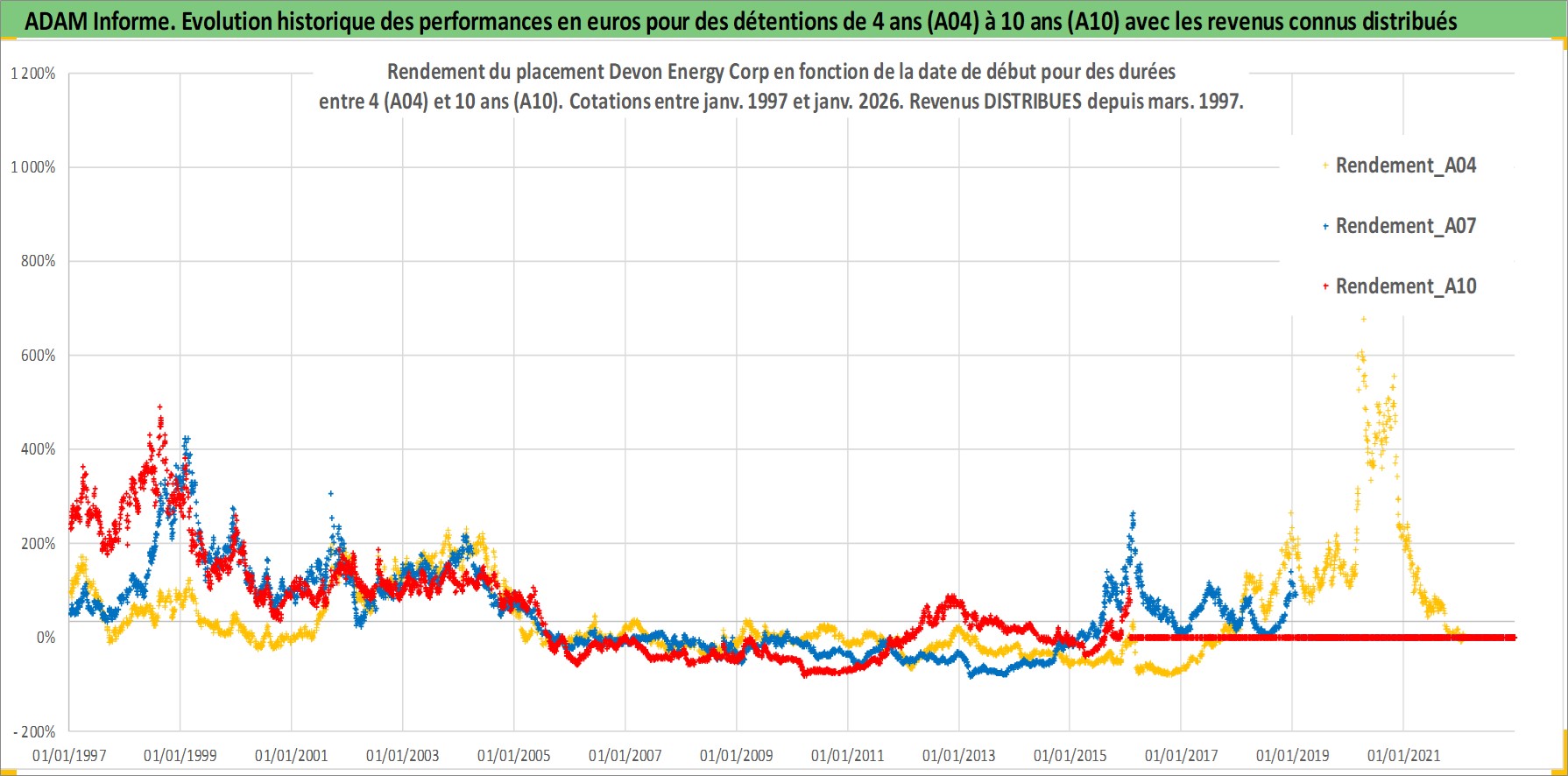 Site dédié aux investisseursPage dédiée sur site financeAnalyse des valorisations hebdomadaires de l'action Devon Energy Corp. Cet actif est cote en USD. Les valorisations sont en contrevaleur EURO et couvrent les semaines 1997W01 a 2026W05. Les revenus de cet actif financier sont pris en compte depuis la semaine 1997W11. La note globale ESG de cet actif est estimee a 3.0 (apres rebasage entre 0 et 20).