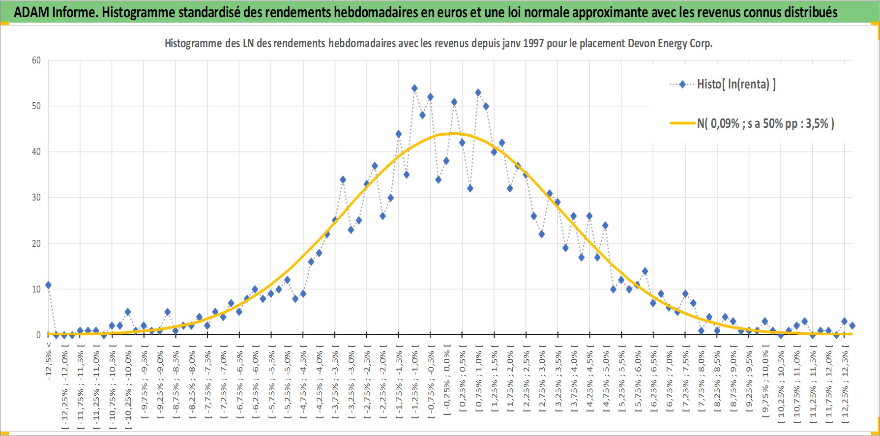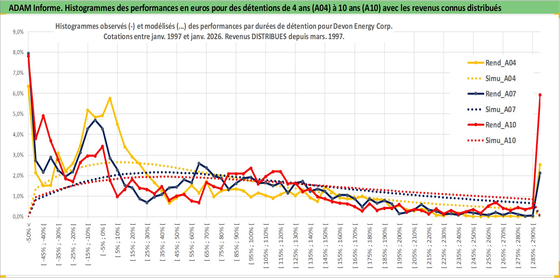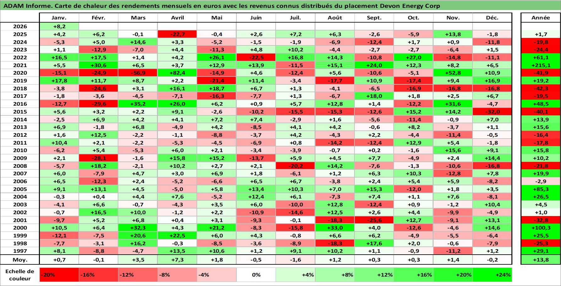 Site dédié aux investisseursPage dédiée sur site financeAnalyse des valorisations hebdomadaires de l'action Devon Energy Corp. Cet actif est cote en USD. Les valorisations sont en contrevaleur EURO et couvrent les semaines 1997W01 a 2026W05. Les revenus de cet actif financier sont pris en compte depuis la semaine 1997W11. La note globale ESG de cet actif est estimee a 3.0 (apres rebasage entre 0 et 20).