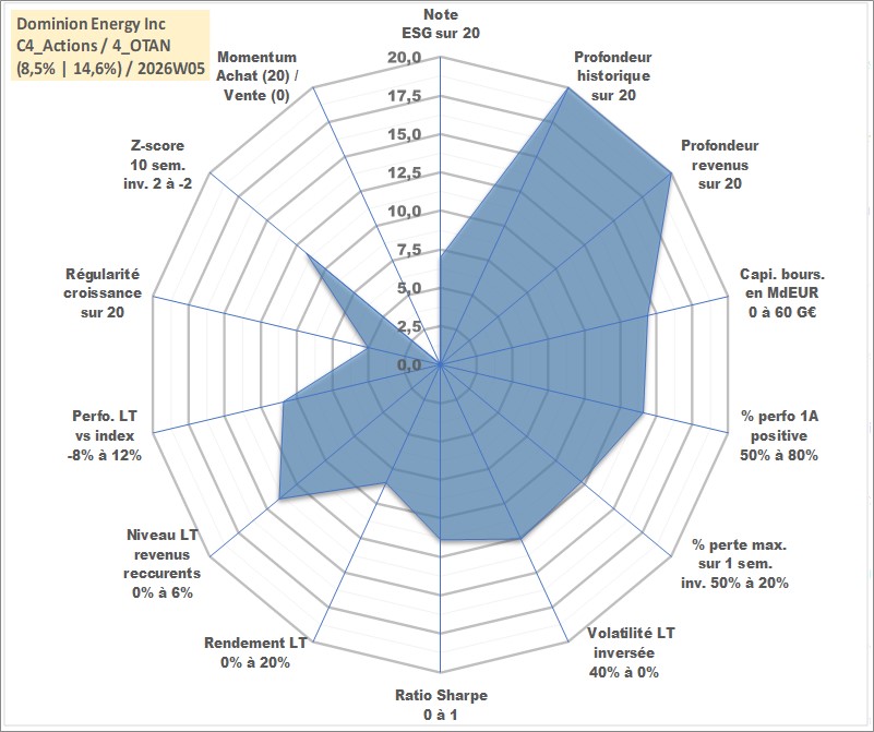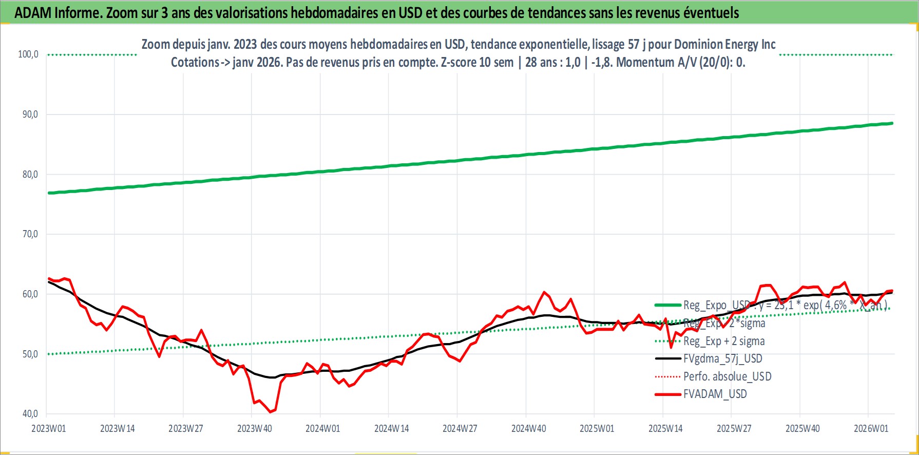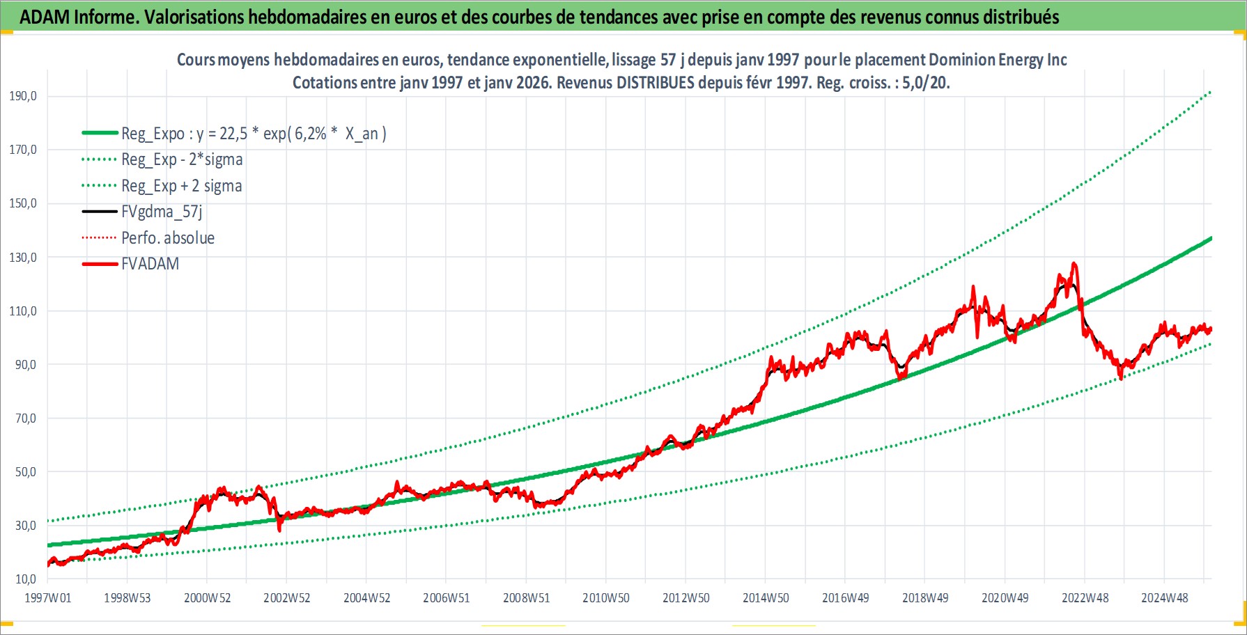 Site dédié aux investisseursPage dédiée sur site financeAnalyse des valorisations hebdomadaires de l'action Dominion Energy Inc. Cet actif est cote en USD. Les valorisations sont en contrevaleur EURO et couvrent les semaines 1997W01 a 2026W05. Les revenus de cet actif financier sont pris en compte depuis la semaine 1997W09. La note globale ESG de cet actif est estimee a 7.0 (apres rebasage entre 0 et 20).