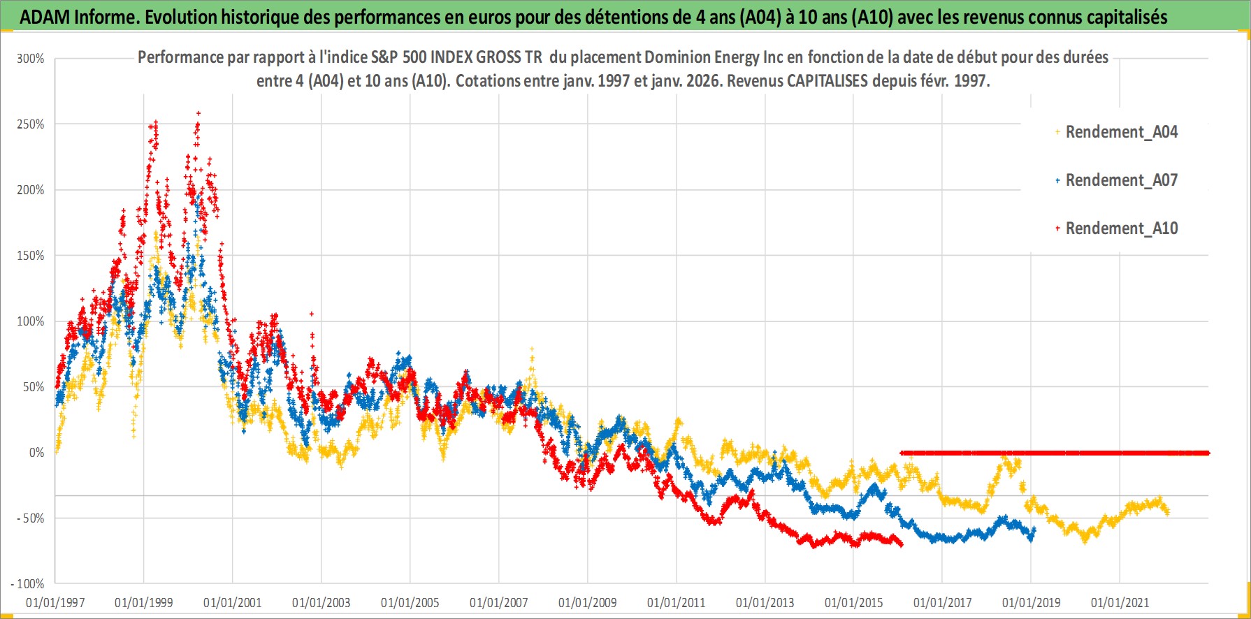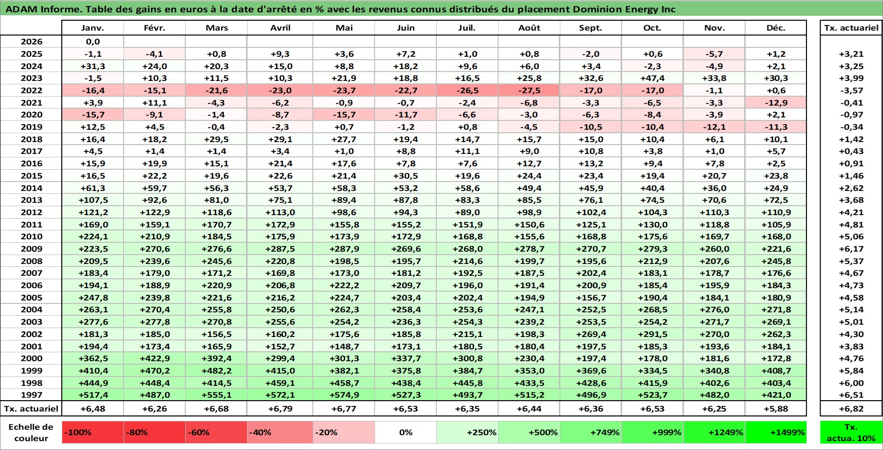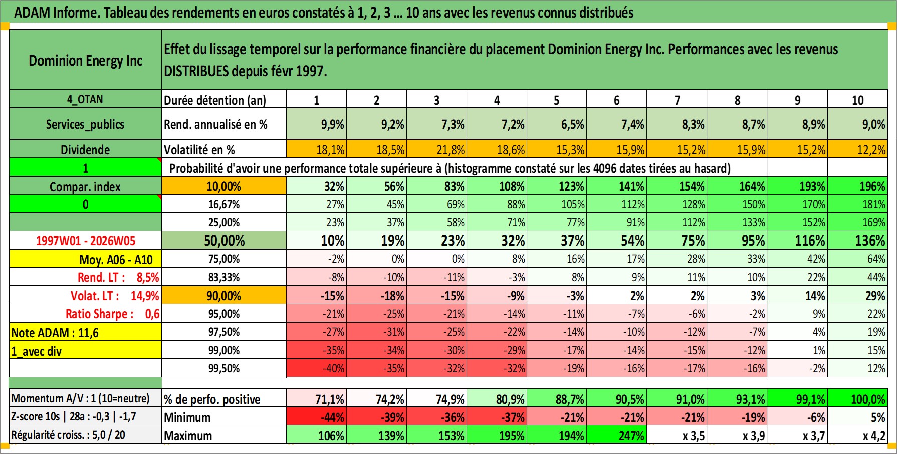 Site dédié aux investisseursPage dédiée sur site financeAnalyse des valorisations hebdomadaires de l'action Dominion Energy Inc. Cet actif est cote en USD. Les valorisations sont en contrevaleur EURO et couvrent les semaines 1997W01 a 2026W05. Les revenus de cet actif financier sont pris en compte depuis la semaine 1997W09. La note globale ESG de cet actif est estimee a 7.0 (apres rebasage entre 0 et 20).