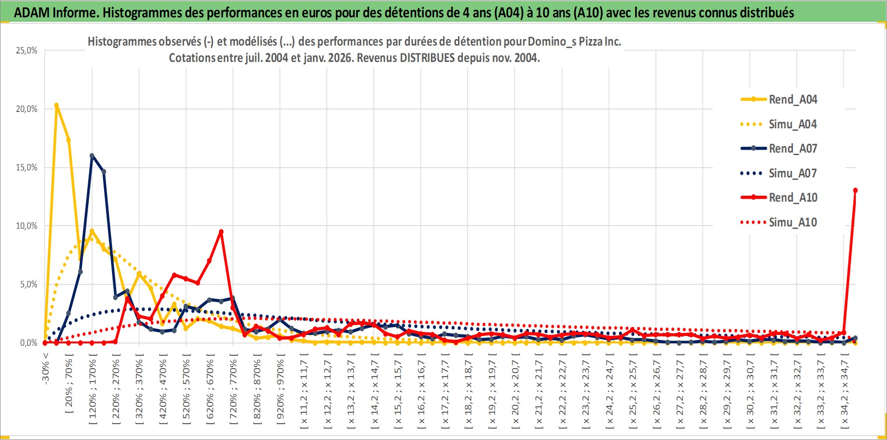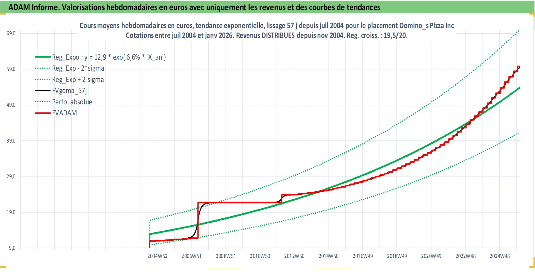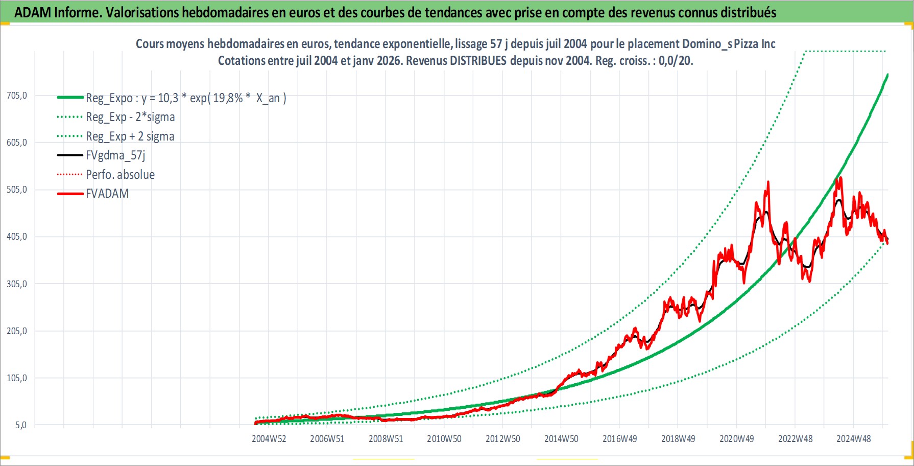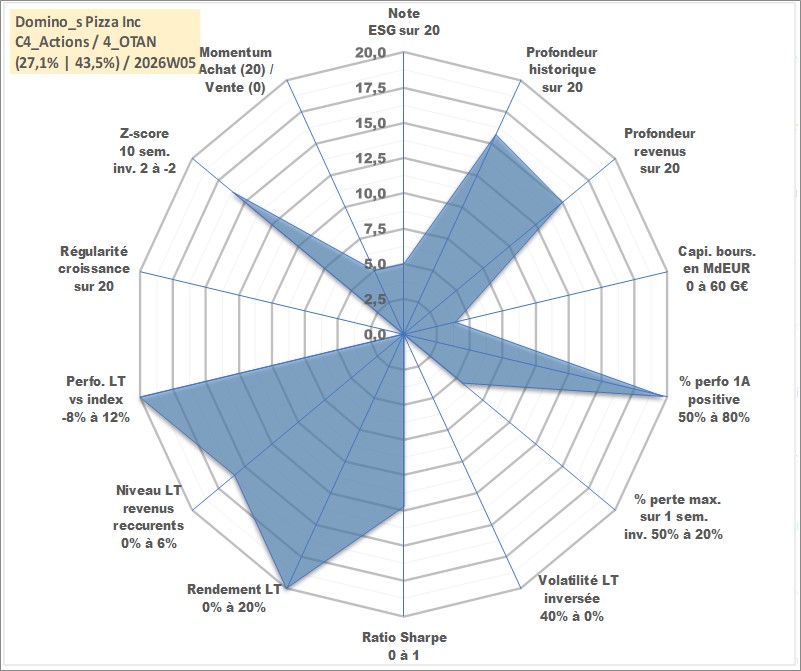Site dédié aux investisseursPage dédiée sur site financeAnalyse des valorisations hebdomadaires de l'action Domino_s Pizza Inc. Cet actif est cote en USD. Les valorisations sont en contrevaleur EURO et couvrent les semaines 2004W29 a 2026W05. Les revenus de cet actif financier sont pris en compte depuis la semaine 2004W49. La note globale ESG de cet actif est estimee a 5.0 (apres rebasage entre 0 et 20).