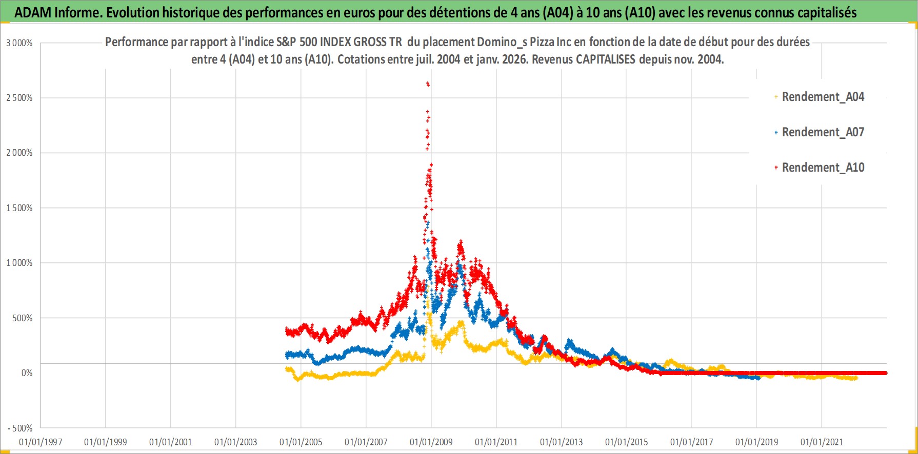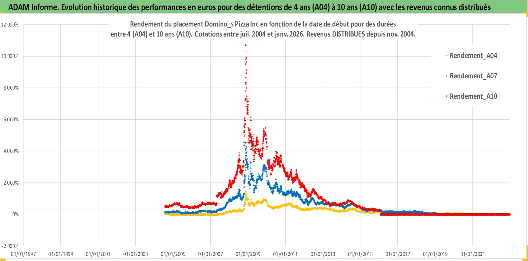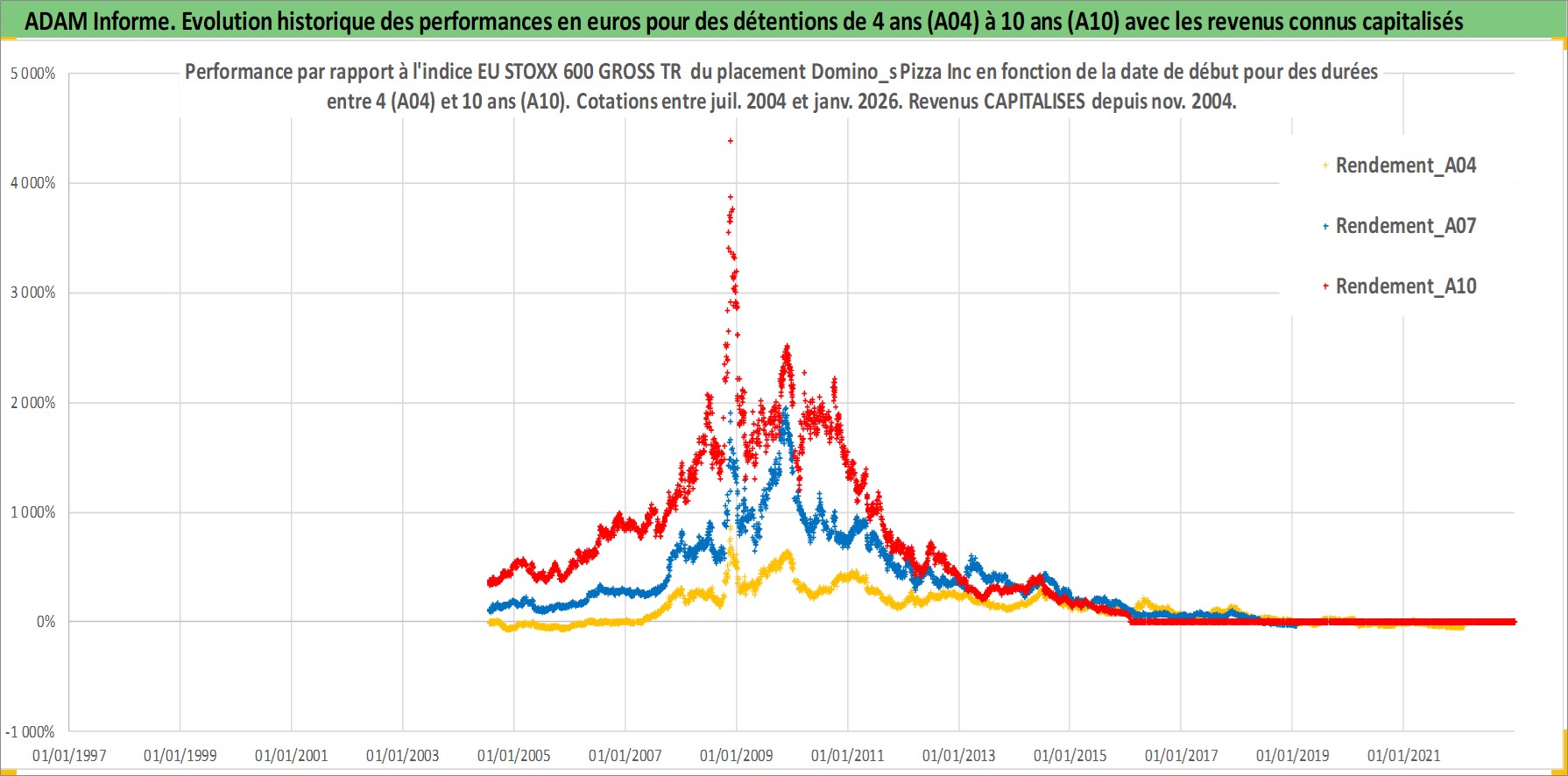 Site dédié aux investisseursPage dédiée sur site financeAnalyse des valorisations hebdomadaires de l'action Domino_s Pizza Inc. Cet actif est cote en USD. Les valorisations sont en contrevaleur EURO et couvrent les semaines 2004W29 a 2026W05. Les revenus de cet actif financier sont pris en compte depuis la semaine 2004W49. La note globale ESG de cet actif est estimee a 5.0 (apres rebasage entre 0 et 20).
