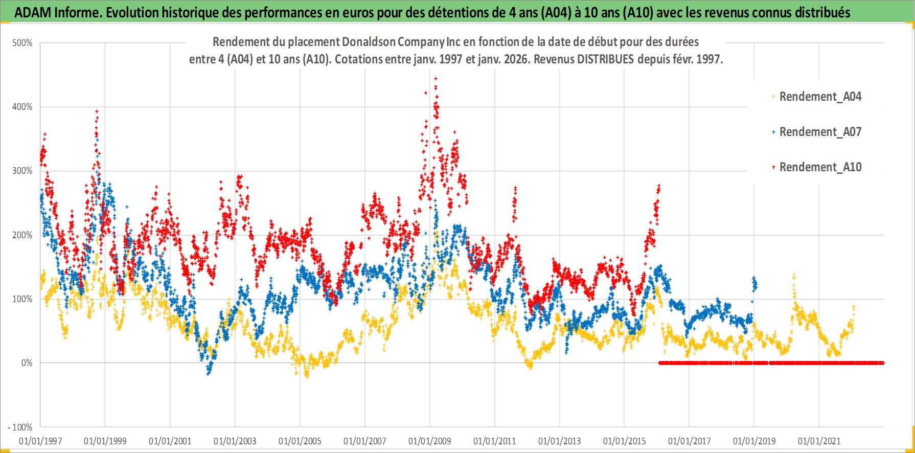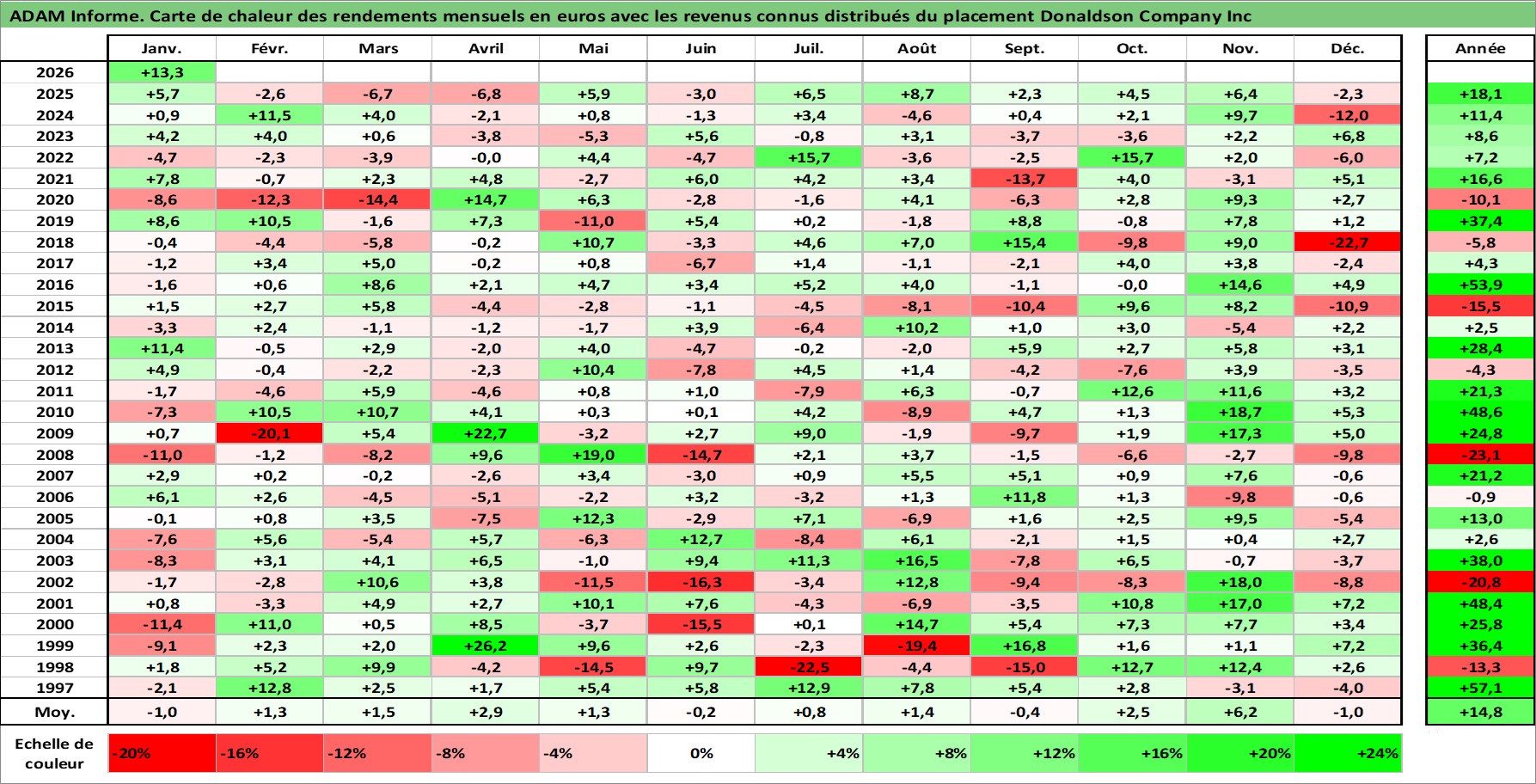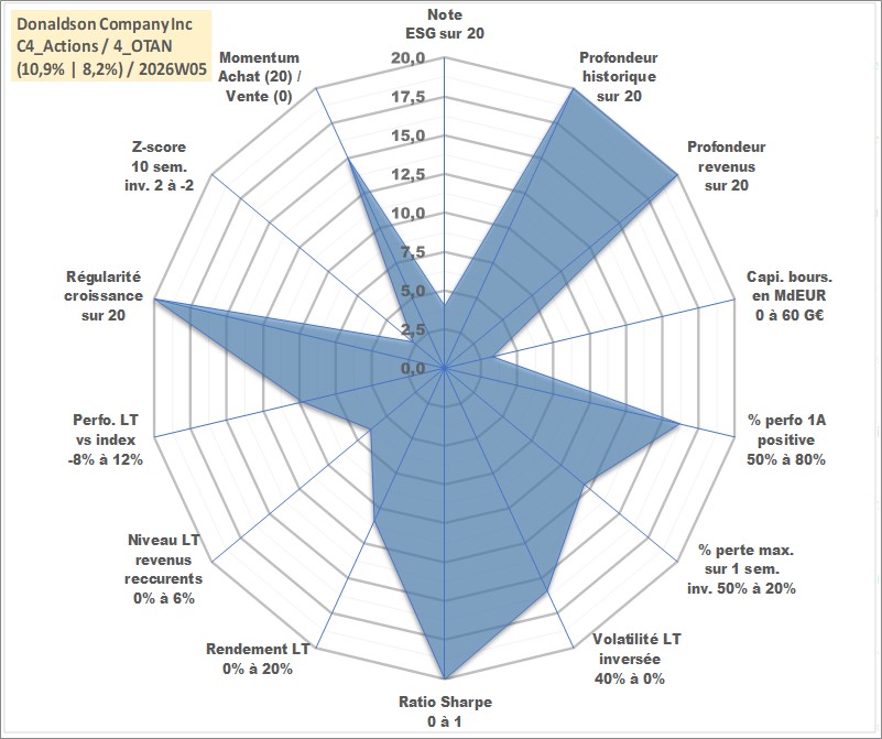 Site dédié aux investisseursPage dédiée sur site financeAnalyse des valorisations hebdomadaires de l'action Donaldson Company Inc. Cet actif est cote en USD. Les valorisations sont en contrevaleur EURO et couvrent les semaines 1997W01 a 2026W05. Les revenus de cet actif financier sont pris en compte depuis la semaine 1997W09. La note globale ESG de cet actif est estimee a 4.0 (apres rebasage entre 0 et 20).