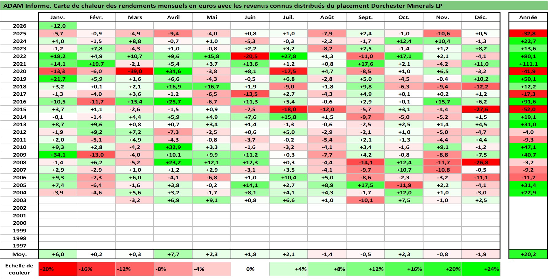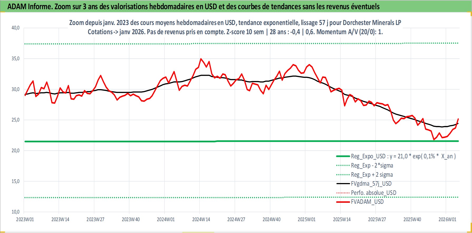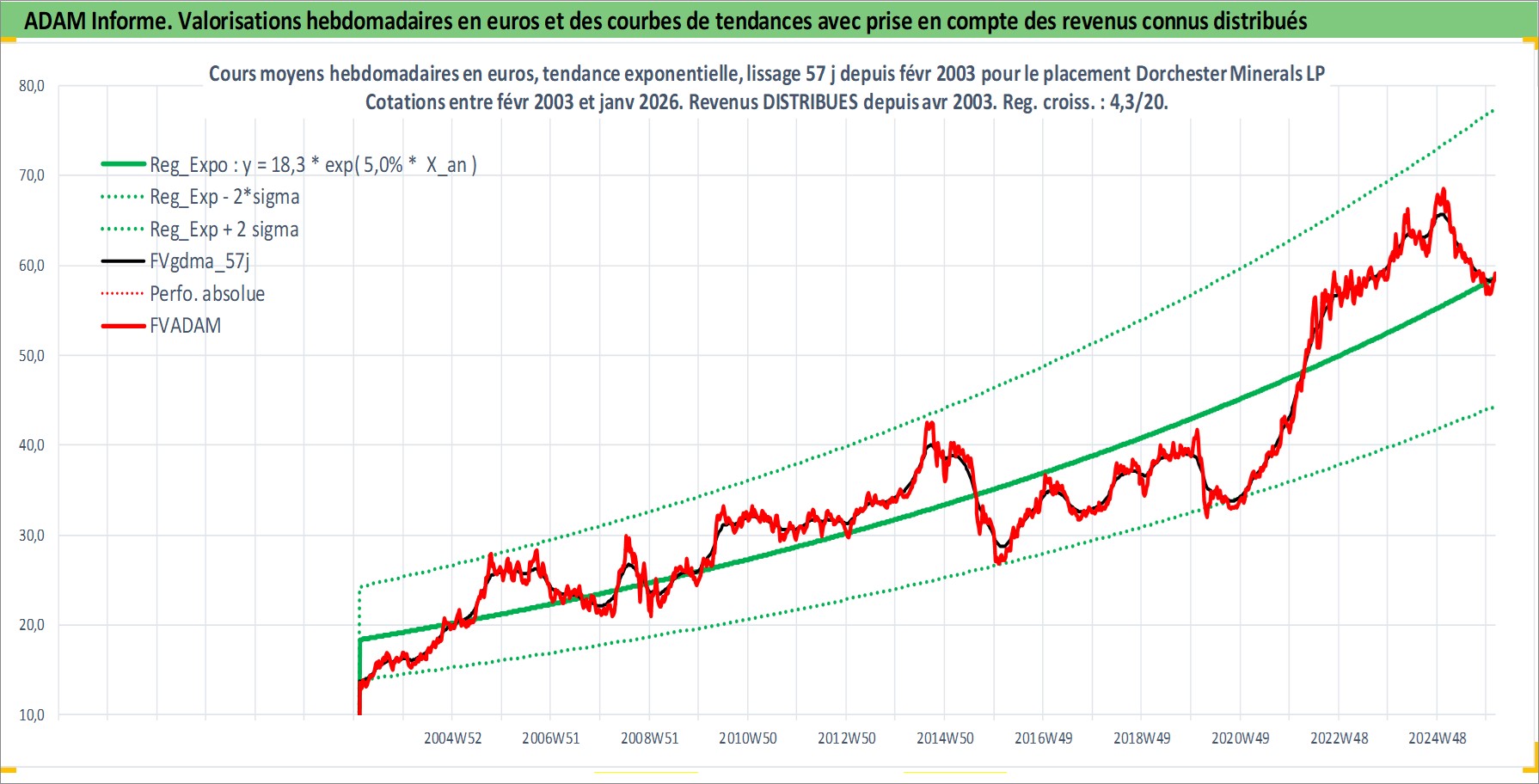 Site dédié aux investisseursPage dédiée sur site financeAnalyse des valorisations hebdomadaires de l'action Dorchester Minerals LP. Cet actif est cote en USD. Les valorisations sont en contrevaleur EURO et couvrent les semaines 2003W06 a 2026W05. Les revenus de cet actif financier sont pris en compte depuis la semaine 2003W17. La note ESG de cet actif n'est pas connue.