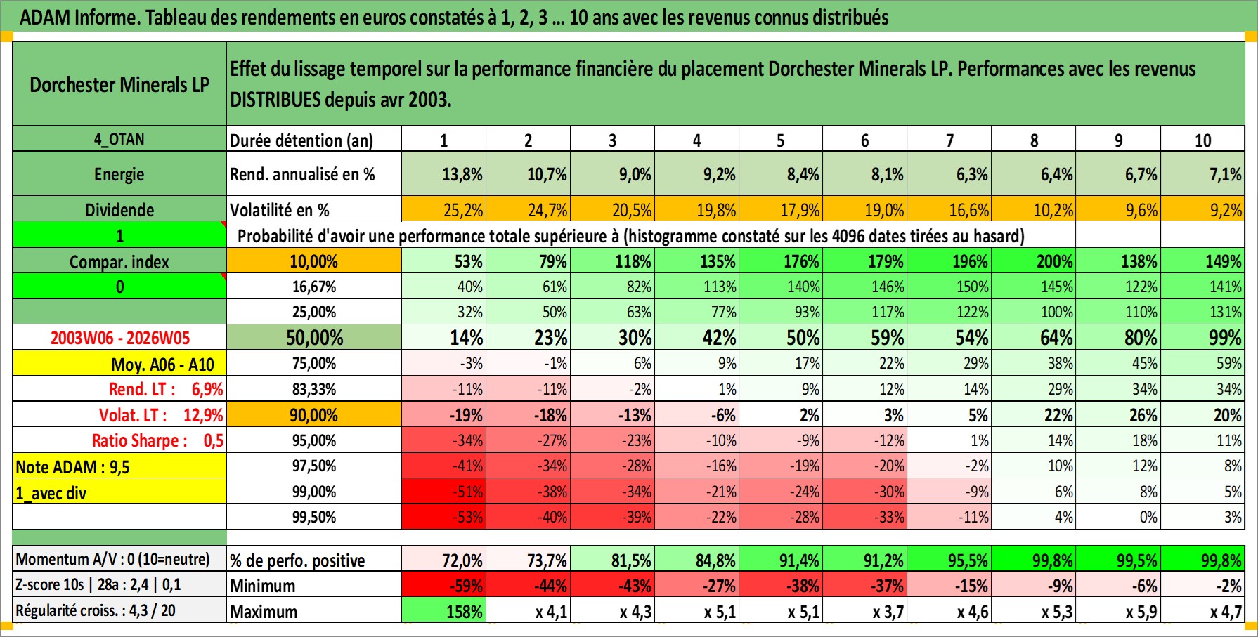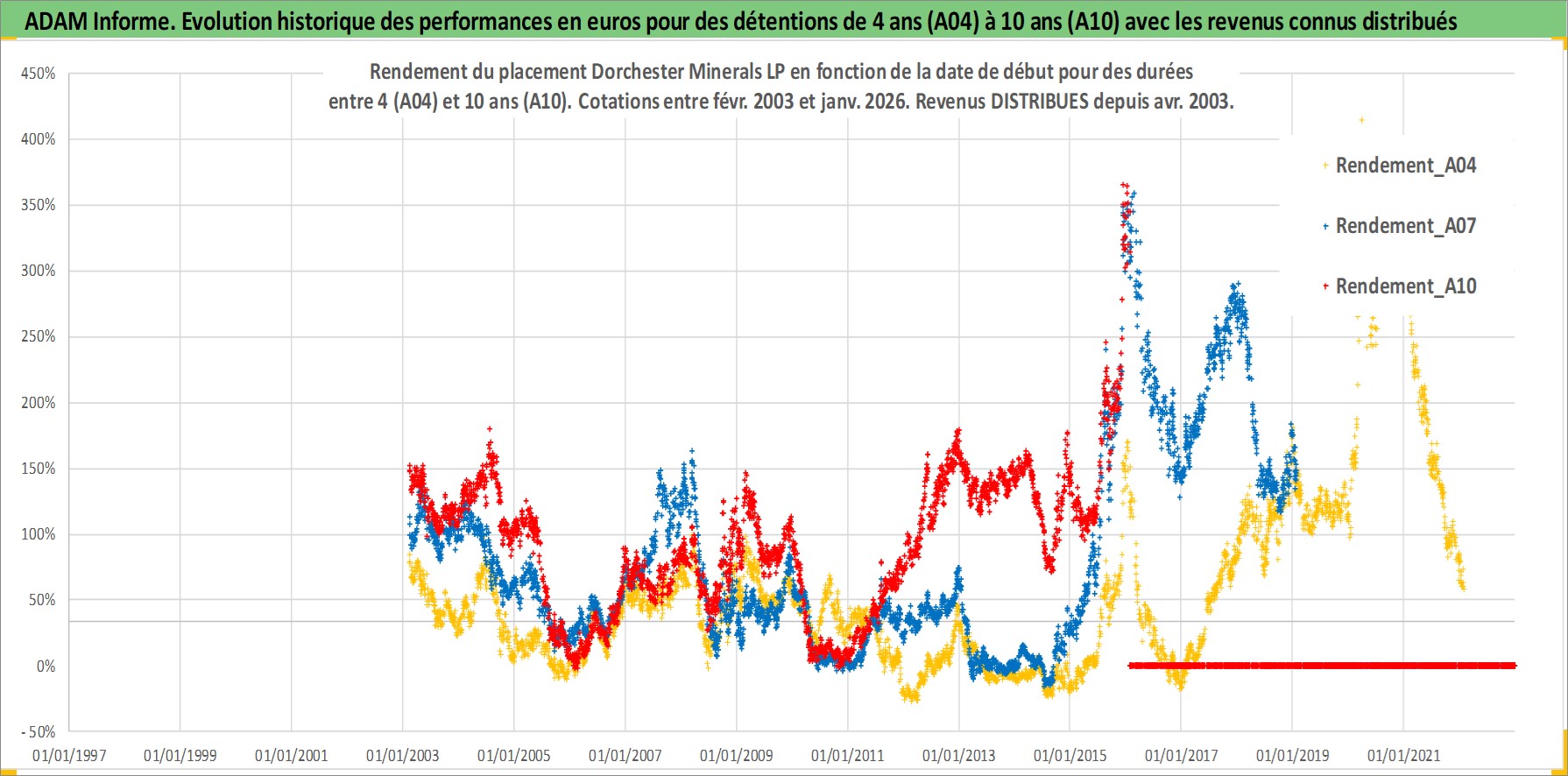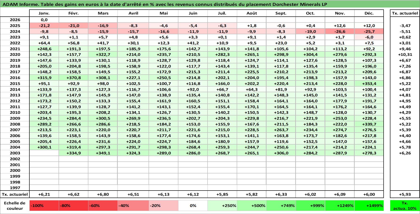 Site dédié aux investisseursPage dédiée sur site financeAnalyse des valorisations hebdomadaires de l'action Dorchester Minerals LP. Cet actif est cote en USD. Les valorisations sont en contrevaleur EURO et couvrent les semaines 2003W06 a 2026W05. Les revenus de cet actif financier sont pris en compte depuis la semaine 2003W17. La note ESG de cet actif n'est pas connue.