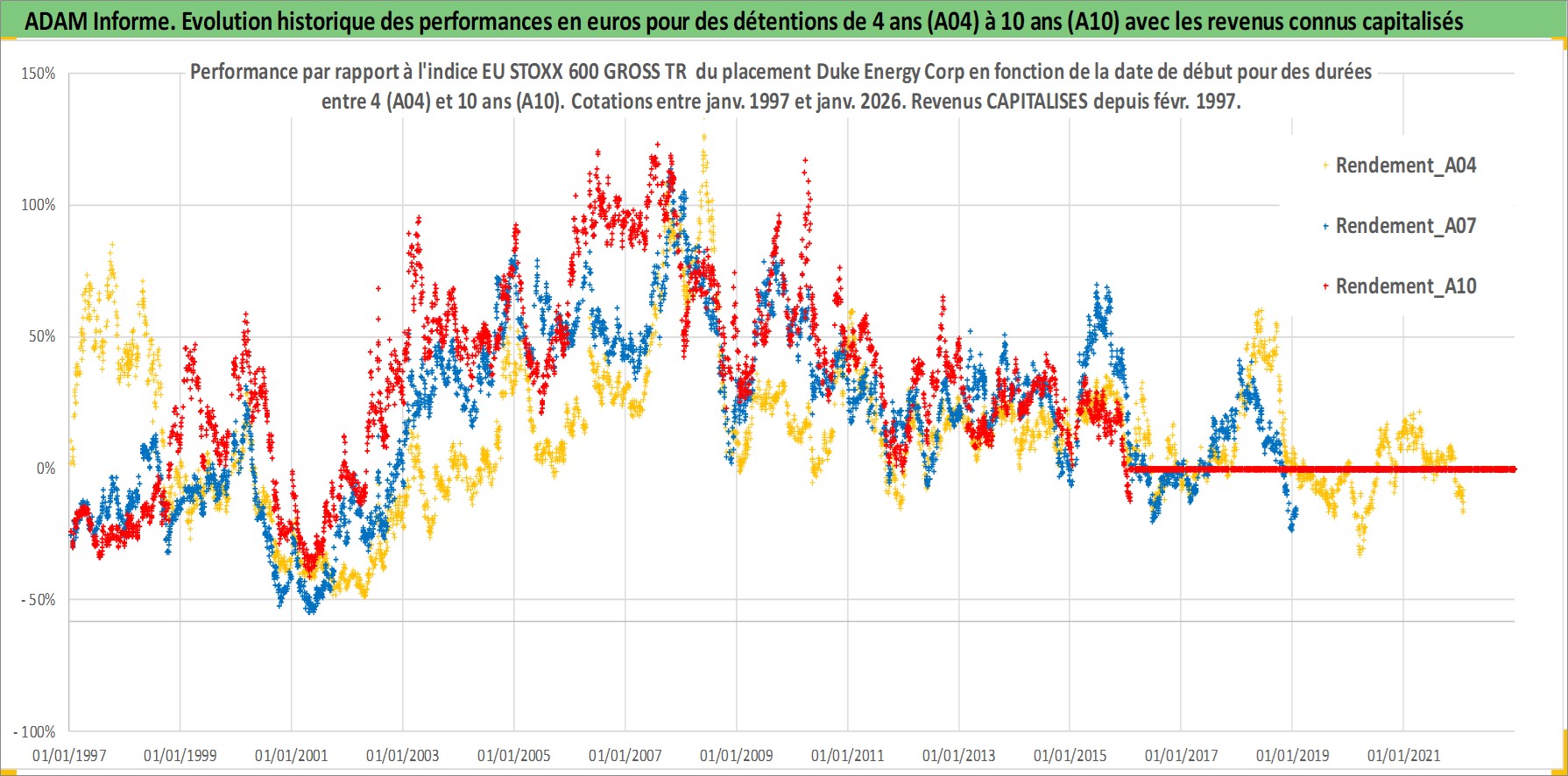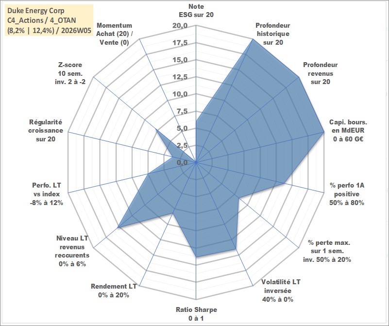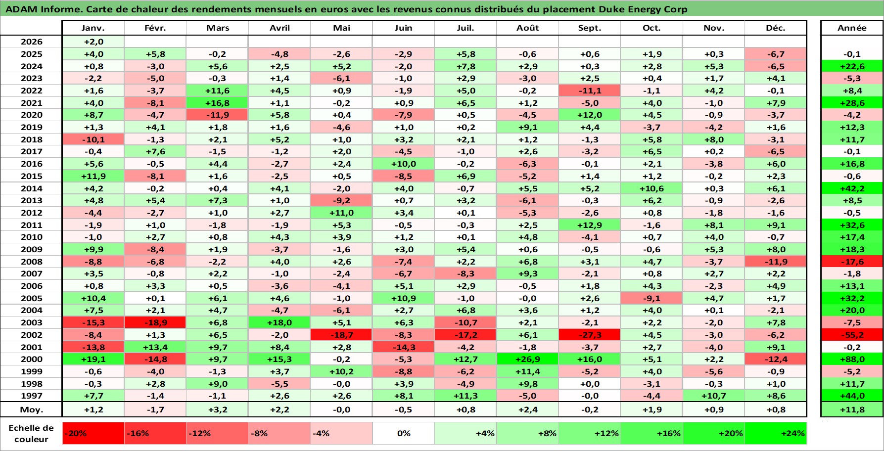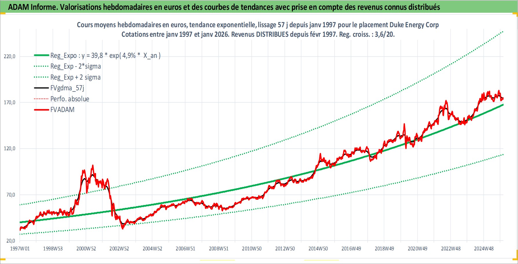 Site dédié aux investisseursPage dédiée sur site financeAnalyse des valorisations hebdomadaires de l'action Duke Energy Corp. Cet actif est cote en USD. Les valorisations sont en contrevaleur EURO et couvrent les semaines 1997W01 a 2026W05. Les revenus de cet actif financier sont pris en compte depuis la semaine 1997W07. La note globale ESG de cet actif est estimee a 6.0 (apres rebasage entre 0 et 20).