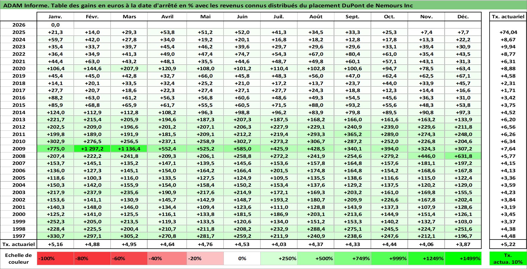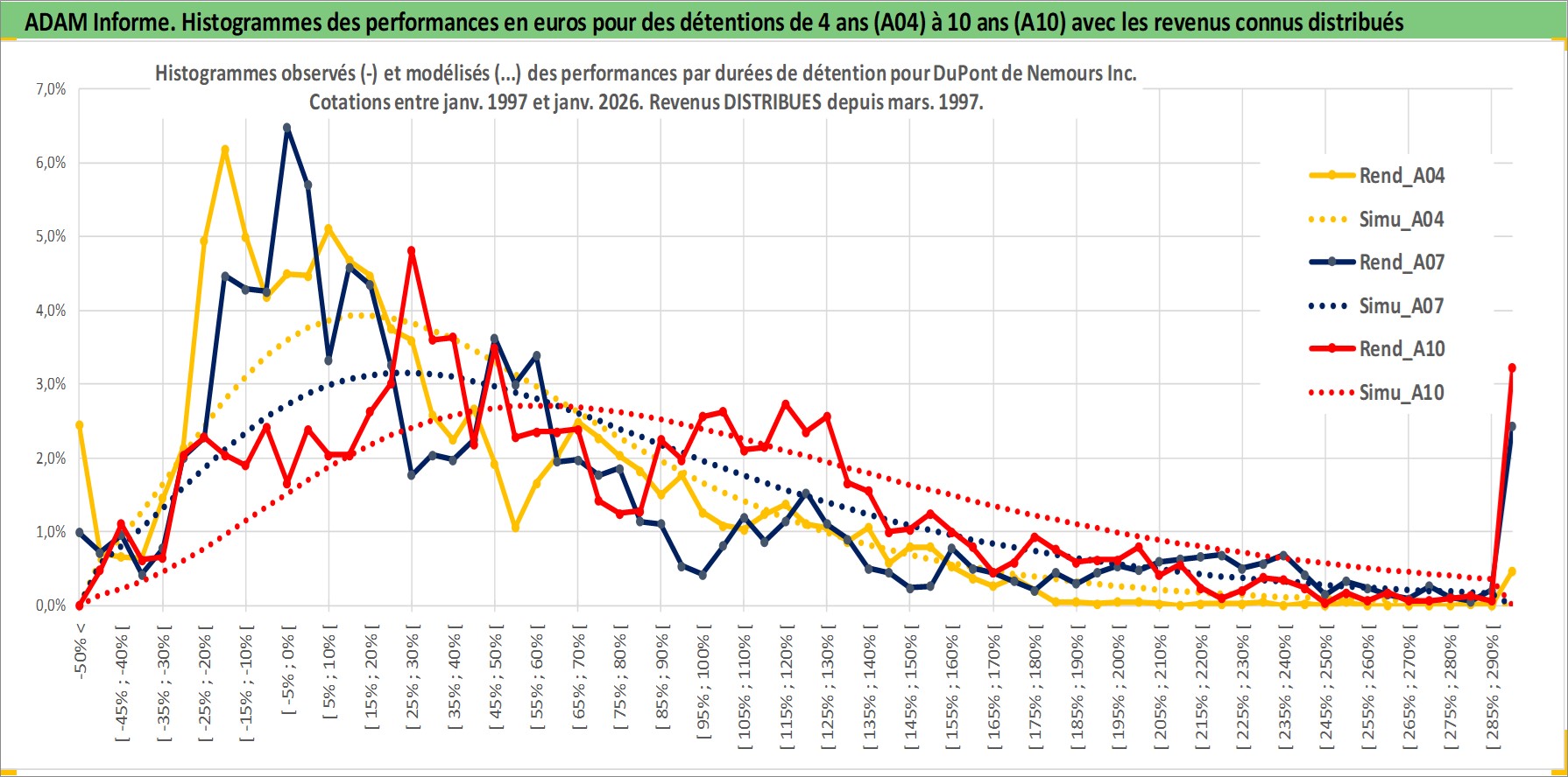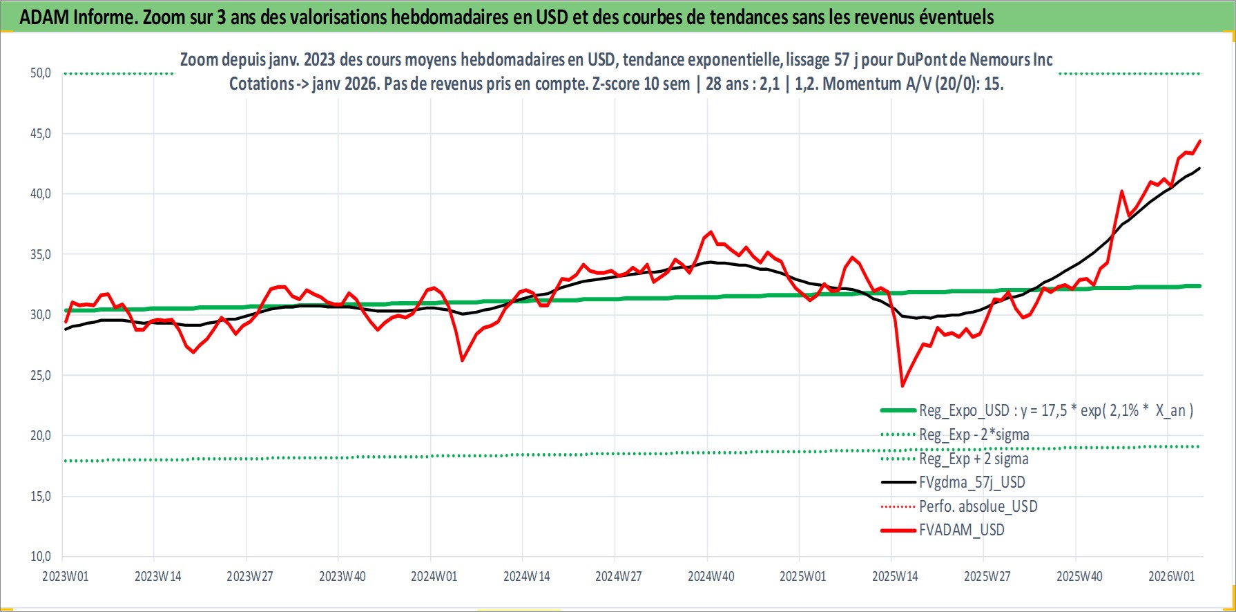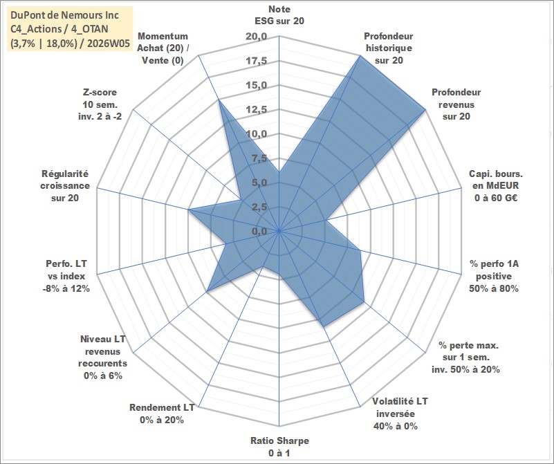 Site dédié aux investisseursPage dédiée sur site financeAnalyse des valorisations hebdomadaires de l'action DuPont de Nemours Inc. Cet actif est cote en USD. Les valorisations sont en contrevaleur EURO et couvrent les semaines 1997W01 a 2026W05. Les revenus de cet actif financier sont pris en compte depuis la semaine 1997W13. La note globale ESG de cet actif est estimee a 6.0 (apres rebasage entre 0 et 20).
