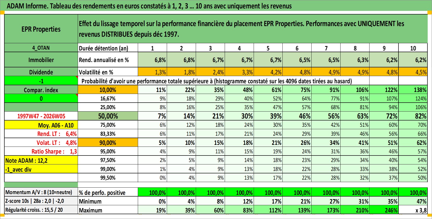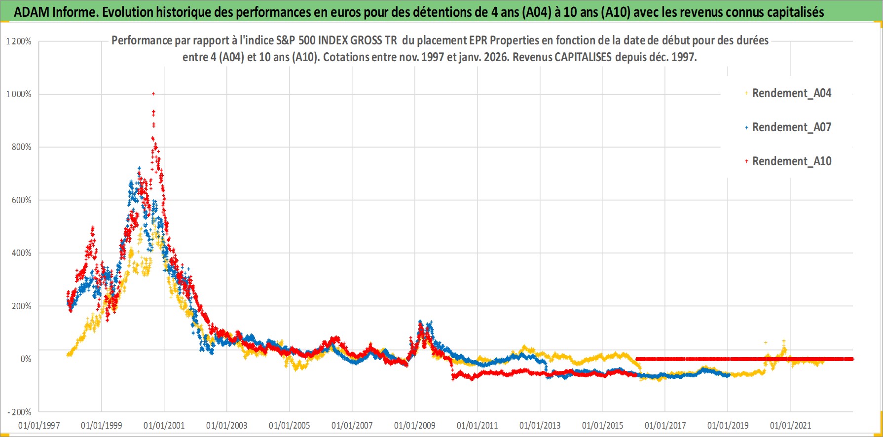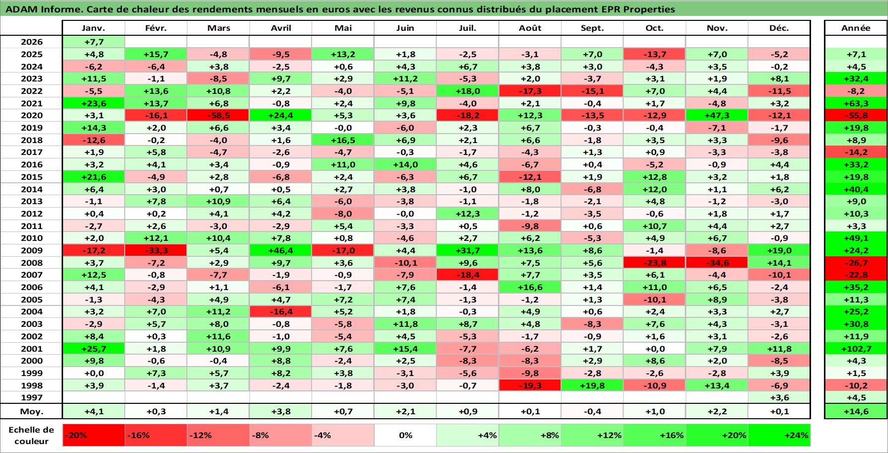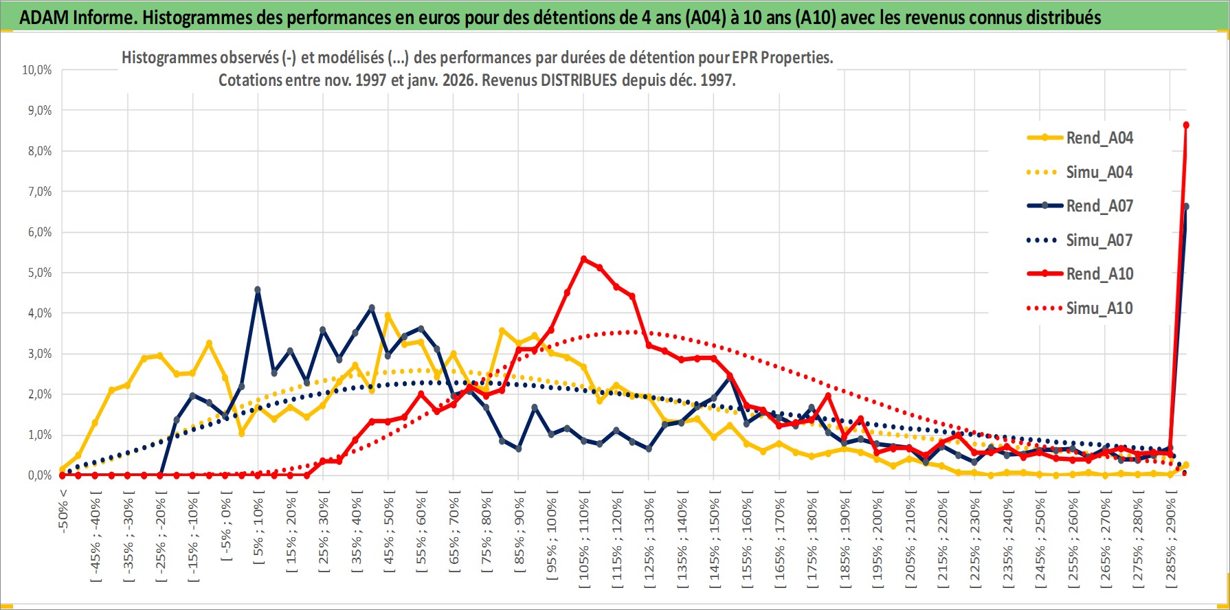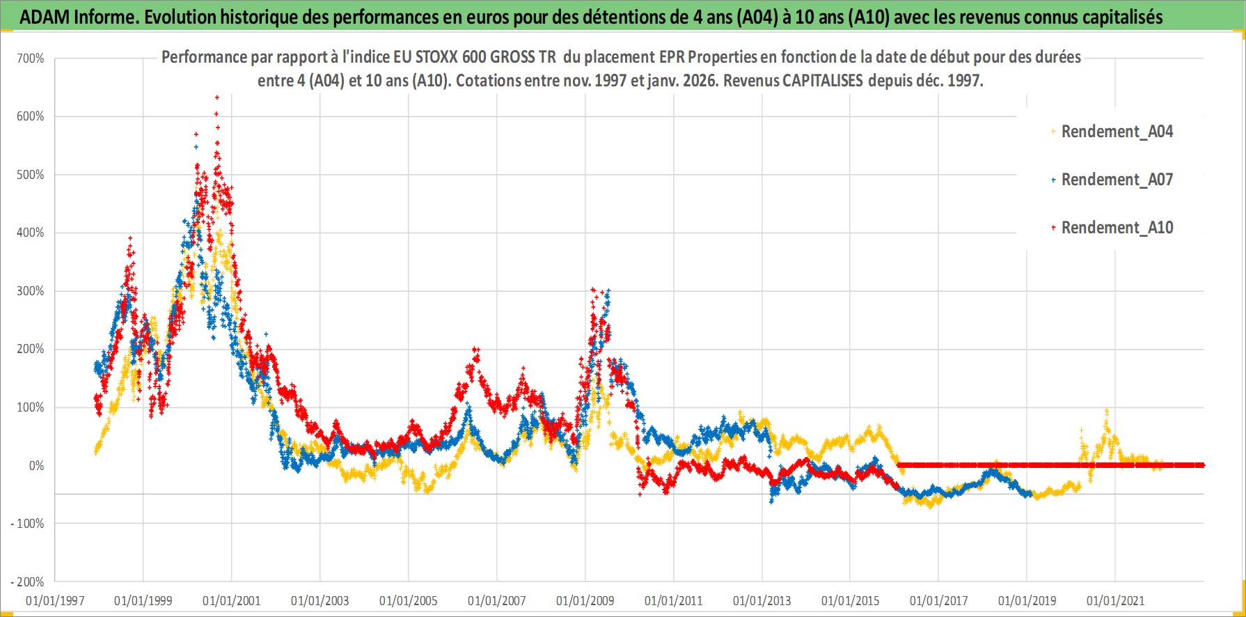 Site dédié aux investisseursPage dédiée sur site financeAnalyse des valorisations hebdomadaires de l'action EPR Properties. Cet actif est cote en USD. Les valorisations sont en contrevaleur EURO et couvrent les semaines 1997W47 a 2026W05. Les revenus de cet actif financier sont pris en compte depuis la semaine 1997W52. La note ESG de cet actif n'est pas connue.