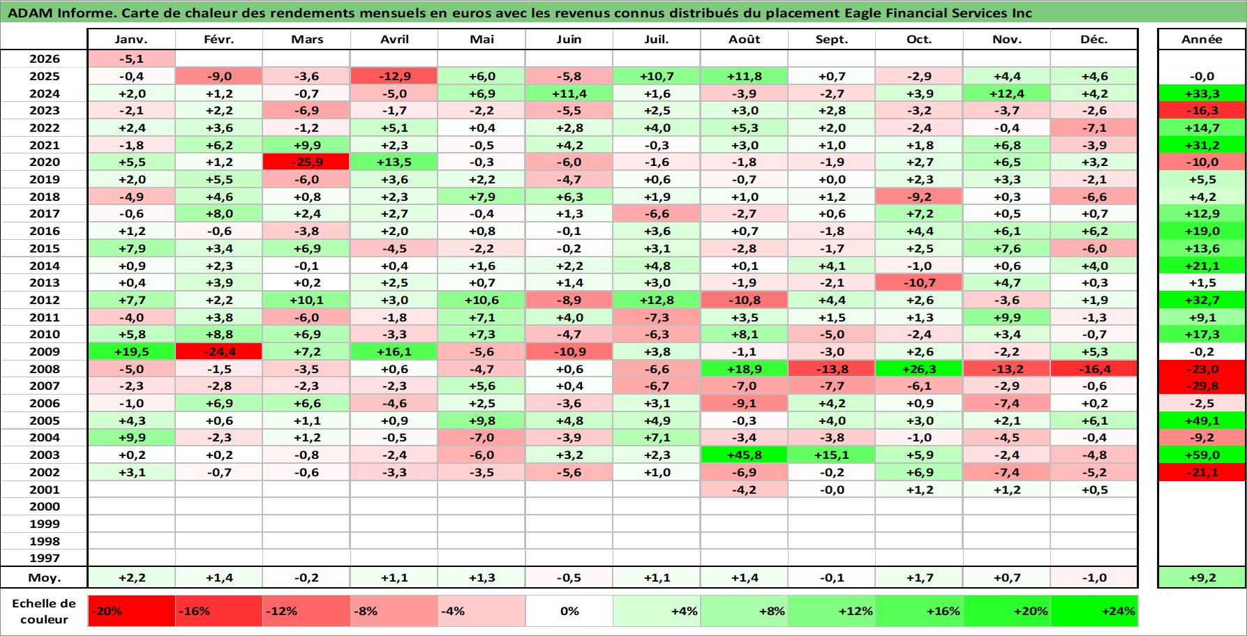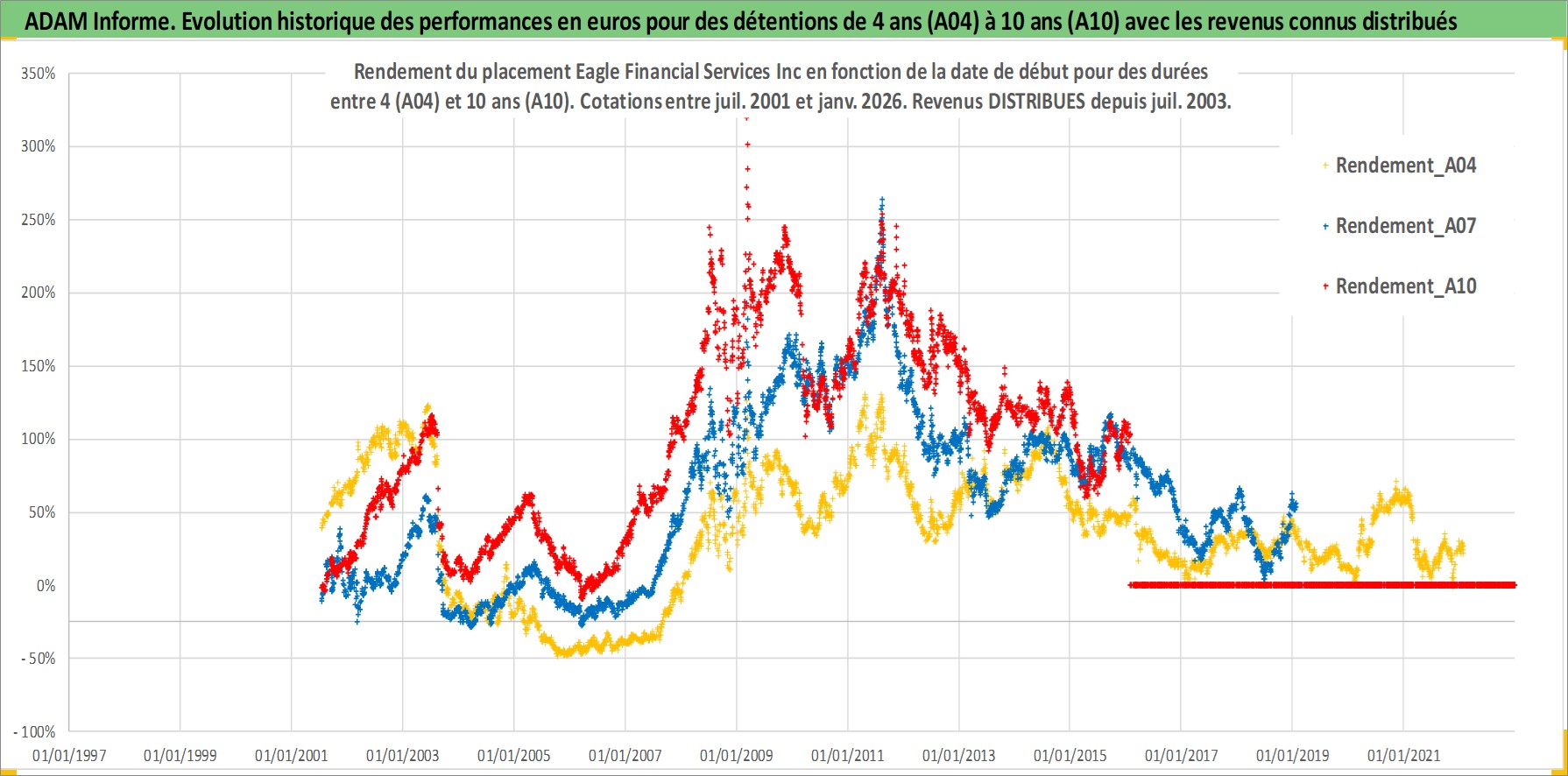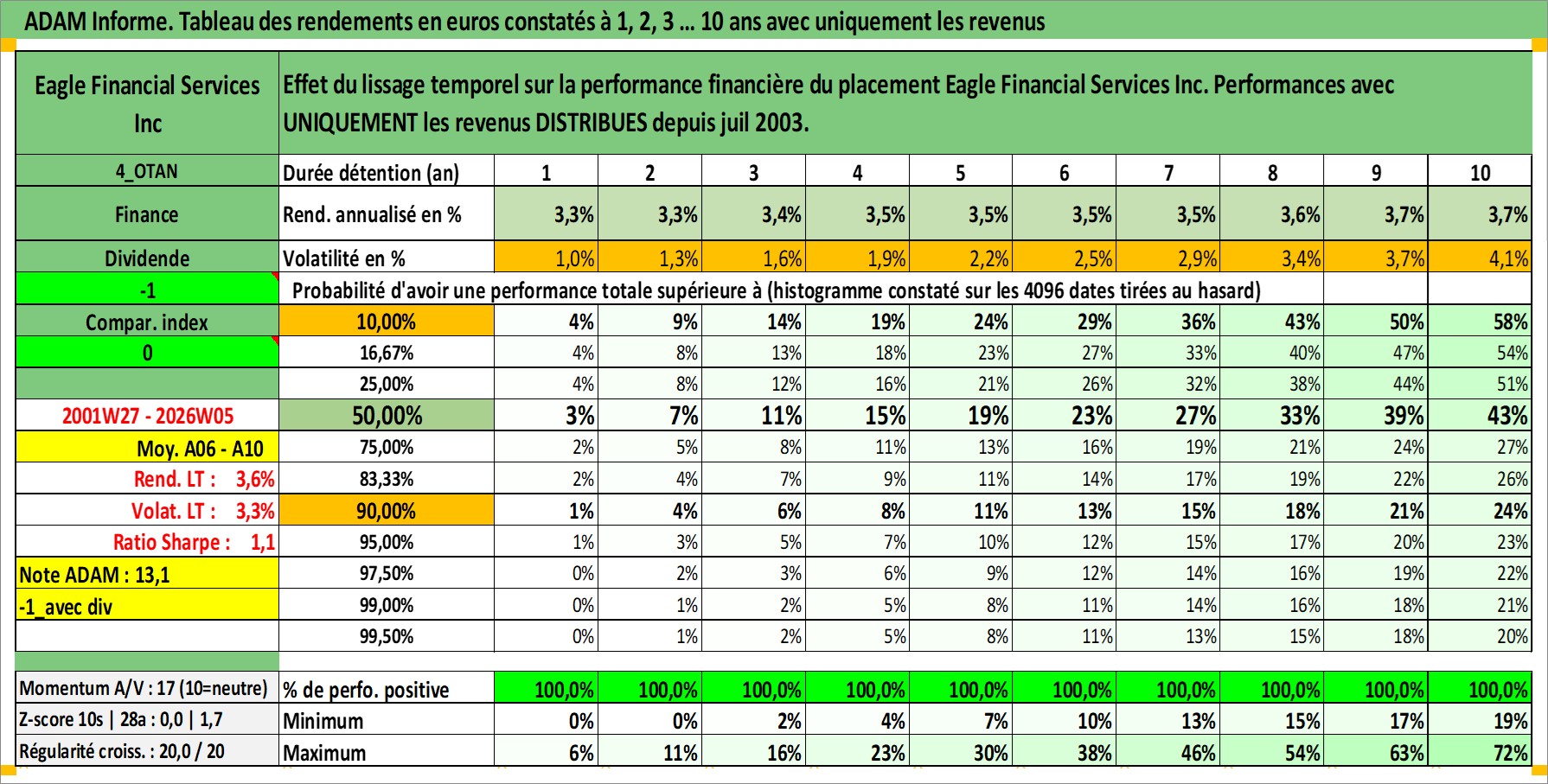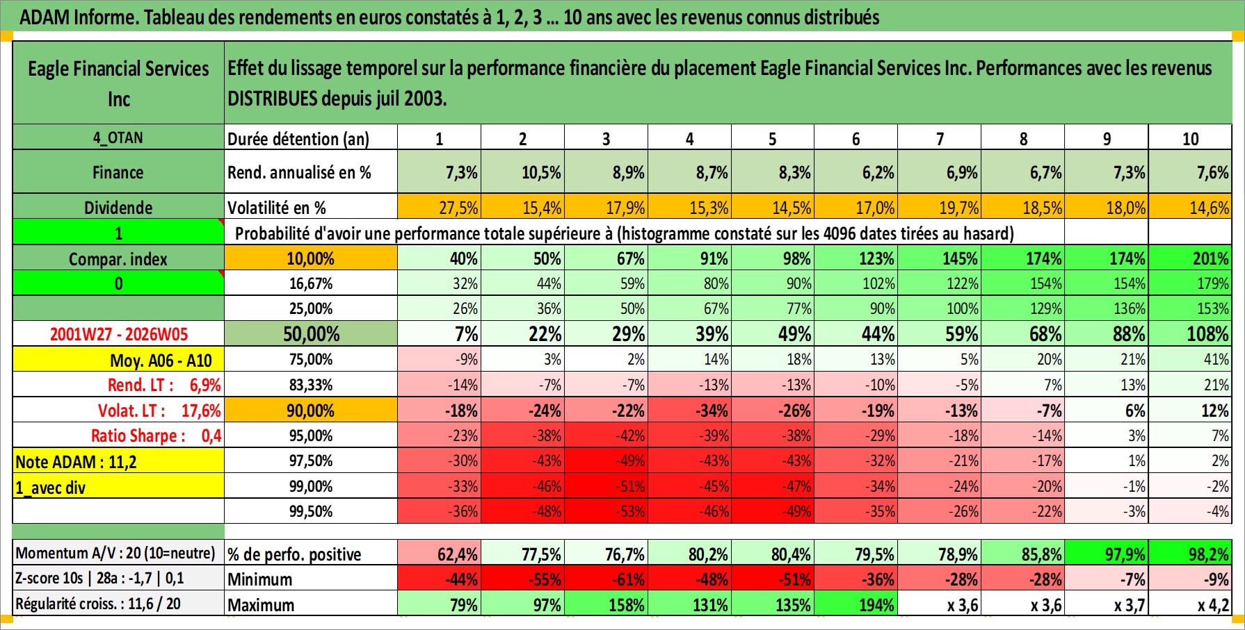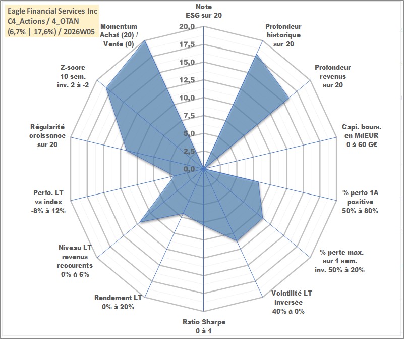 Site dédié aux investisseursPage dédiée sur site financeAnalyse des valorisations hebdomadaires de l'action Eagle Financial Services Inc. Cet actif est cote en USD. Les valorisations sont en contrevaleur EURO et couvrent les semaines 2001W27 a 2026W05. Les revenus de cet actif financier sont pris en compte depuis la semaine 2003W31. La note ESG de cet actif n'est pas connue.