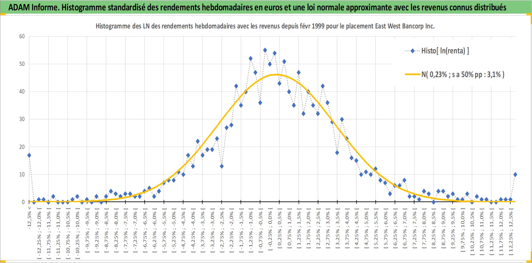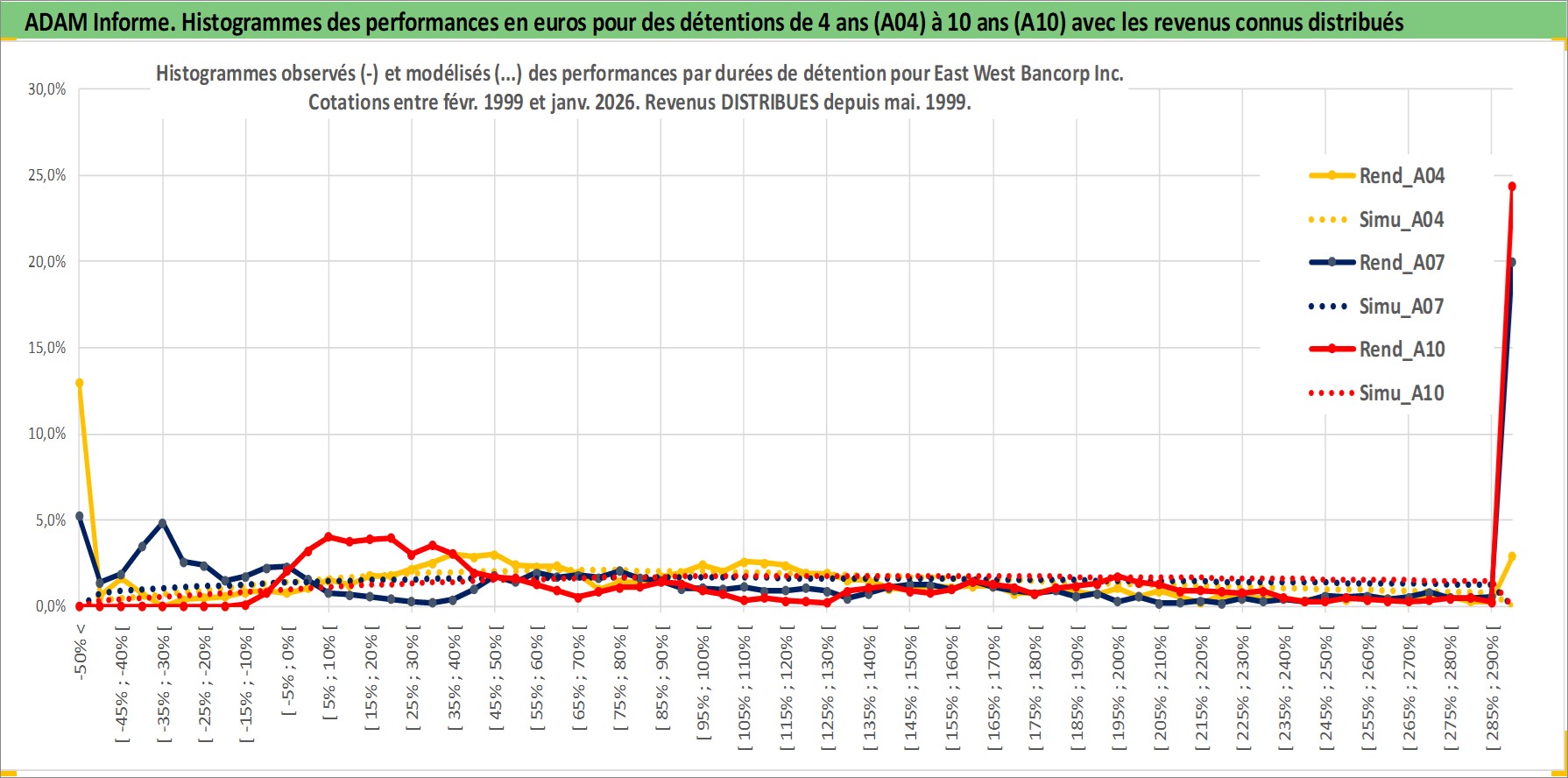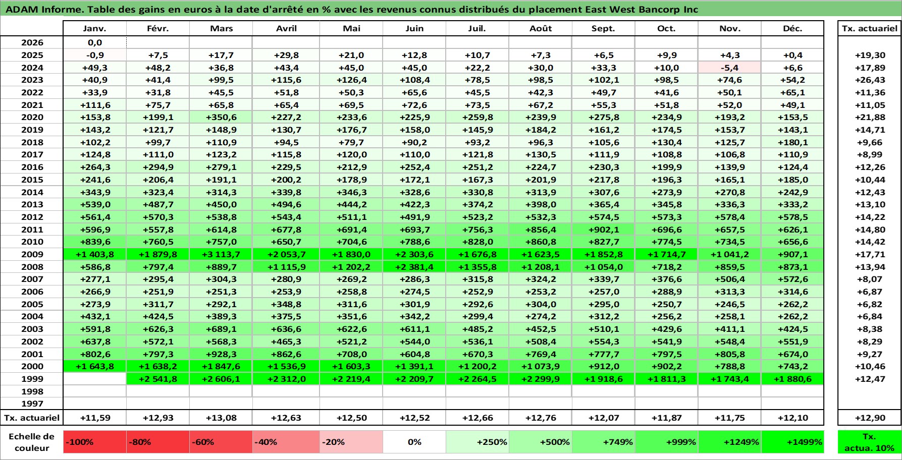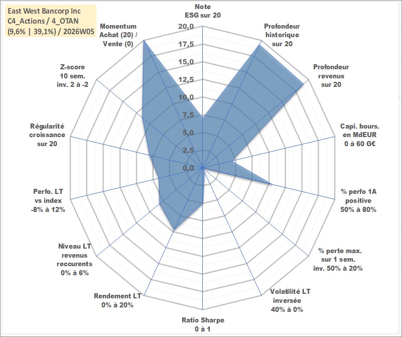 Site dédié aux investisseursPage dédiée sur site financeAnalyse des valorisations hebdomadaires de l'action East West Bancorp Inc. Cet actif est cote en USD. Les valorisations sont en contrevaleur EURO et couvrent les semaines 1999W05 a 2026W05. Les revenus de cet actif financier sont pris en compte depuis la semaine 1999W18. La note globale ESG de cet actif est estimee a 7.0 (apres rebasage entre 0 et 20).