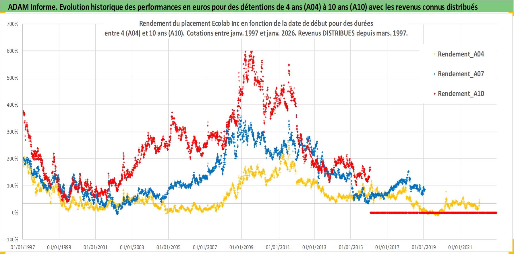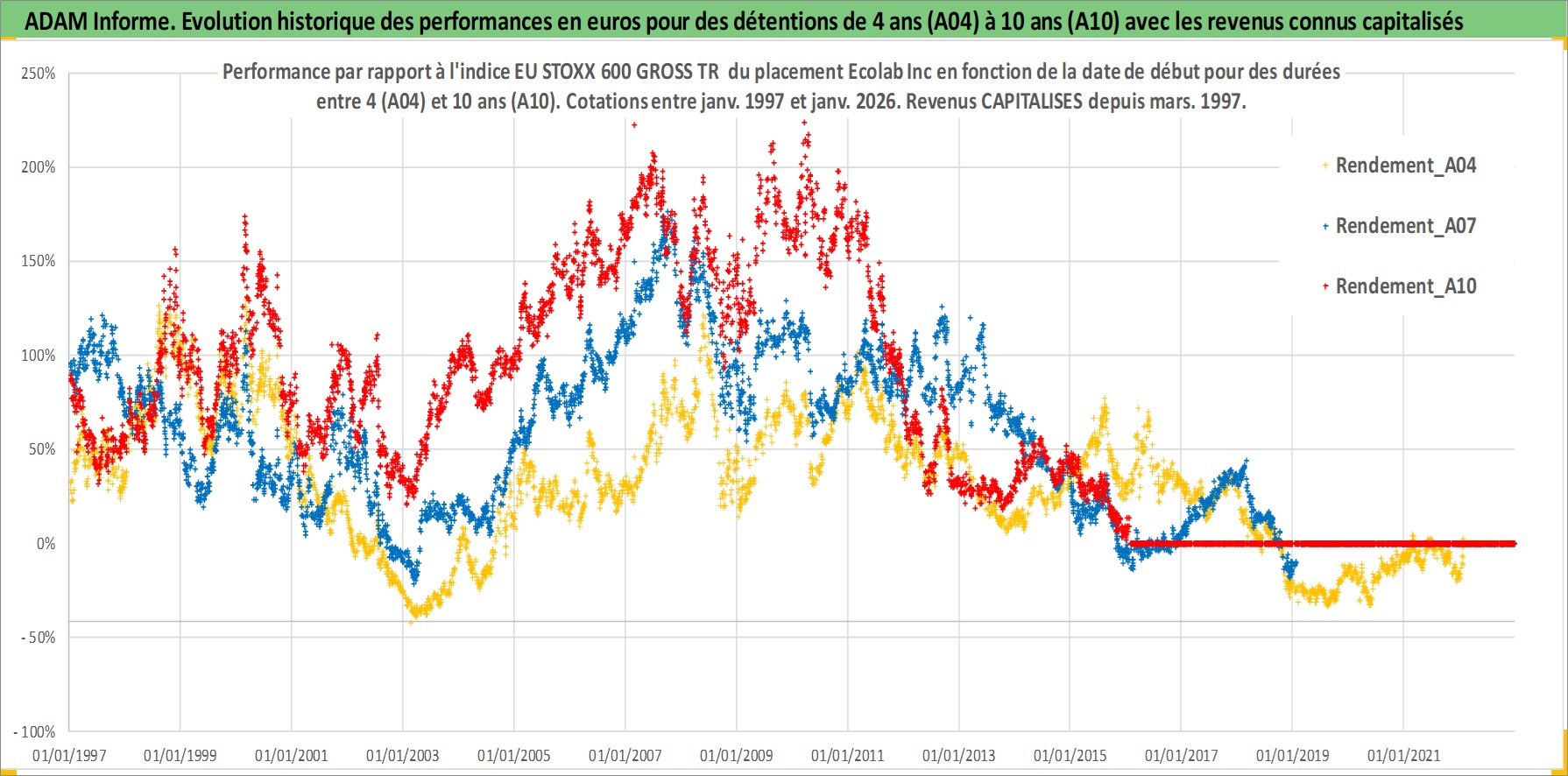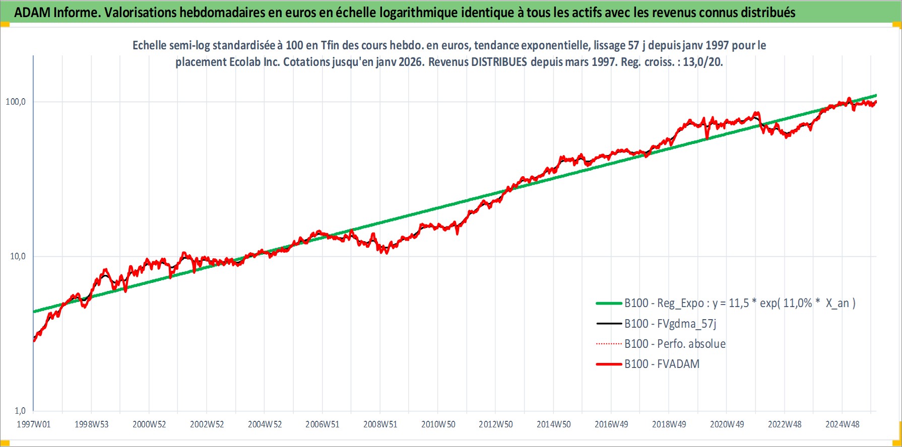 Site dédié aux investisseursPage dédiée sur site financeAnalyse des valorisations hebdomadaires de l'action Ecolab Inc. Cet actif est cote en USD. Les valorisations sont en contrevaleur EURO et couvrent les semaines 1997W01 a 2026W05. Les revenus de cet actif financier sont pris en compte depuis la semaine 1997W11. La note globale ESG de cet actif est estimee a 8.0 (apres rebasage entre 0 et 20).