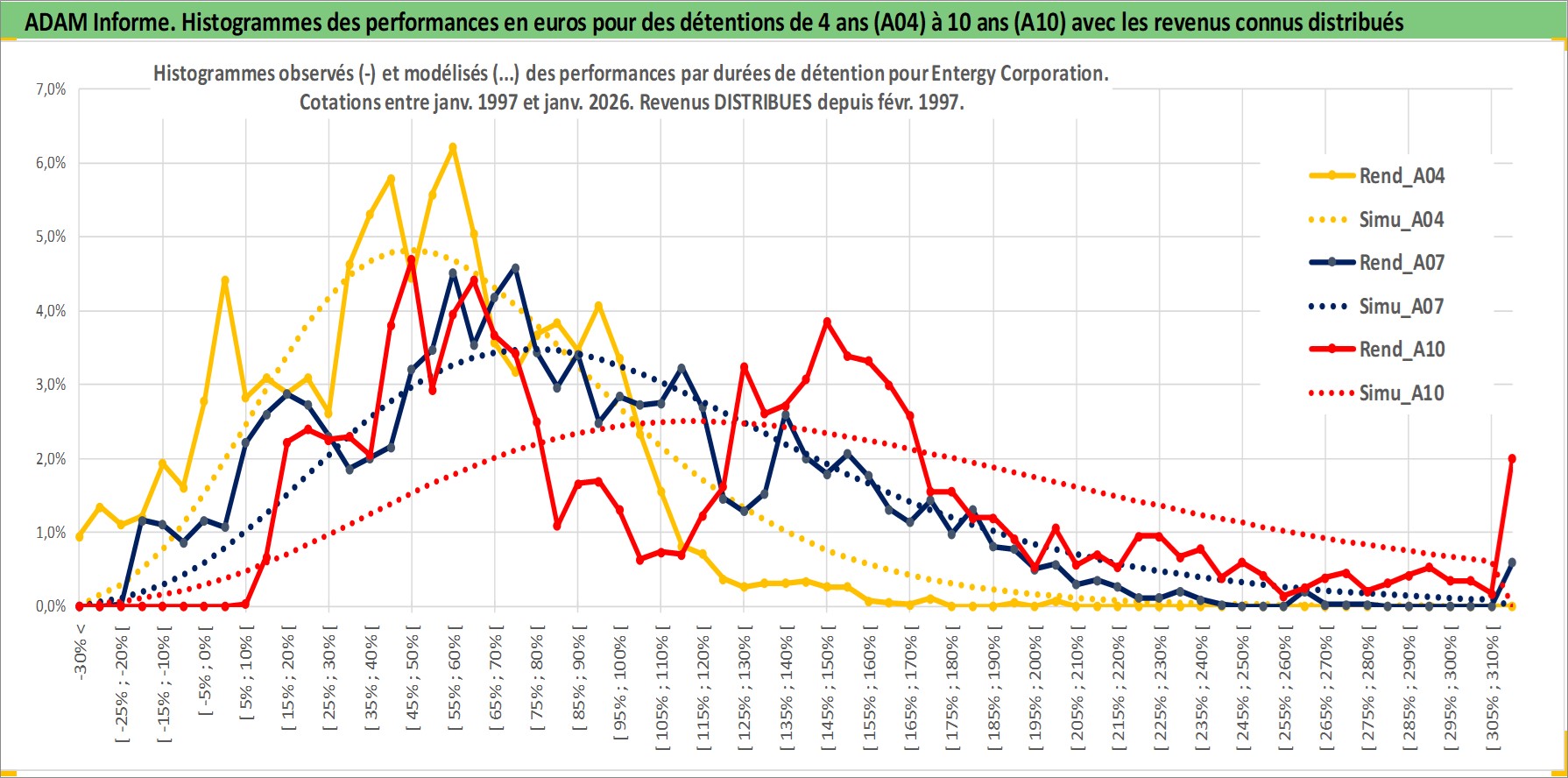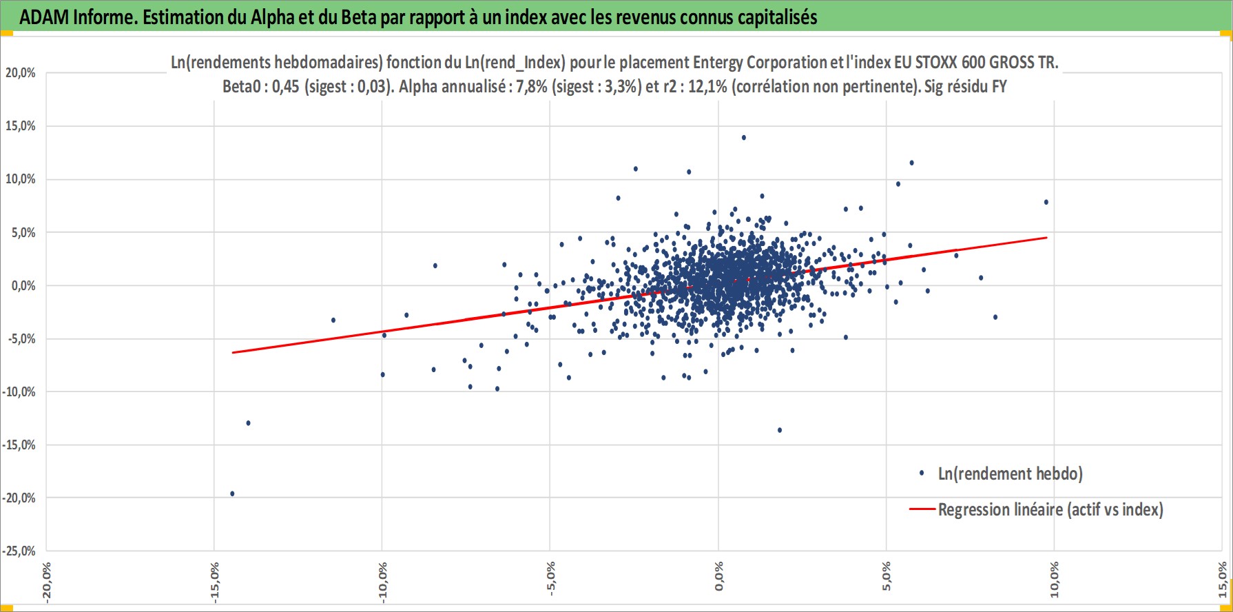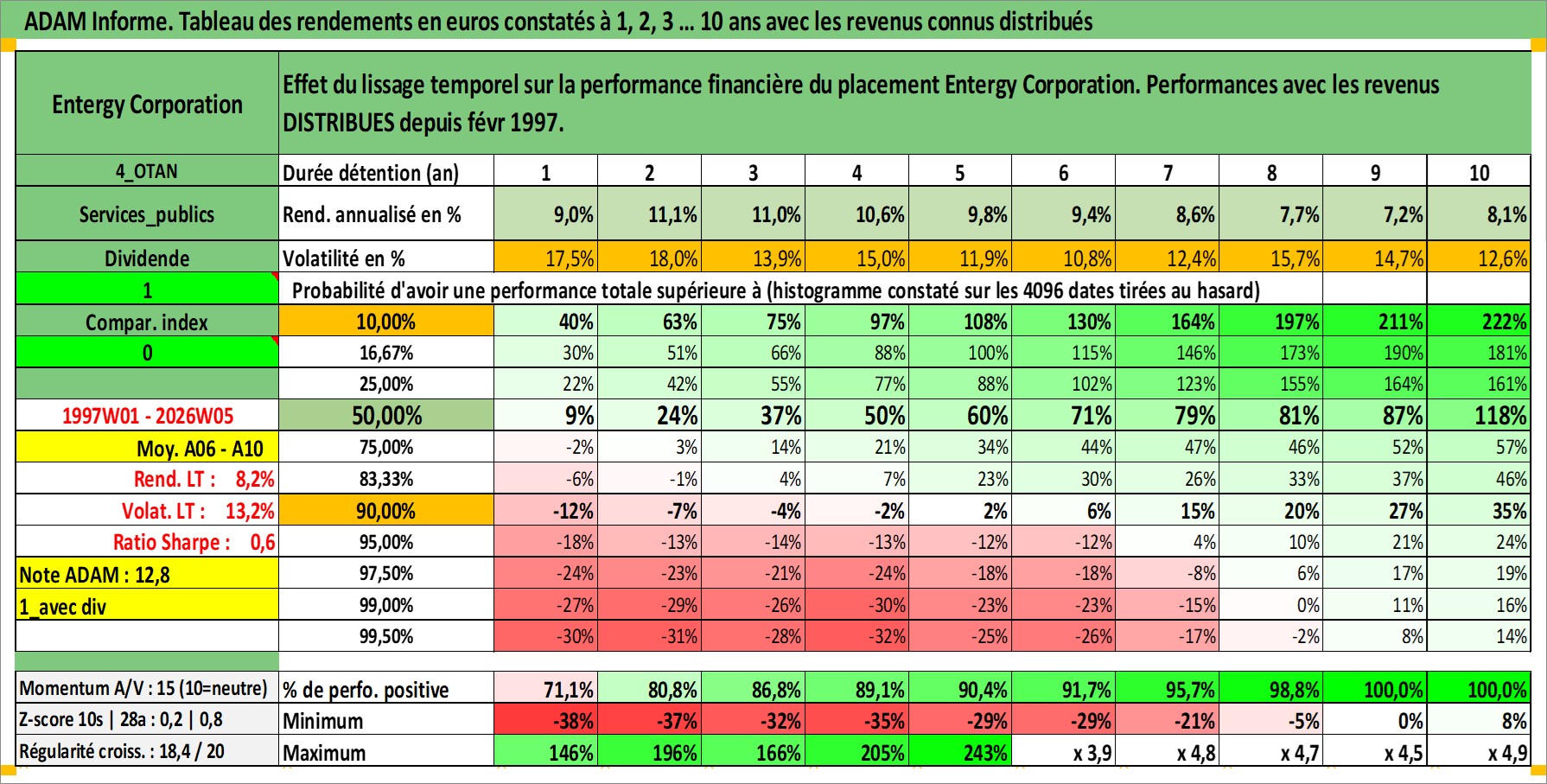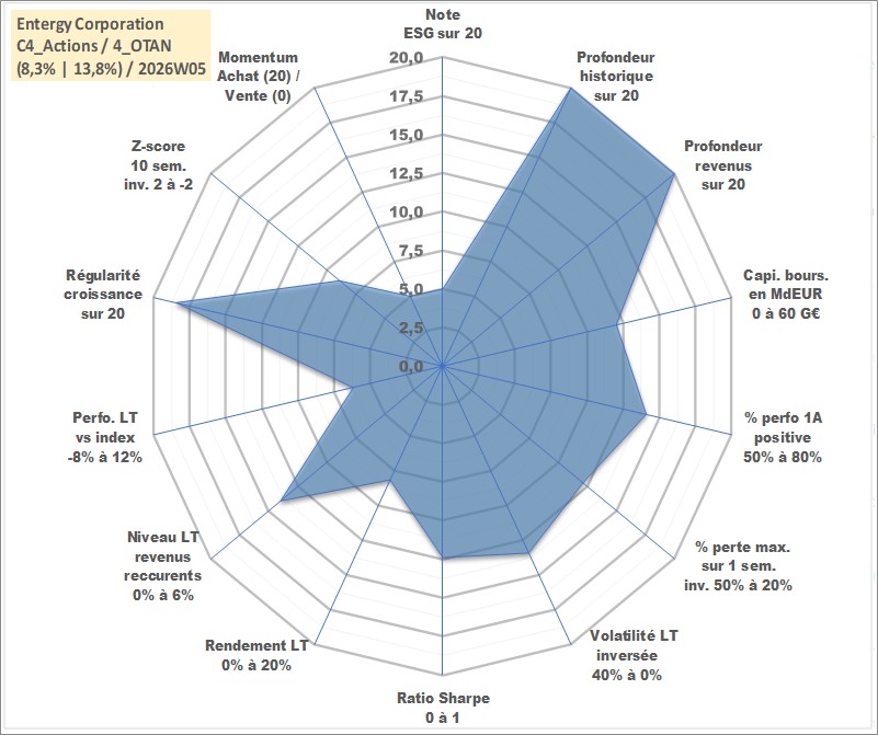 Site dédié aux investisseursPage dédiée sur site financeAnalyse des valorisations hebdomadaires de l'action Entergy Corporation. Cet actif est cote en USD. Les valorisations sont en contrevaleur EURO et couvrent les semaines 1997W01 a 2026W05. Les revenus de cet actif financier sont pris en compte depuis la semaine 1997W07. La note globale ESG de cet actif est estimee a 5.0 (apres rebasage entre 0 et 20).
