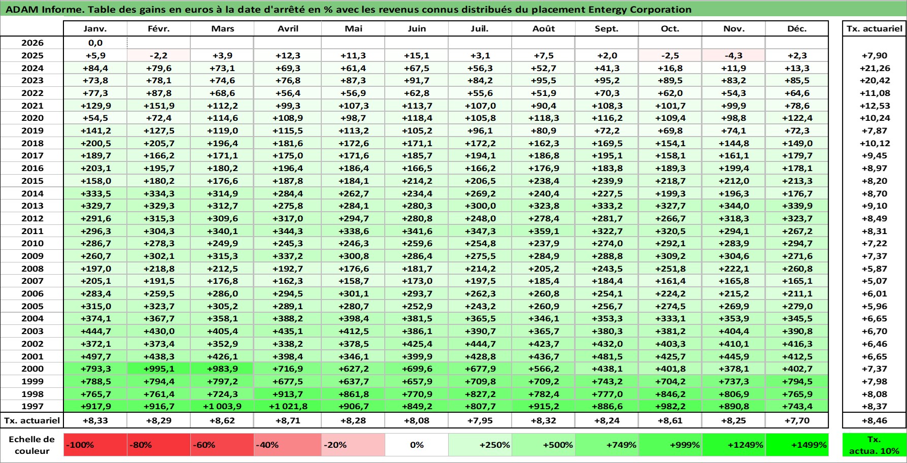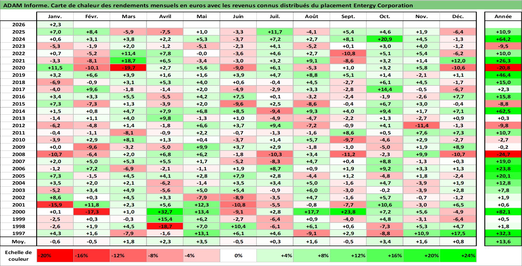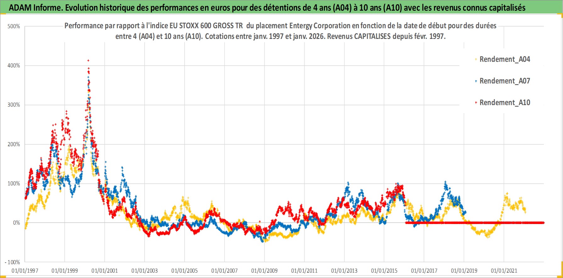 Site dédié aux investisseursPage dédiée sur site financeAnalyse des valorisations hebdomadaires de l'action Entergy Corporation. Cet actif est cote en USD. Les valorisations sont en contrevaleur EURO et couvrent les semaines 1997W01 a 2026W05. Les revenus de cet actif financier sont pris en compte depuis la semaine 1997W07. La note globale ESG de cet actif est estimee a 5.0 (apres rebasage entre 0 et 20).