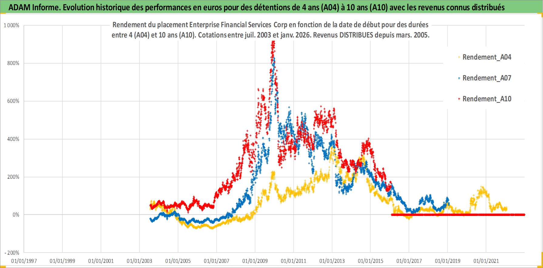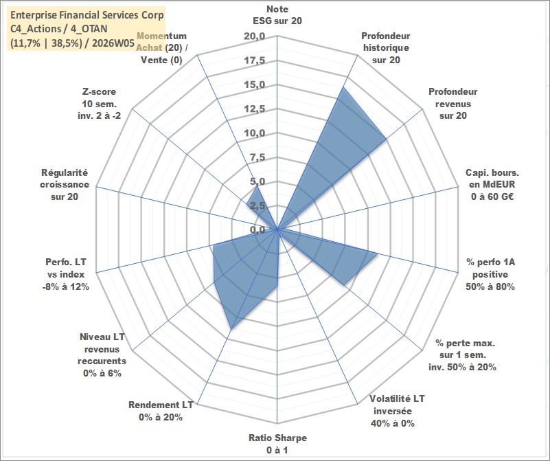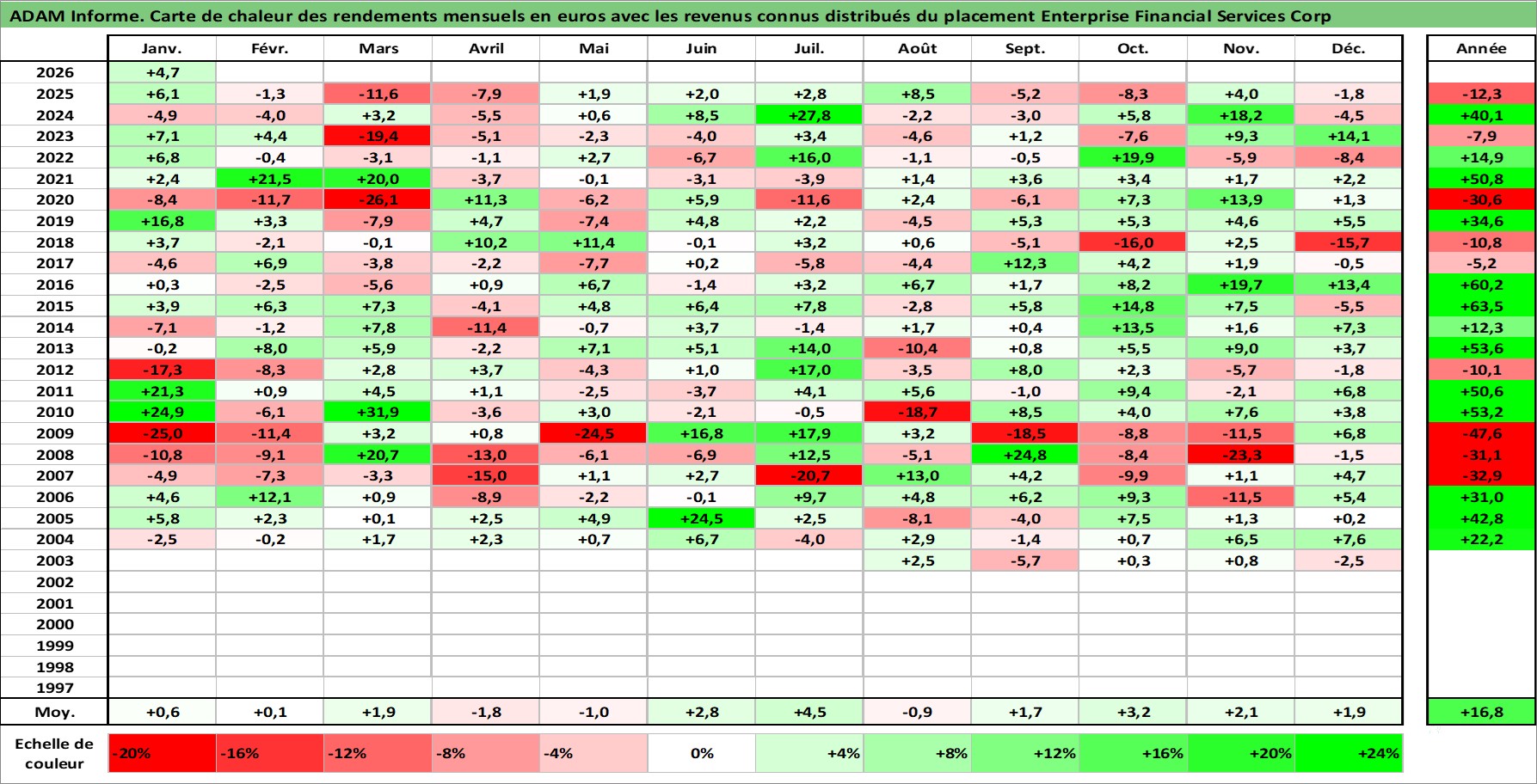 Site dédié aux investisseursPage dédiée sur site financeAnalyse des valorisations hebdomadaires de l'action Enterprise Financial Services Corp. Cet actif est cote en USD. Les valorisations sont en contrevaleur EURO et couvrent les semaines 2003W29 a 2026W05. Les revenus de cet actif financier sont pris en compte depuis la semaine 2005W11. La note ESG de cet actif n'est pas connue.
