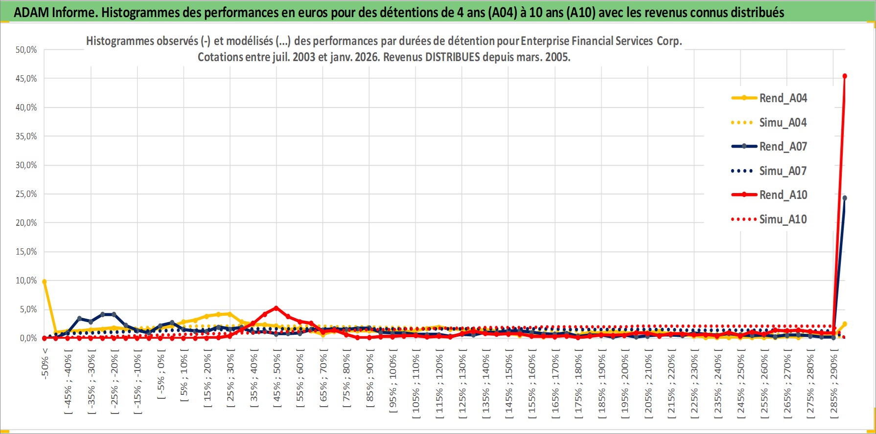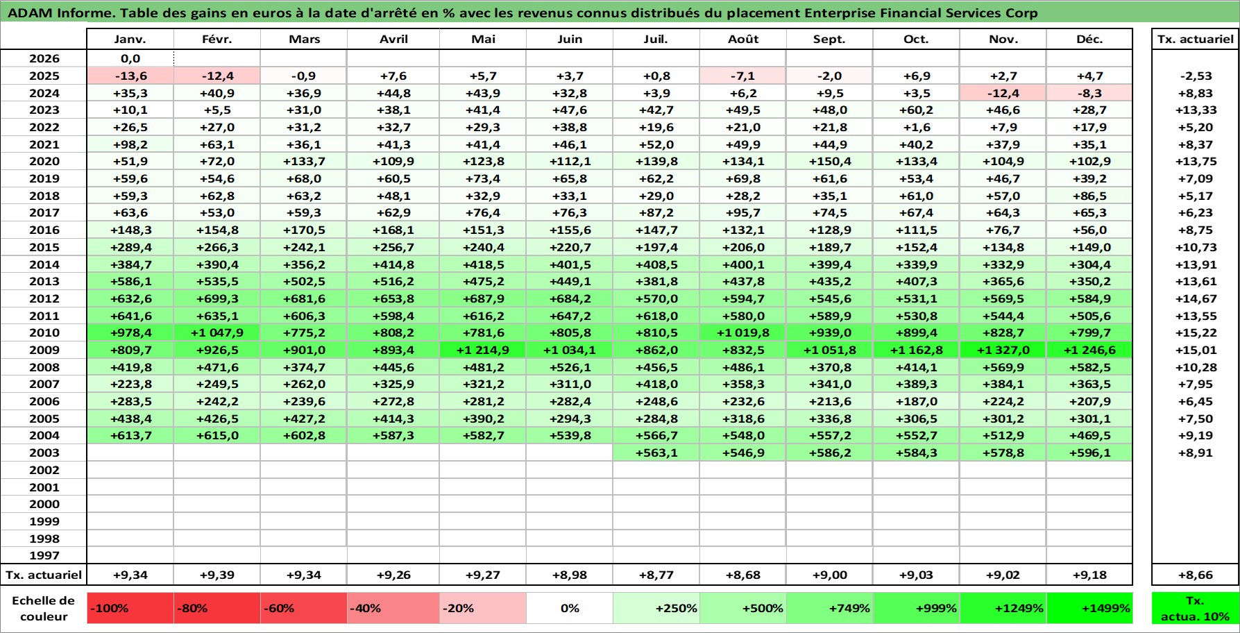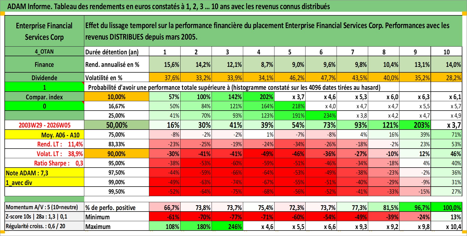 Site dédié aux investisseursPage dédiée sur site financeAnalyse des valorisations hebdomadaires de l'action Enterprise Financial Services Corp. Cet actif est cote en USD. Les valorisations sont en contrevaleur EURO et couvrent les semaines 2003W29 a 2026W05. Les revenus de cet actif financier sont pris en compte depuis la semaine 2005W11. La note ESG de cet actif n'est pas connue.