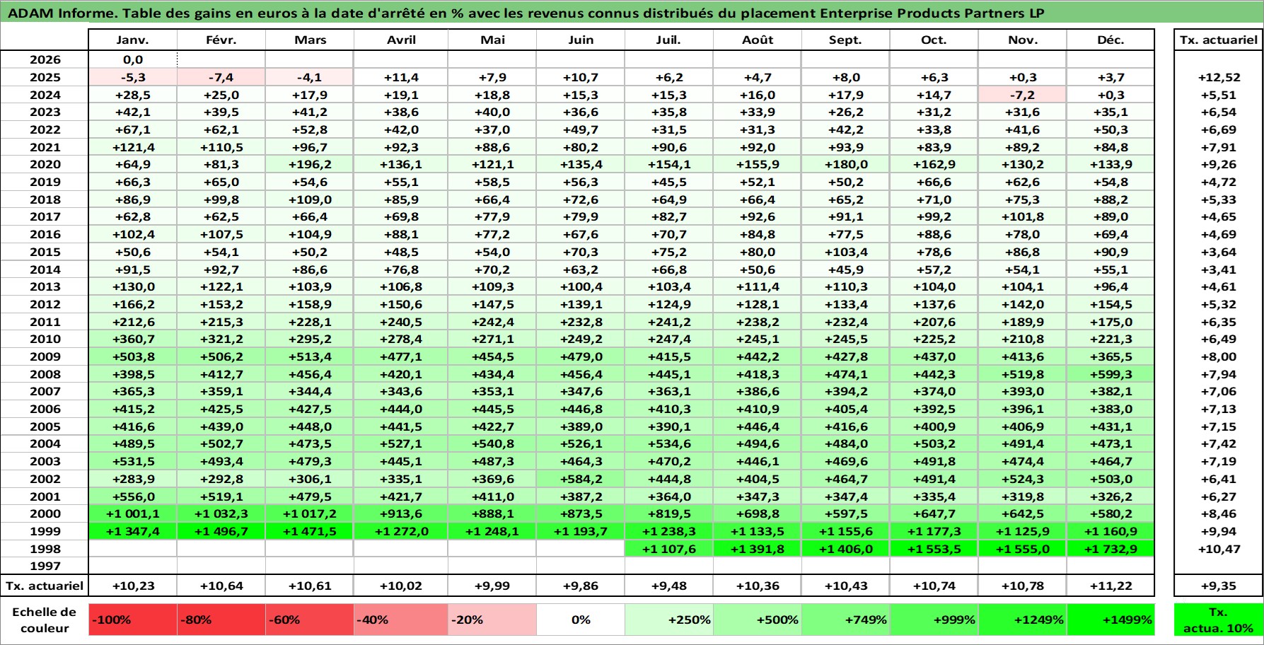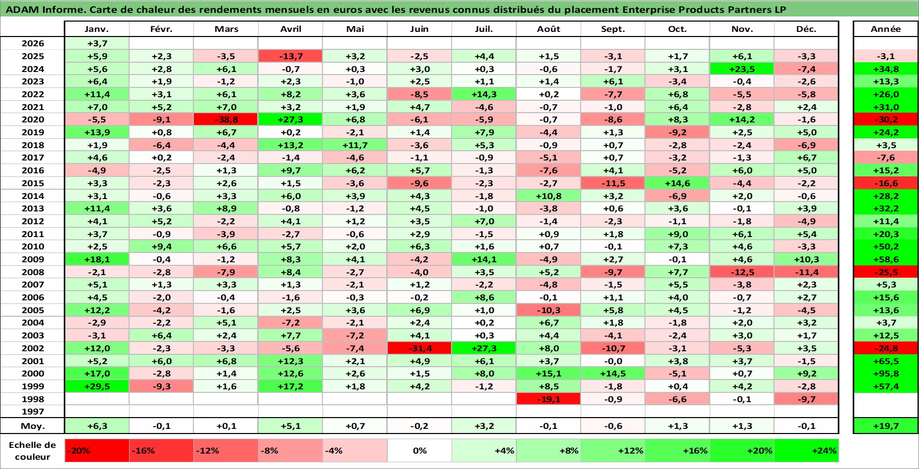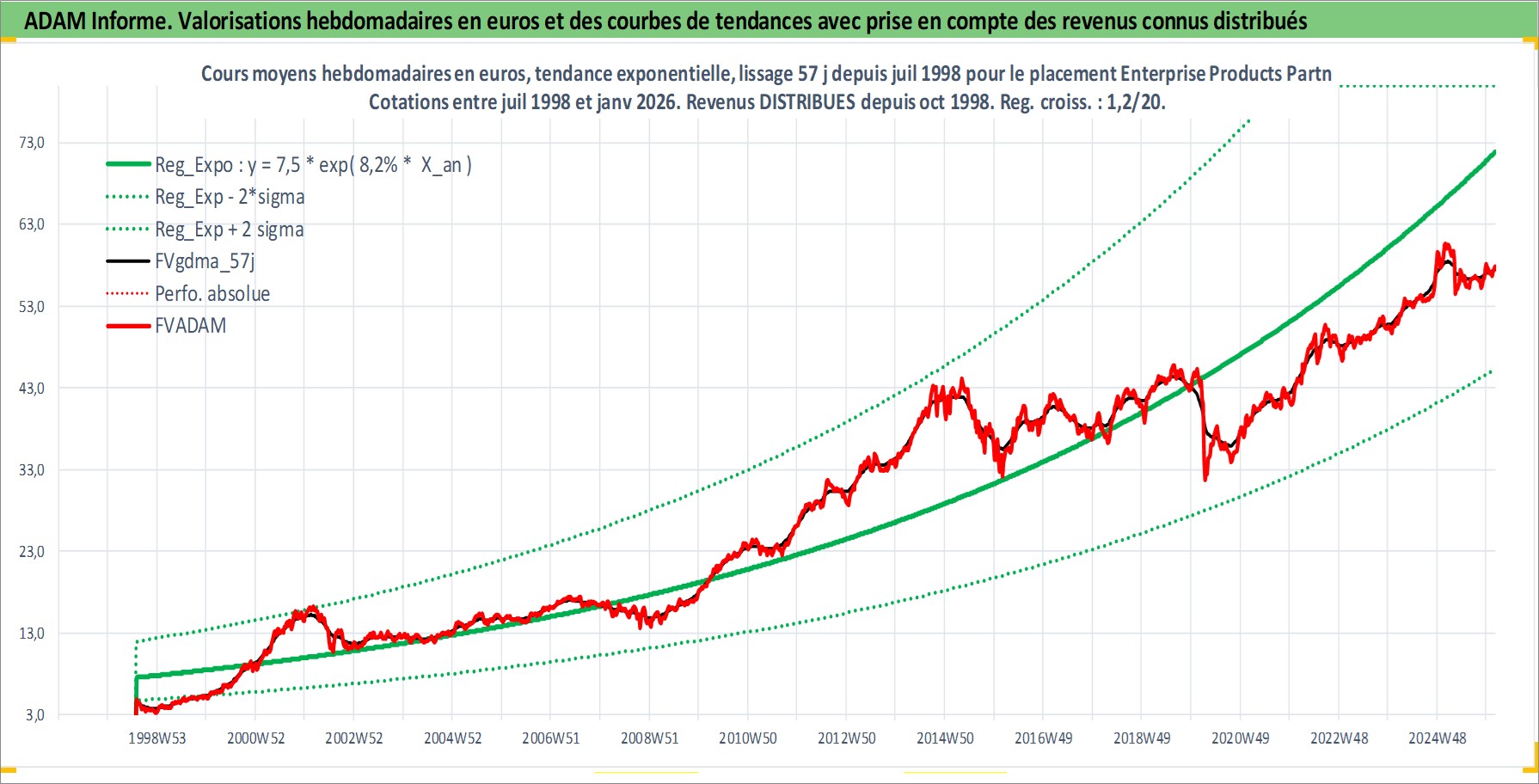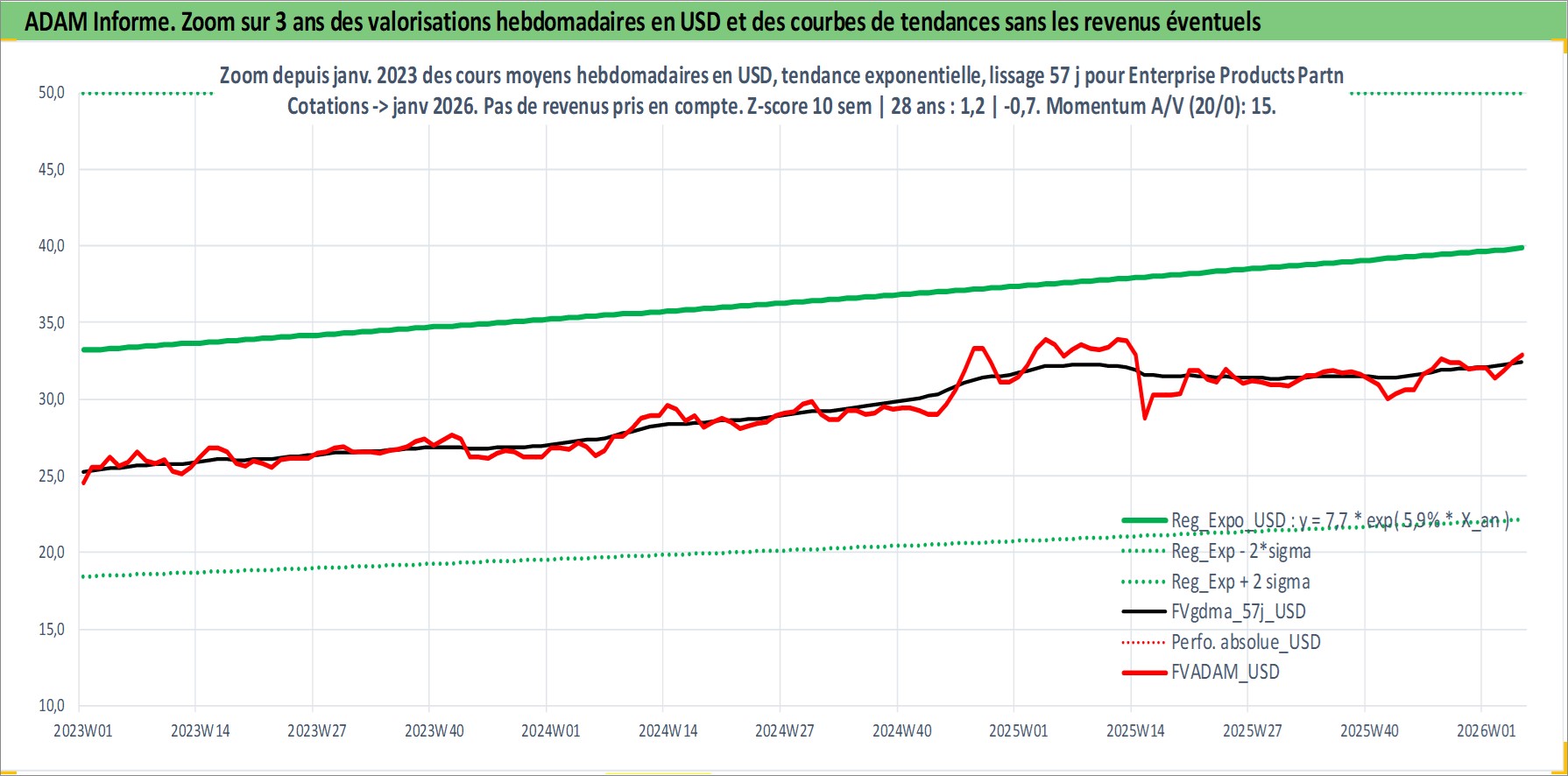 Site dédié aux investisseursPage dédiée sur site financeAnalyse des valorisations hebdomadaires de l'action Enterprise Products Partners LP. Cet actif est cote en USD. Les valorisations sont en contrevaleur EURO et couvrent les semaines 1998W31 a 2026W05. Les revenus de cet actif financier sont pris en compte depuis la semaine 1998W44. La note ESG de cet actif n'est pas connue.