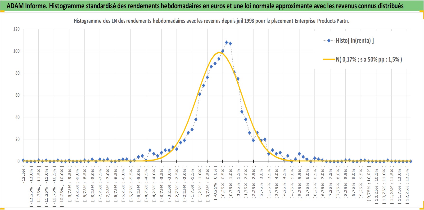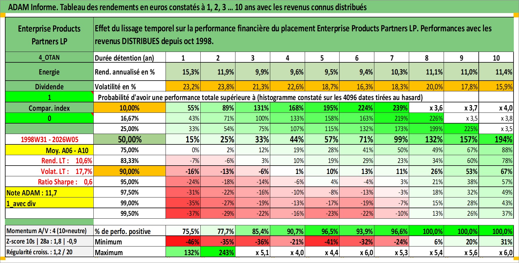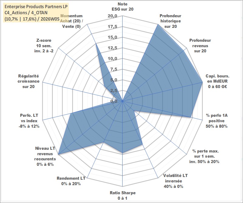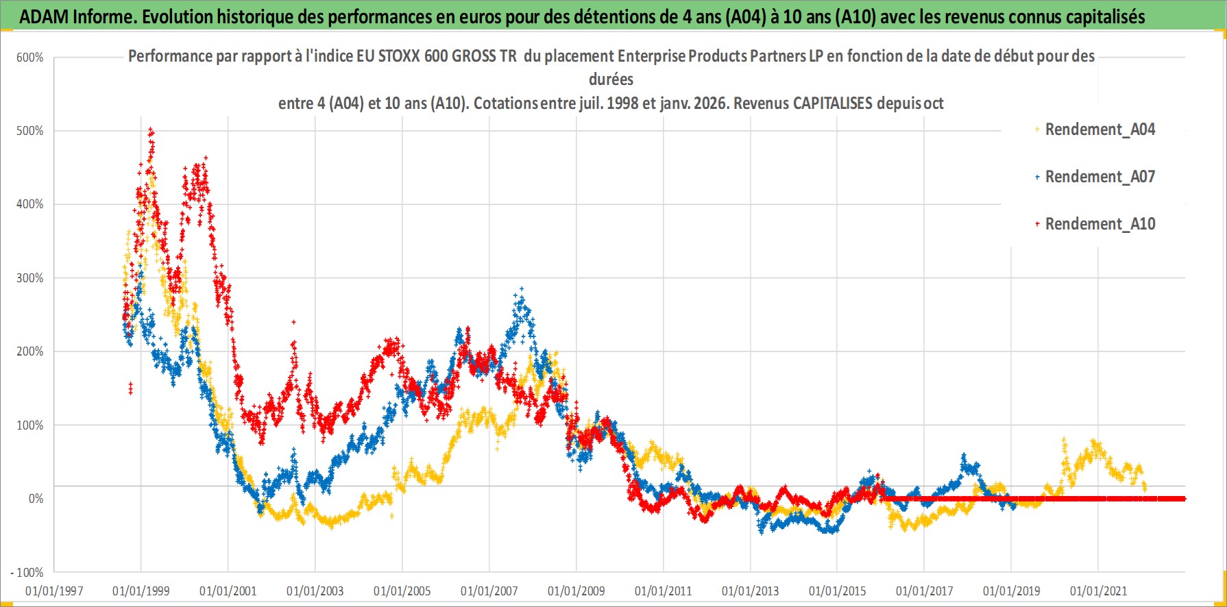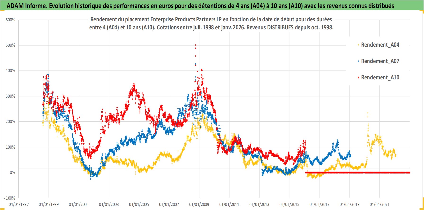 Site dédié aux investisseursPage dédiée sur site financeAnalyse des valorisations hebdomadaires de l'action Enterprise Products Partners LP. Cet actif est cote en USD. Les valorisations sont en contrevaleur EURO et couvrent les semaines 1998W31 a 2026W05. Les revenus de cet actif financier sont pris en compte depuis la semaine 1998W44. La note ESG de cet actif n'est pas connue.