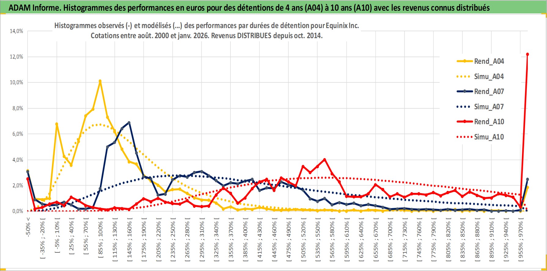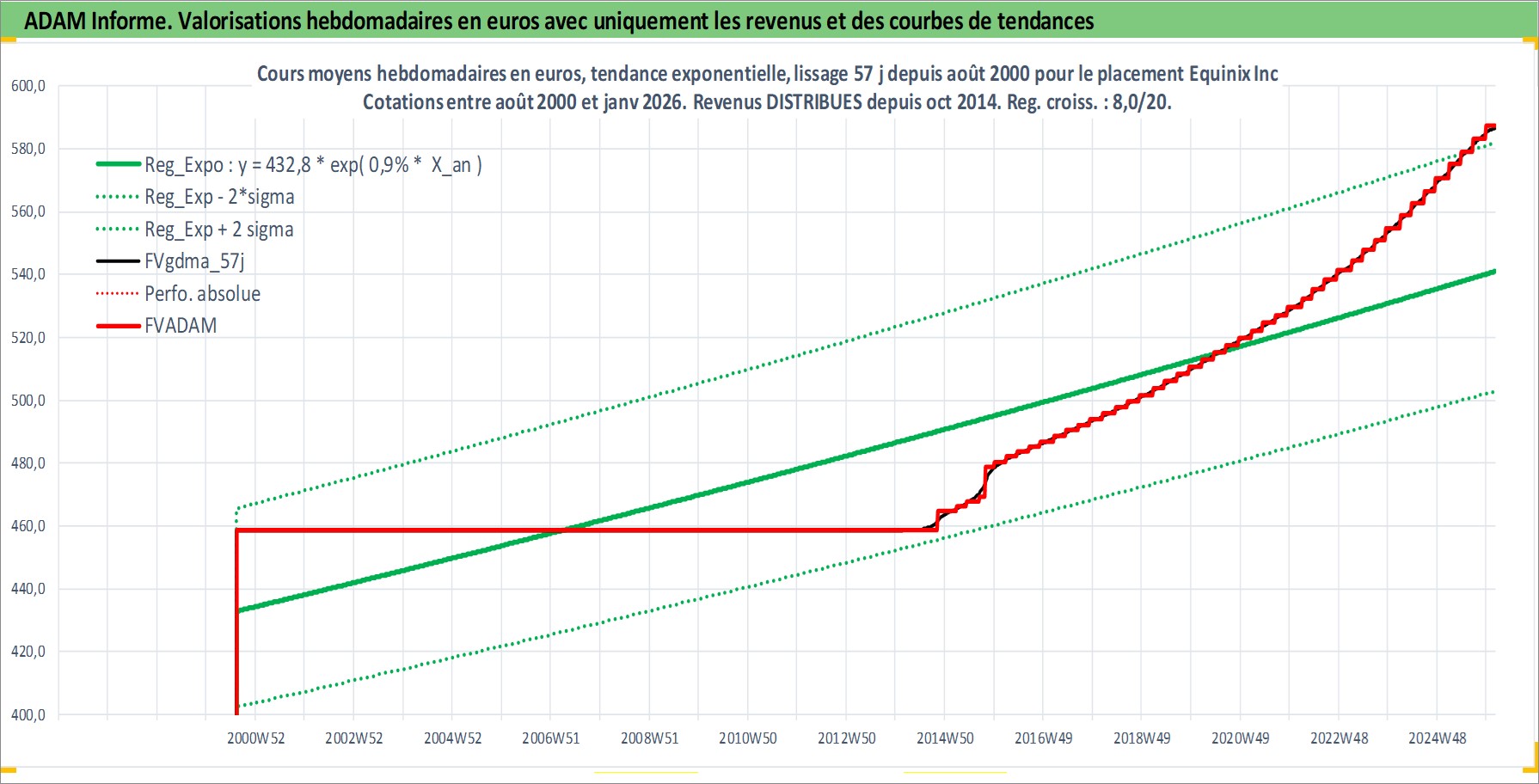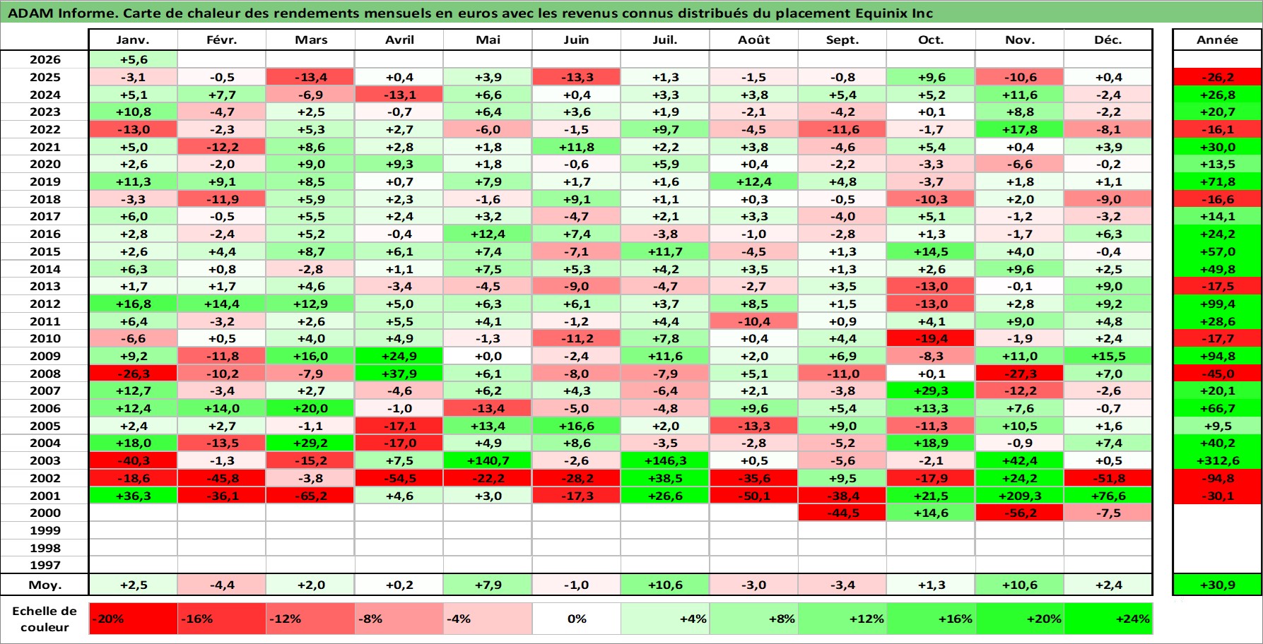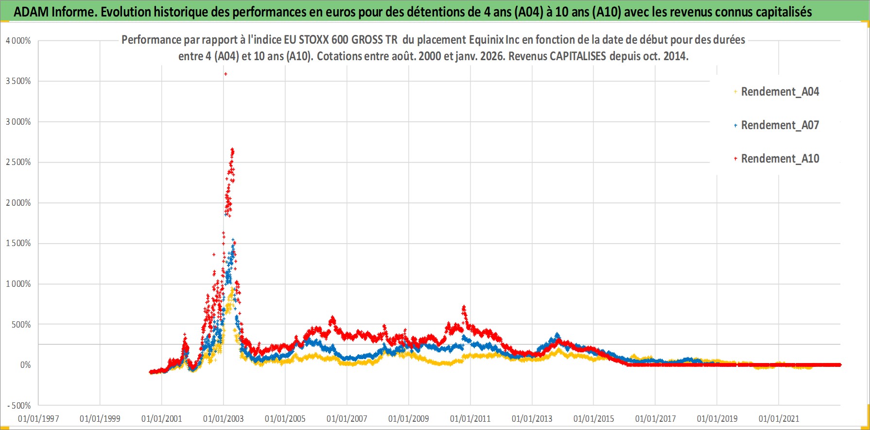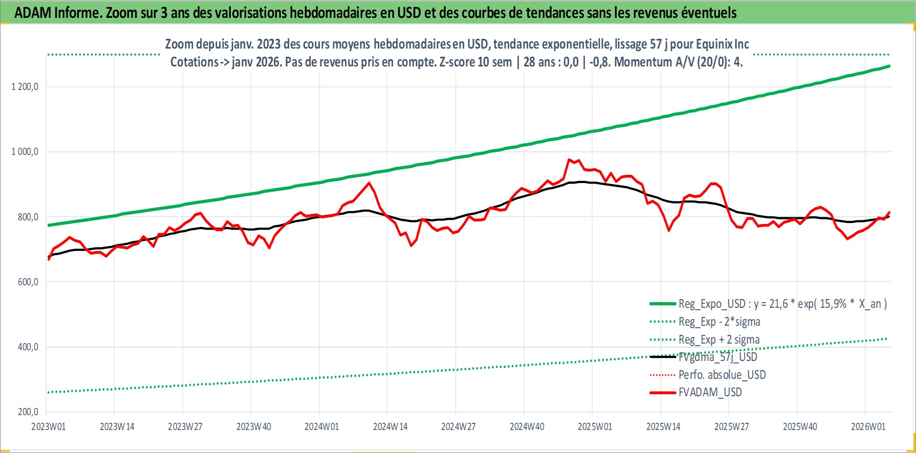 Site dédié aux investisseursPage dédiée sur site financeAnalyse des valorisations hebdomadaires de l'action Equinix Inc. Cet actif est cote en USD. Les valorisations sont en contrevaleur EURO et couvrent les semaines 2000W32 a 2026W05. Les revenus de cet actif financier sont pris en compte depuis la semaine 2014W43. La note globale ESG de cet actif est estimee a 15.0 (apres rebasage entre 0 et 20).