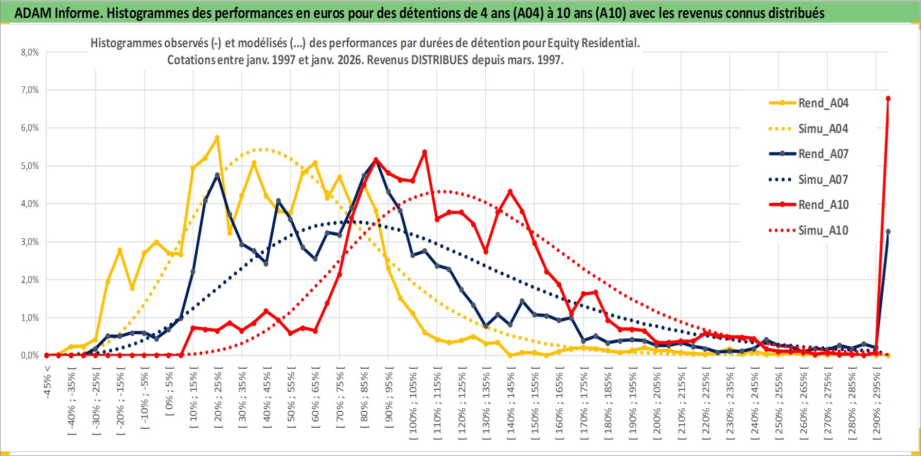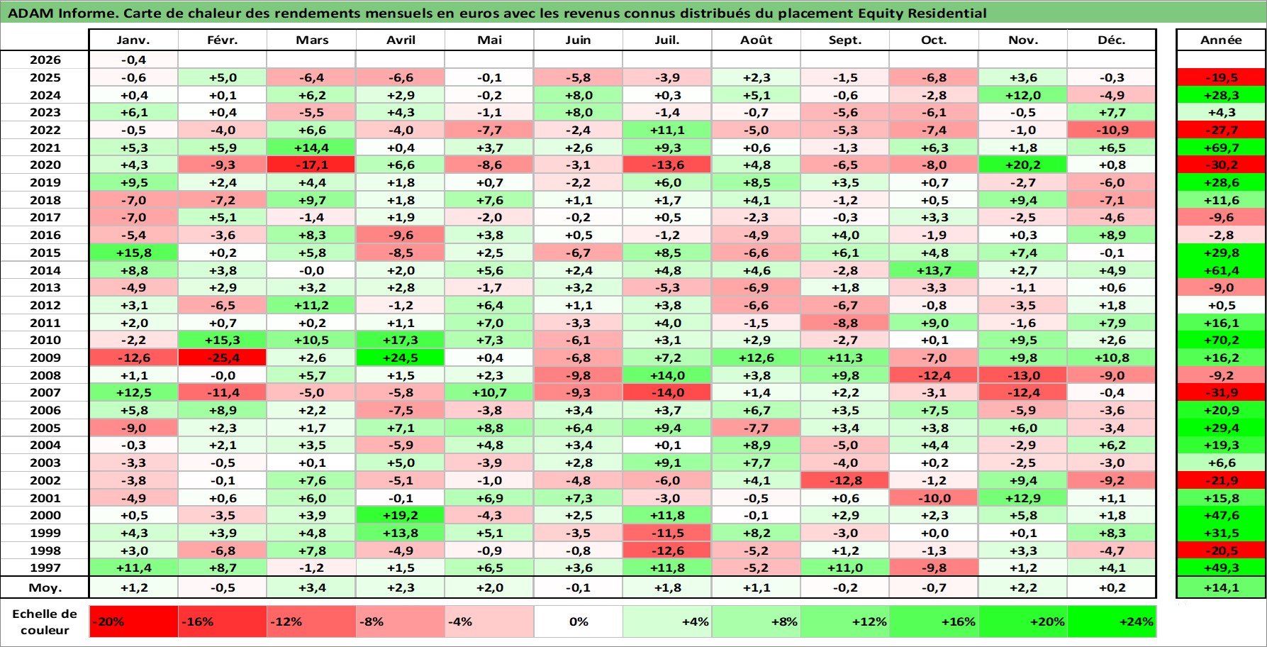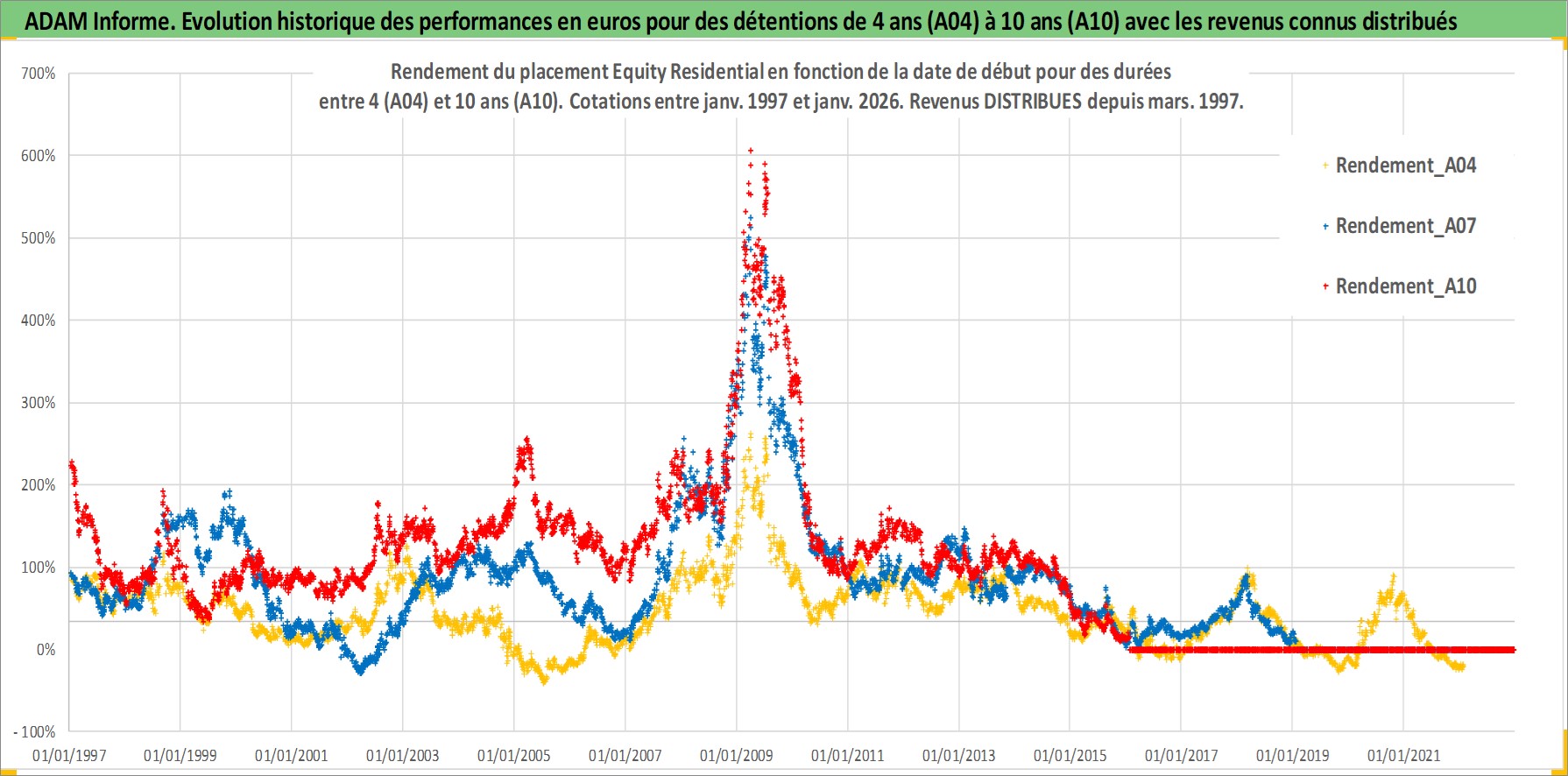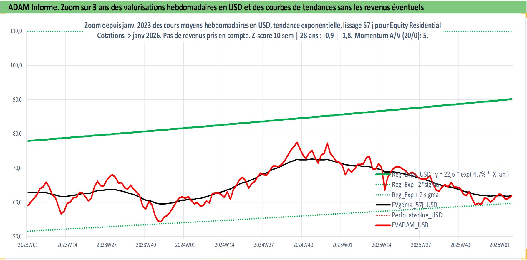 Site dédié aux investisseursPage dédiée sur site financeAnalyse des valorisations hebdomadaires de l'action Equity Residential. Cet actif est cote en USD. Les valorisations sont en contrevaleur EURO et couvrent les semaines 1997W01 a 2026W05. Les revenus de cet actif financier sont pris en compte depuis la semaine 1997W13. La note globale ESG de cet actif est estimee a 16.0 (apres rebasage entre 0 et 20).