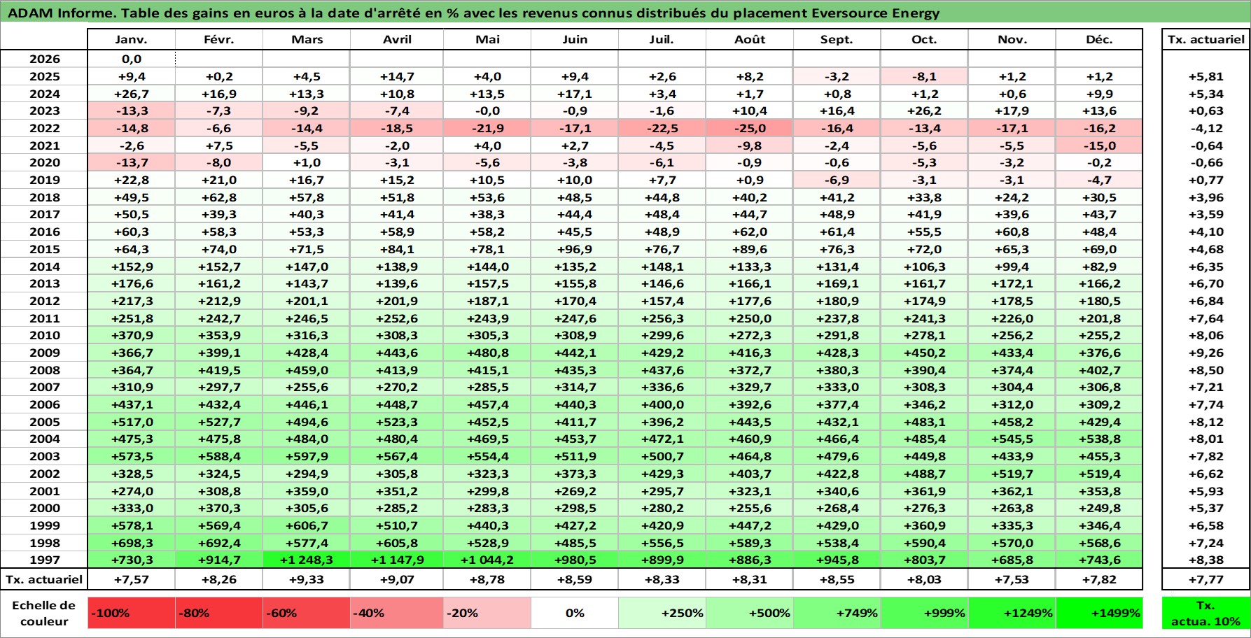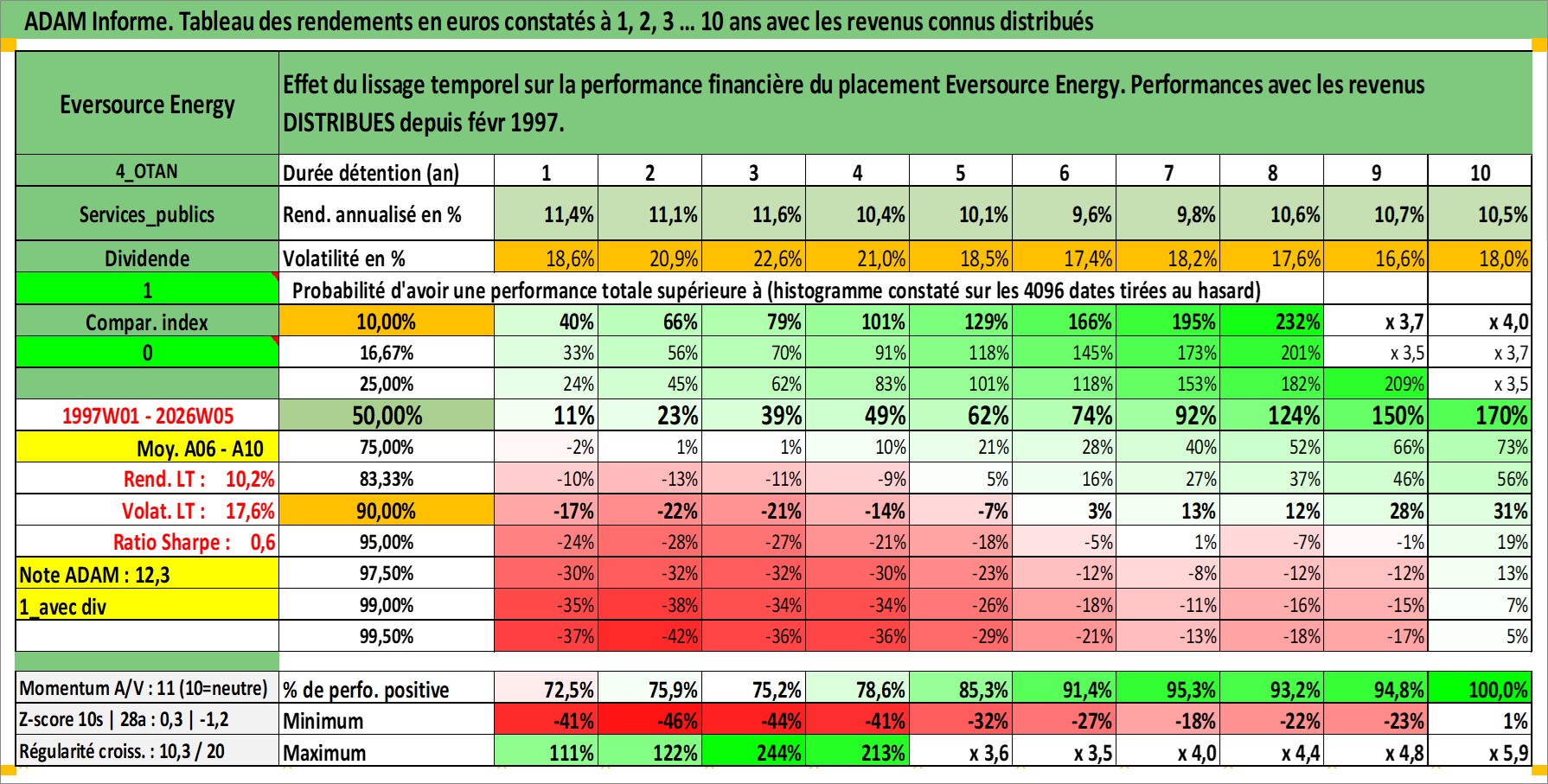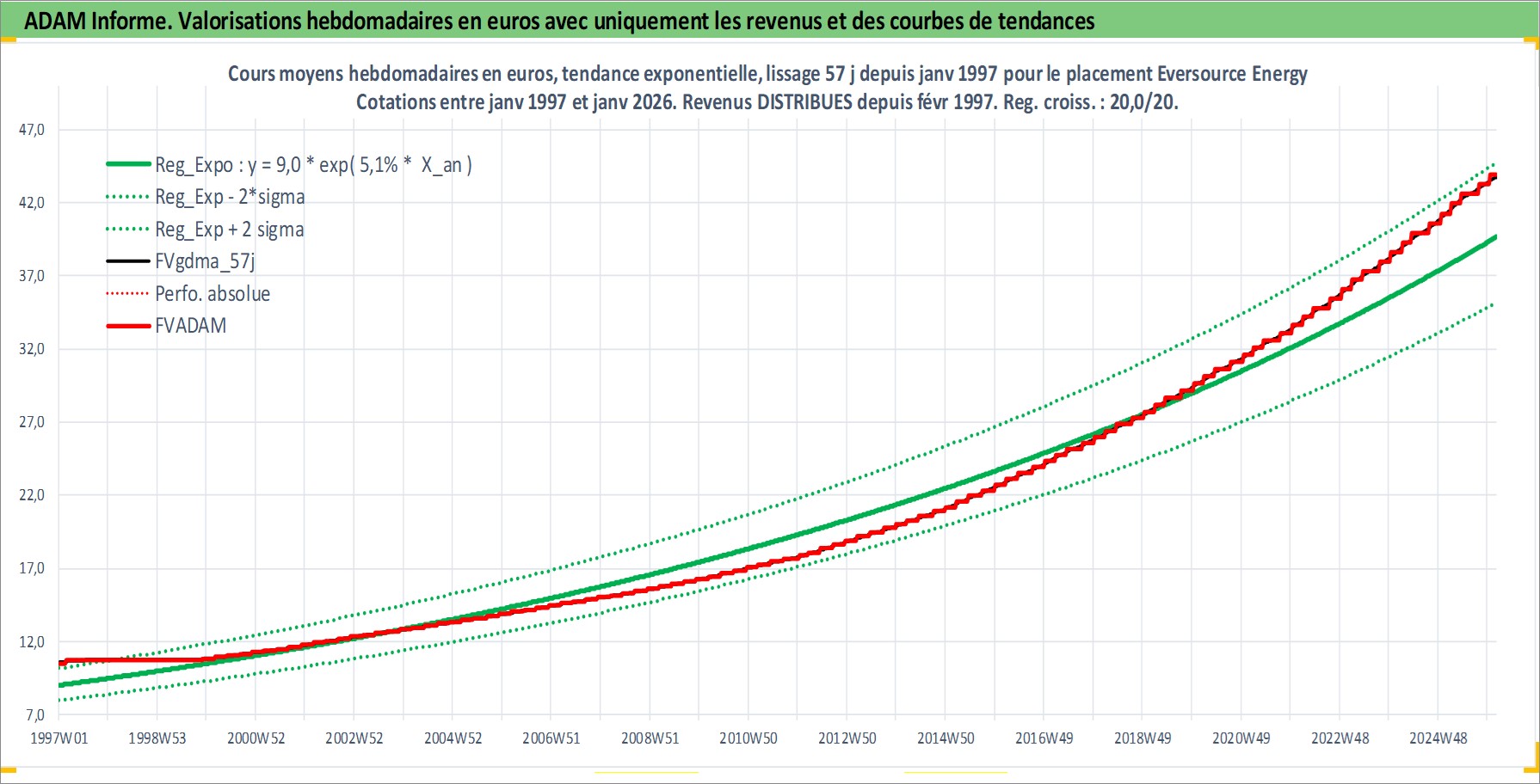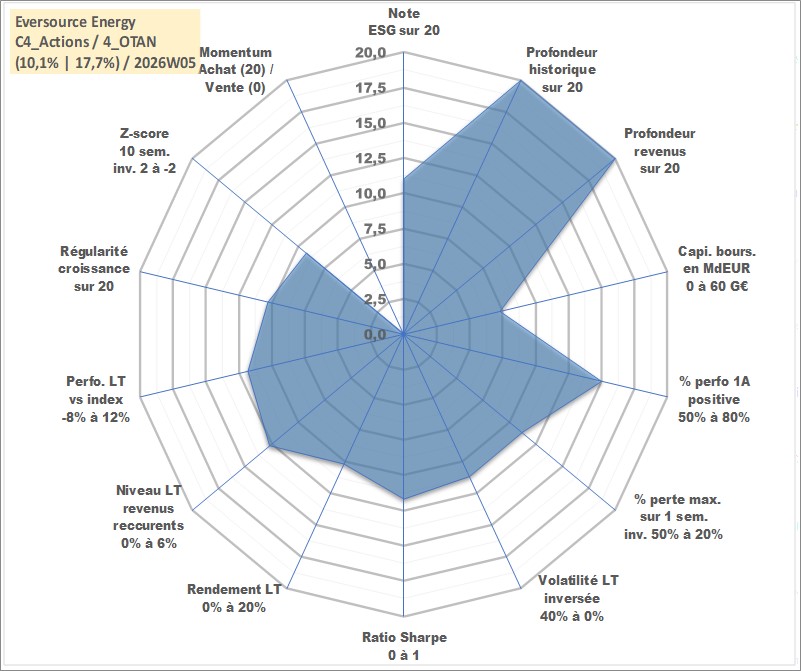 Site dédié aux investisseursPage dédiée sur site financeAnalyse des valorisations hebdomadaires de l'action Eversource Energy. Cet actif est cote en USD. Les valorisations sont en contrevaleur EURO et couvrent les semaines 1997W01 a 2026W05. Les revenus de cet actif financier sont pris en compte depuis la semaine 1997W09. La note globale ESG de cet actif est estimee a 11.0 (apres rebasage entre 0 et 20).