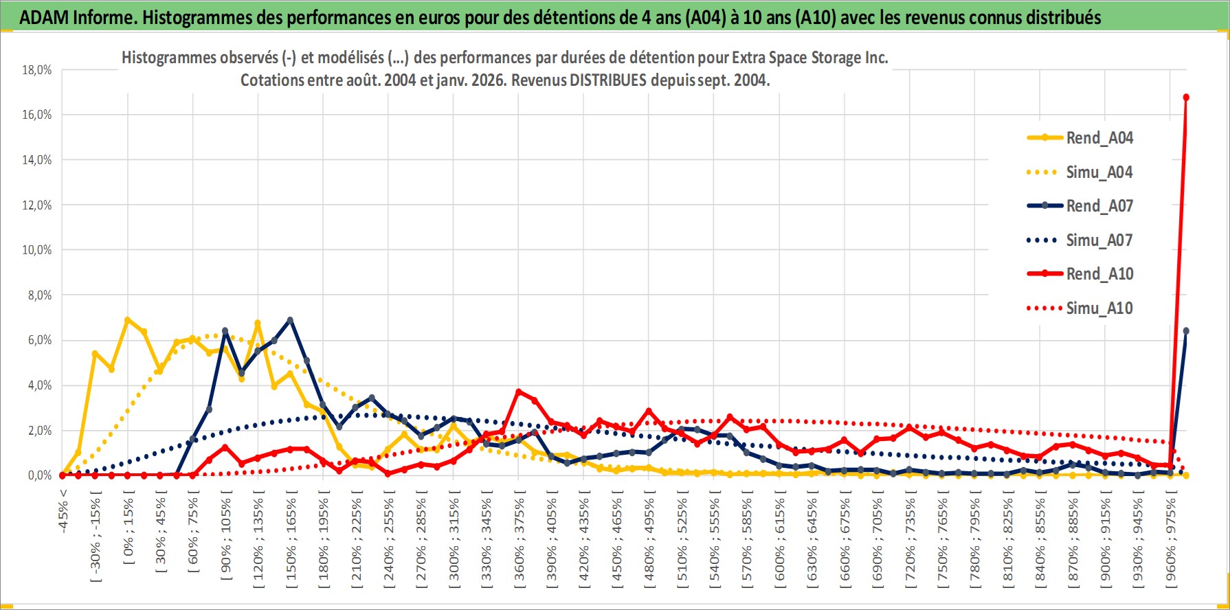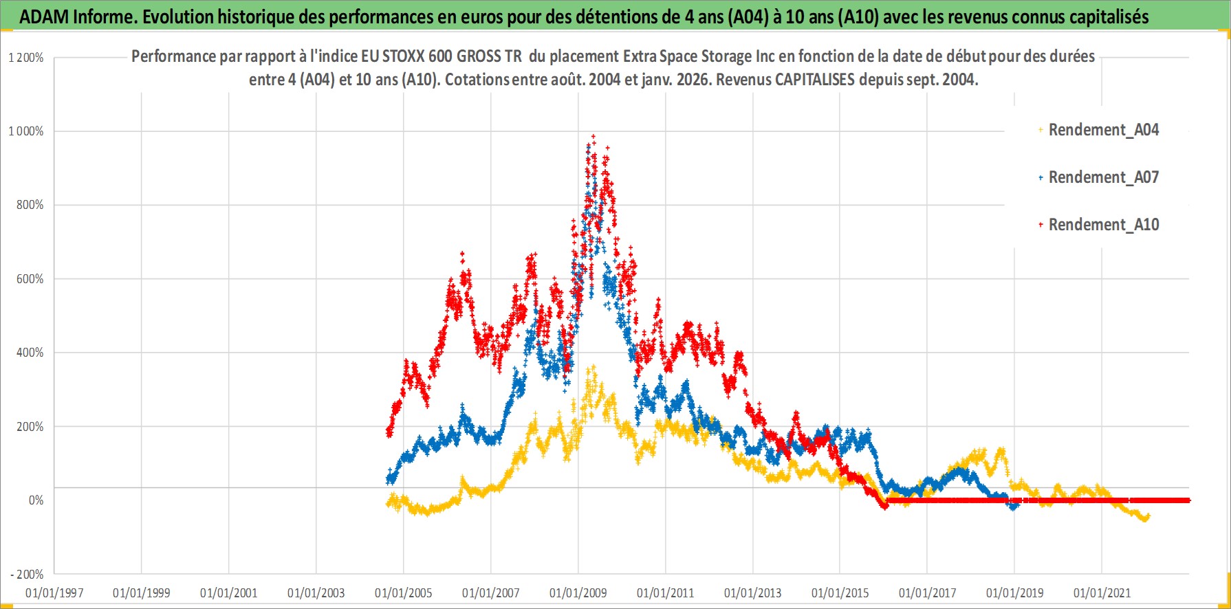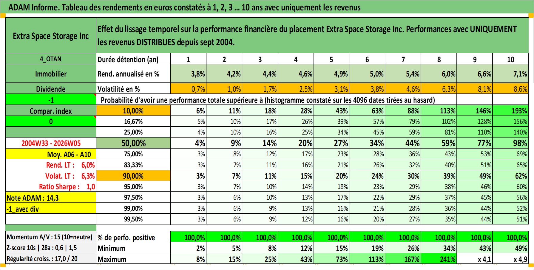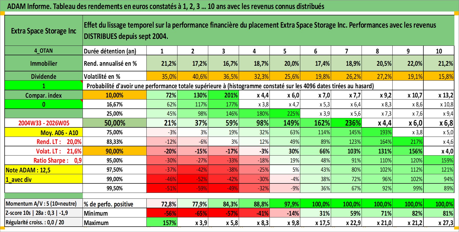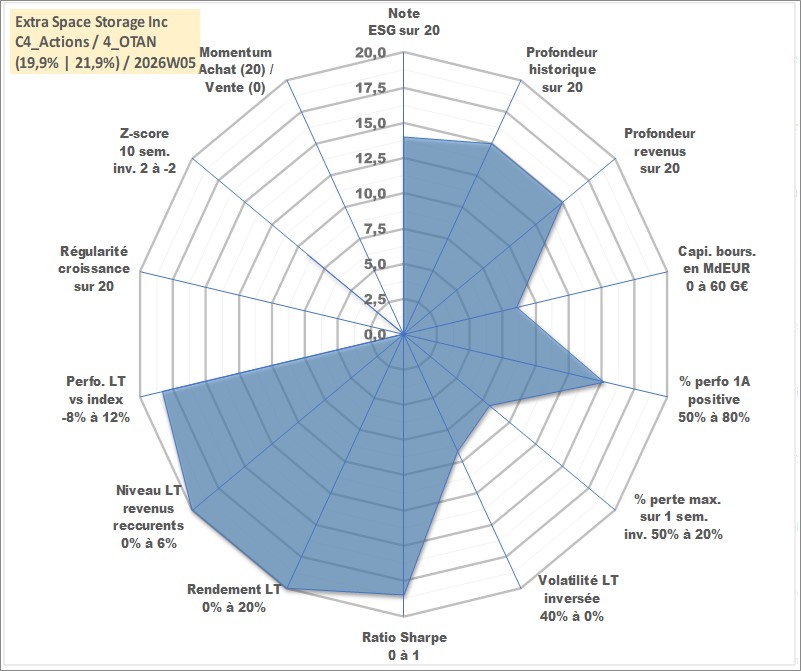 Site dédié aux investisseursPage dédiée sur site financeAnalyse des valorisations hebdomadaires de l'action Extra Space Storage Inc. Cet actif est cote en USD. Les valorisations sont en contrevaleur EURO et couvrent les semaines 2004W33 a 2026W05. Les revenus de cet actif financier sont pris en compte depuis la semaine 2004W38. La note globale ESG de cet actif est estimee a 14.0 (apres rebasage entre 0 et 20).