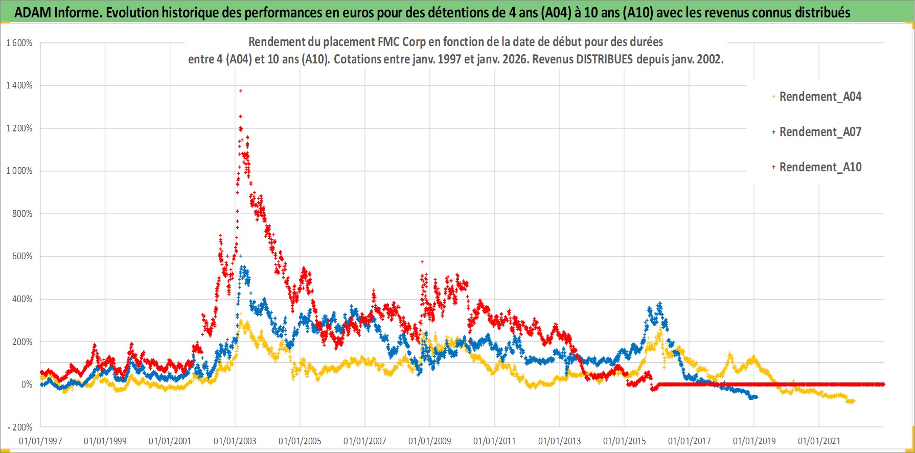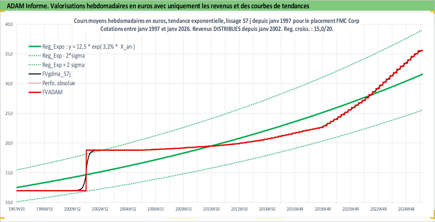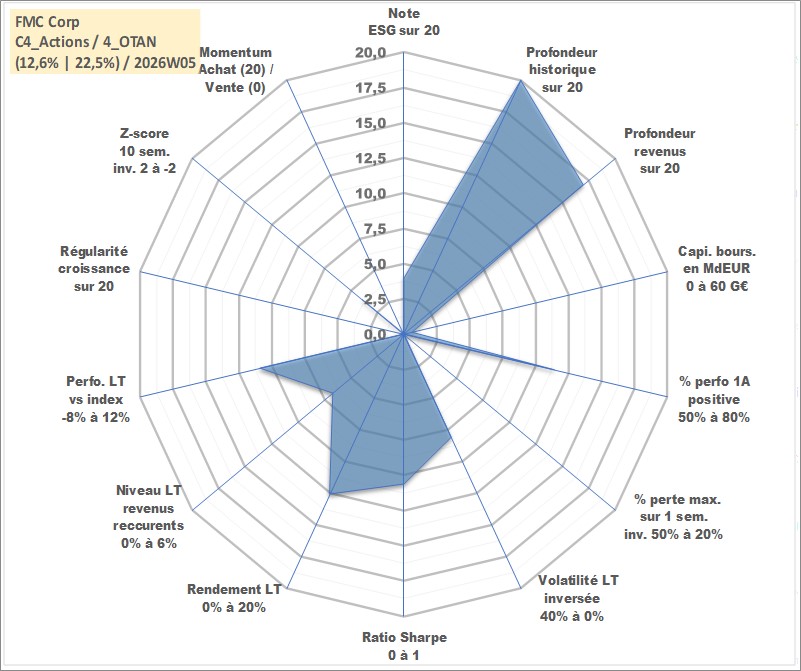 Site dédié aux investisseursPage dédiée sur site financeAnalyse des valorisations hebdomadaires de l'action FMC Corp. Cet actif est cote en USD. Les valorisations sont en contrevaleur EURO et couvrent les semaines 1997W01 a 2026W05. Les revenus de cet actif financier sont pris en compte depuis la semaine 2002W01. La note globale ESG de cet actif est estimee a 4.0 (apres rebasage entre 0 et 20).